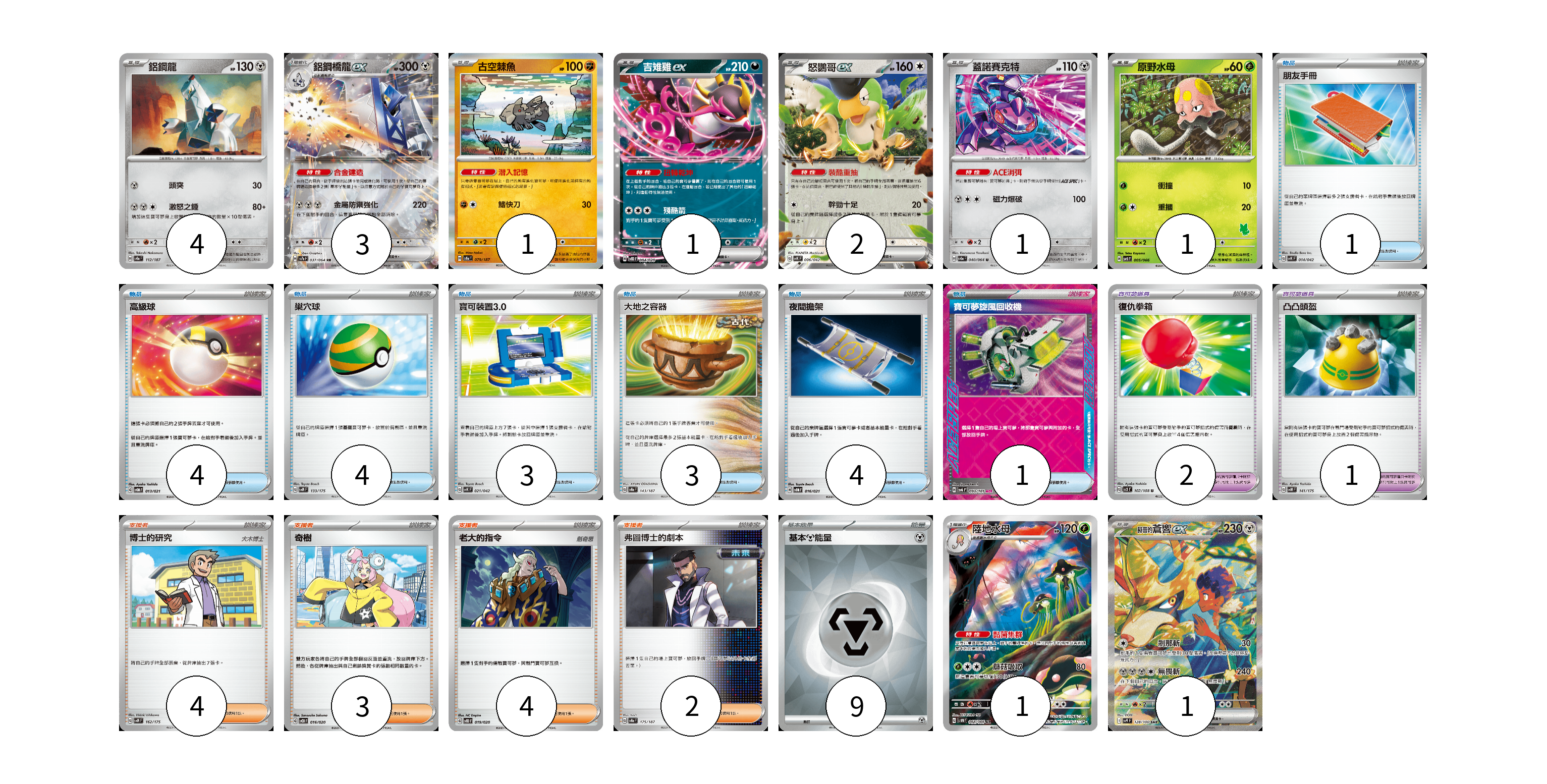 牌組構築方案 以此牌組為基礎新構築牌組 顯示卡面 顯示列表 寶可夢卡(15) 4 3 1 1 2 1 1 1 1 寶可夢道具(3) 2 1 物品卡(20) 1 4 4 3 3 4 1 支援者卡(13) 4 3 4 2 能量卡(9) 9 寶可夢卡(15) 卡牌名稱 張數 卡牌名稱 張數 鋁鋼龍 SV8a 112/187 04 鋁鋼橋龍ex SV7a 037/064 03 古空棘魚 SV8a 079/187 01 吉雉雞ex SVOD 004/020 01 怒鸚哥ex SVK 006/042 02 蓋諾賽克特 SV6a 040/064 01 原野水母 SVI 005/066 01 陸地水母 SV4M 068/066 01 赫普的蒼響ex SV9 128/100 01 寶可夢道具(3) 卡牌名稱 張數 卡牌名稱 張數 復仇拳箱 SV3 102/108 02 凸凸頭盔 SVM 141/175 01 物品卡(20) 卡牌名稱 張數 卡牌名稱 張數 朋友手冊 SVK 014/042 01 高級球 SVOM 013/021 04 巢穴球 SVM 133/175 04 寶可裝置3.0 SVK 021/042 03 大地之容器 SV8a 143/187 03 夜間擔架 SVOM 016/021 04 寶可夢旋風回收機 SV6 093/101 01 支援者卡(13) 卡牌名稱 張數 卡牌名稱 張數 博士的研究 SVM 162/175 04 奇樹 SVOD 016/020 03 老大的指令 SVOD 019/020 04 弗圖博士的劇本 SV8a 175/187 02 能量卡(9) 卡牌名稱 張數 卡牌名稱 張數 基本【鋼】能量 SVOD MET 09 以此牌組為基礎新構築牌組 牌組編碼 tycaOW-eBUnnZ-AdLEMx copy 列印牌組單 牌組編碼已複製 分享至SNS