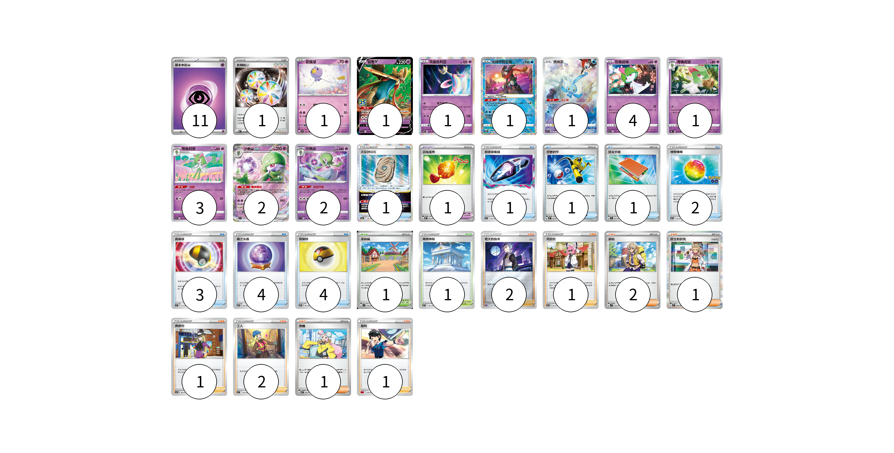 牌組構築方案 以此牌組為基礎新構築牌組 顯示卡面 顯示列表 寶可夢卡(17) 1 1 1 1 1 4 1 3 2 2 寶可夢道具(2) 1 1 物品卡(16) 1 1 1 2 3 4 4 支援者卡(11) 2 1 2 1 1 2 1 1 競技場卡(2) 1 1 能量卡(12) 11 1 寶可夢卡(17) 卡牌名稱 張數 卡牌名稱 張數 飄飄球 SV1S 029/078 01 蒼響V S8a 018/028 01 克雷色利亞 S10D 028/067 01 光輝甲賀忍蛙 S12a 033/172 01 瑪納霏 S12a 178/172 01 拉魯拉絲 S11a 036/068 04 奇魯莉安 S6H 034/070 01 奇魯莉安 S11a 037/068 03 沙奈朵ex SV1S 028/078 02 沙奈朵 SI 177/414 02 寶可夢道具(2) 卡牌名稱 張數 卡牌名稱 張數 天空封印石 S12a 146/172 01 勇氣護符 SV2D 067/071 01 物品卡(16) 卡牌名稱 張數 卡牌名稱 張數 放逐吸塵器 S11 093/100 01 厲害釣竿 SV2P 066/071 01 朋友手冊 SV1S 069/078 01 神奇糖果 S10b 066/071 02 高級球 SK 015/030 03 霧之水晶 S6K 060/070 04 等級球 S5R 063/070 04 支援者卡(11) 卡牌名稱 張數 卡牌名稱 張數 老大的指令(赤日) SPD 020/020 02 克拉拉 S5a 067/070 01 派帕 SV1V 076/078 02 博士的研究(奧琳博士) SV1S 076/078 01 賽寶利 S5a 068/070 01 工人 S12 093/098 02 奇樹 SV2D 069/071 01 裁判 SDL 018/021 01 競技場卡(2) 卡牌名稱 張數 卡牌名稱 張數 深缽鎮 SV1a 070/073 01 神奧神殿 S10P 067/067 01 能量卡(12) 卡牌名稱 張數 卡牌名稱 張數 基本【超】能量 SVB PSY 11 反轉能量 SV2P 071/071 01 以此牌組為基礎新構築牌組 牌組編碼 tzWOZf-zrycTc-zLRpsl copy 列印牌組單 牌組編碼已複製 分享至SNS