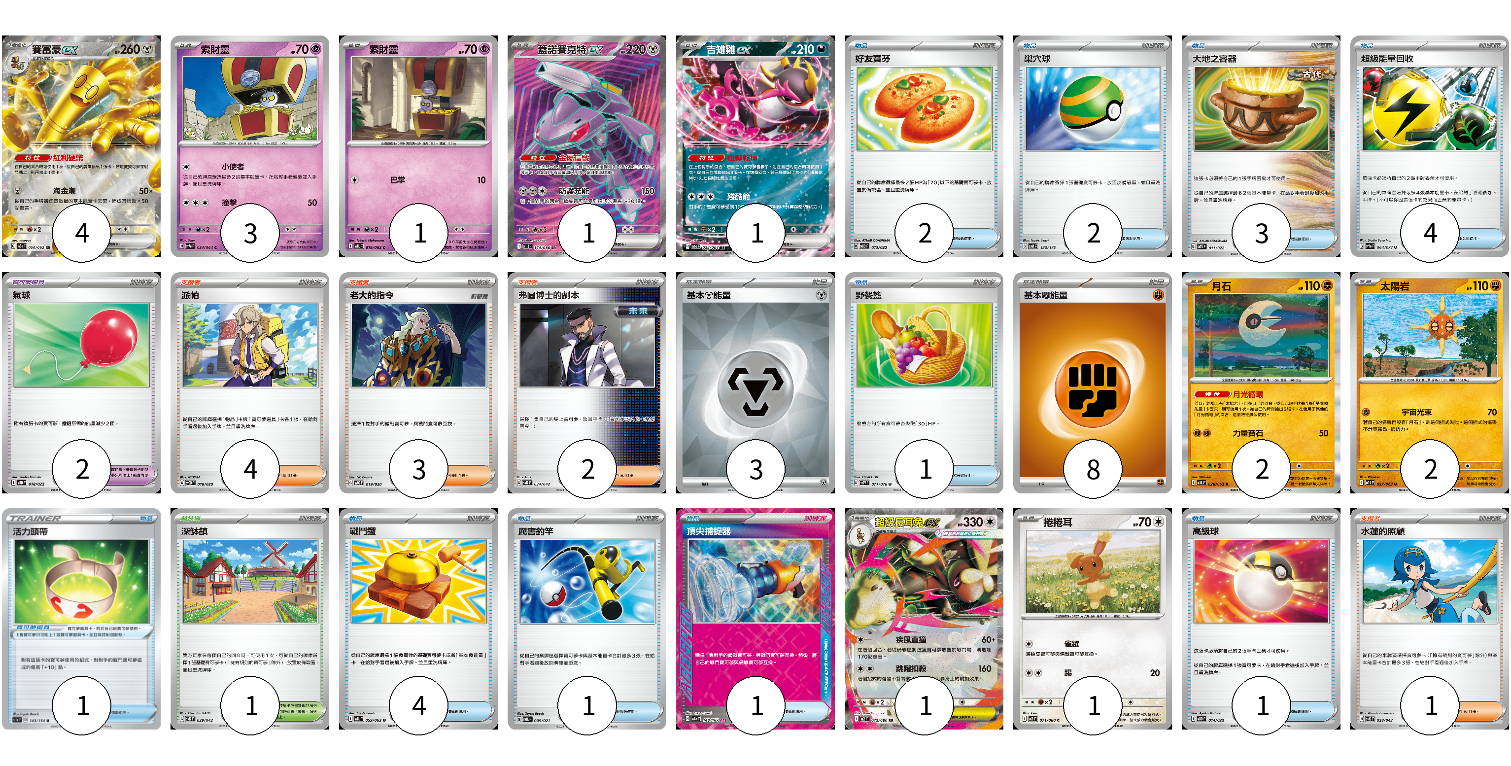 牌組構築方案 以此牌組為基礎新構築牌組 顯示卡面 顯示列表 寶可夢卡(16) 4 3 1 1 1 2 2 1 1 寶可夢道具(3) 2 1 物品卡(19) 2 2 3 4 1 4 1 1 1 支援者卡(10) 4 3 2 1 競技場卡(1) 1 能量卡(11) 3 8 寶可夢卡(16) 卡牌名稱 張數 卡牌名稱 張數 賽富豪ex SV3a 050/062 04 索財靈 SV7a 024/064 03 索財靈 M1L 019/063 01 蓋諾賽克特ex SV11B 164/086 01 吉雉雞ex SV6a 038/064 01 月石 M1L 026/063 02 太陽岩 M1L 027/063 02 超級長耳兔ex M2 072/080 01 捲捲耳 M2 071/080 01 寶可夢道具(3) 卡牌名稱 張數 卡牌名稱 張數 氣球 MBD 018/022 02 活力頭帶 SC1a 143/154 01 物品卡(19) 卡牌名稱 張數 卡牌名稱 張數 好友寶芬 MBD 013/022 02 巢穴球 SVM 133/175 02 大地之容器 SVTS 011/022 03 超級能量回收 SV1a 064/073 04 野餐籃 SV1V 071/078 01 戰鬥鑼 M1L 059/063 04 厲害釣竿 SVTL 009/021 01 頂尖捕捉器 SV8a 148/187 01 高級球 MBD 014/022 01 支援者卡(10) 卡牌名稱 張數 卡牌名稱 張數 派帕 SVOD 018/020 04 老大的指令 SVOD 019/020 03 弗圖博士的劇本 SVK 034/042 02 水蓮的照顧 SVK 028/042 01 競技場卡(1) 卡牌名稱 張數 卡牌名稱 張數 深缽鎮 SVK 039/042 01 能量卡(11) 卡牌名稱 張數 卡牌名稱 張數 基本【鋼】能量 SVOD MET 03 基本鬥能量 sv-p FIG 08 以此牌組為基礎新構築牌組 牌組編碼 tzfqXt-lTWIxh-qUuUlB copy 列印牌組單 牌組編碼已複製 分享至SNS