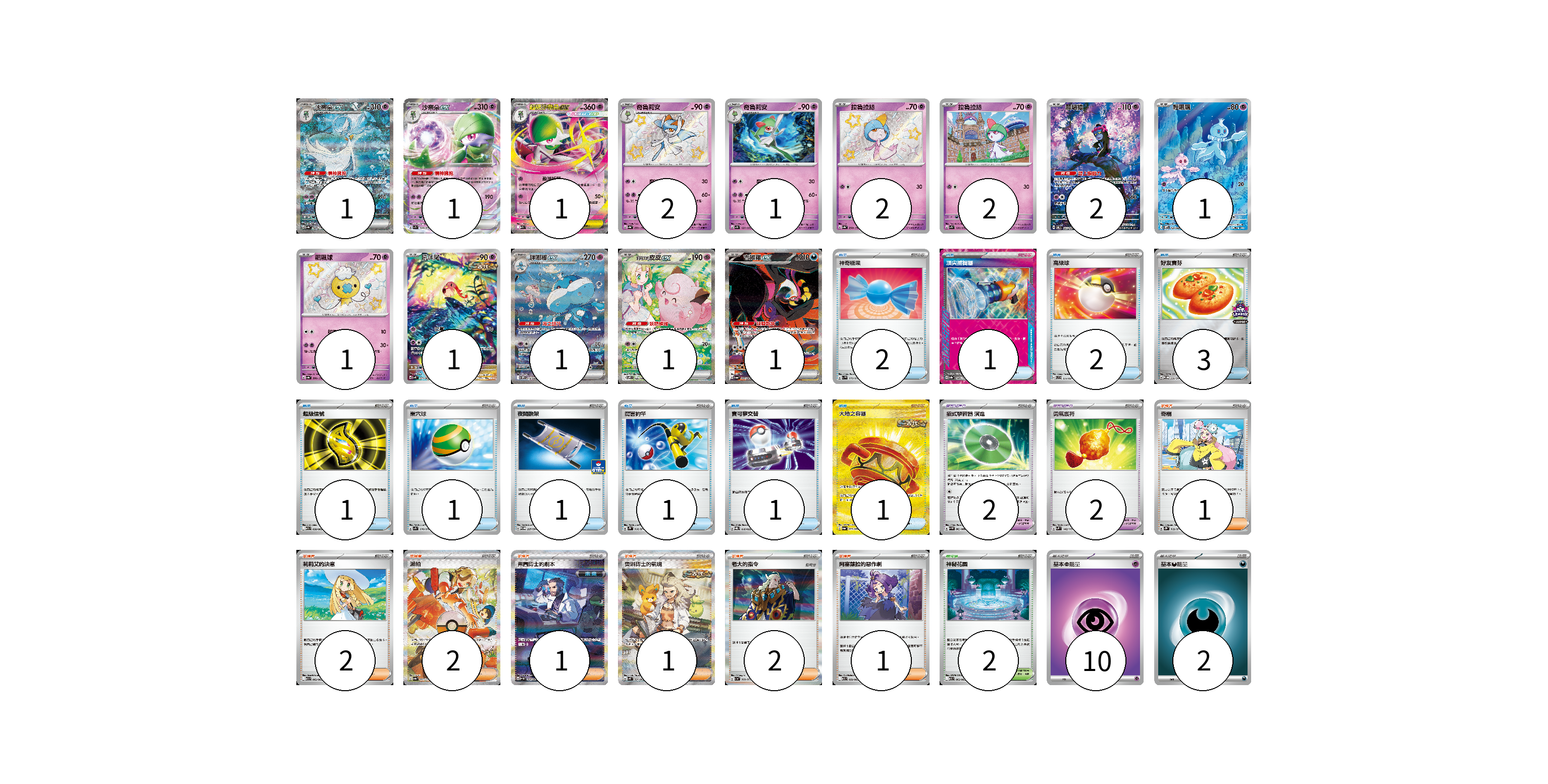 牌組構築方案 以此牌組為基礎新構築牌組 顯示卡面 顯示列表 寶可夢卡(18) 1 1 1 2 1 2 2 2 1 1 1 1 1 1 寶可夢道具(4) 2 2 物品卡(14) 2 1 2 3 1 1 1 1 1 1 支援者卡(10) 1 2 2 1 1 2 1 競技場卡(2) 2 能量卡(12) 10 2 寶可夢卡(18) 卡牌名稱 張數 卡牌名稱 張數 沙奈朵ex SV4a 348/190 01 沙奈朵ex SV1S 028/078 01 超級沙奈朵ex M1S 042/063 01 奇魯莉安 SV4a 259/190 02 奇魯莉安 SV1S 027/078 01 拉魯拉絲 SV4a 258/190 02 拉魯拉絲 SV1S 026/078 02 願增猿 SV6 107/101 02 輕飄飄 SV11W 124/086 01 飄飄球 SV4a 260/190 01 吼叫尾 SV4K 071/066 01 胖嘟嘟ex SV11W 170/086 01 莉莉艾的皮皮ex SV9 126/100 01 吉雉雞ex SV6a 089/064 01 寶可夢道具(4) 卡牌名稱 張數 卡牌名稱 張數 招式學習器 演進 SV4M 063/066 02 勇氣護符 SVM 142/175 02 物品卡(14) 卡牌名稱 張數 卡牌名稱 張數 神奇糖果 SV1V 072/078 02 頂尖捕捉器 SV8a 148/187 01 高級球 SVC 014/021 02 好友寶芬 SV-P 230/SV-P 03 超級信號 M1S 058/063 01 巢穴球 SV1S 070/078 01 夜間擔架 SV-P 227/SV-P 01 厲害釣竿 SV2P 066/071 01 寶可夢交替 SVQL 016/022 01 大地之容器 SV6a 093/064 01 支援者卡(10) 卡牌名稱 張數 卡牌名稱 張數 奇樹 SV2D 069/071 01 莉莉艾的決意 M1L 062/063 02 派帕 SV4a 353/190 02 弗圖博士的劇本 SV4M 091/066 01 奧琳博士的氣魄 SV4K 091/066 01 老大的指令 SV1a 069/073 02 阿塞蘿拉的惡作劇 M1S 059/063 01 競技場卡(2) 卡牌名稱 張數 卡牌名稱 張數 神秘花園 M1S 063/063 02 能量卡(12) 卡牌名稱 張數 卡牌名稱 張數 基本超能量 sv-p PSY 10 基本惡能量 sv-p DAR 02 以此牌組為基礎新構築牌組 牌組編碼 uAbrVD-uEJpTA-mYEZiA copy 列印牌組單 牌組編碼已複製 分享至SNS