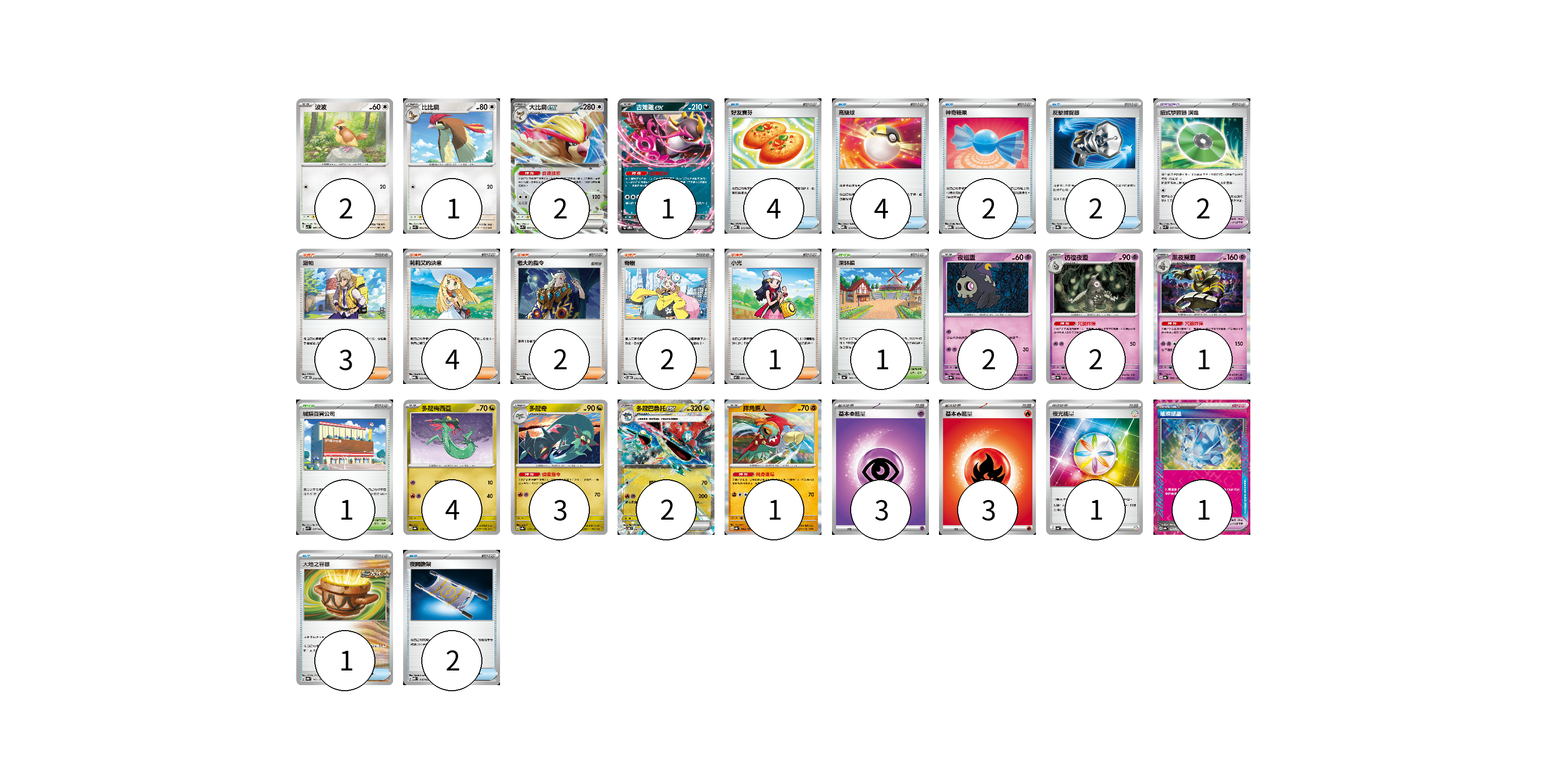 牌組構築方案 以此牌組為基礎新構築牌組 顯示卡面 顯示列表 寶可夢卡(21) 2 1 2 1 2 2 1 4 3 2 1 寶可夢道具(3) 2 1 物品卡(15) 4 4 2 2 1 2 支援者卡(12) 3 4 2 2 1 競技場卡(2) 1 1 能量卡(7) 3 3 1 寶可夢卡(21) 卡牌名稱 張數 卡牌名稱 張數 波波 SV3 087/108 02 比比鳥 SVK 004/042 01 大比鳥ex SVK 005/042 02 吉雉雞ex SVOD 004/020 01 夜巡靈 SV8a 064/187 02 彷徨夜靈 SV8a 065/187 02 黑夜魔靈 SV8a 066/187 01 多龍梅西亞 SV8a 118/187 04 多龍奇 SV8a 119/187 03 多龍巴魯托ex SV6 081/101 02 摔角鷹人 SV8a 084/187 01 寶可夢道具(3) 卡牌名稱 張數 卡牌名稱 張數 招式學習器 演進 SVK 025/042 02 璀璨結晶 SV8a 152/187 01 物品卡(15) 卡牌名稱 張數 卡牌名稱 張數 好友寶芬 MBD 013/022 04 高級球 MBD 014/022 04 神奇糖果 MBG 013/022 02 反擊捕捉器 SV8a 139/187 02 大地之容器 SV8a 143/187 01 夜間擔架 MBD 016/022 02 支援者卡(12) 卡牌名稱 張數 卡牌名稱 張數 派帕 SVOD 018/020 03 莉莉艾的決意 MBG 022/022 04 老大的指令 MBG 021/022 02 奇樹 SVOD 016/020 02 小光 M2 077/080 01 競技場卡(2) 卡牌名稱 張數 卡牌名稱 張數 深缽鎮 SV4a 185/190 01 城鎮百貨公司 SVK 037/042 01 能量卡(7) 卡牌名稱 張數 卡牌名稱 張數 基本【超】能量 MBD PSY 03 基本【火】能量 M-P FIR 03 夜光能量 SV4a 190/190 01 以此牌組為基礎新構築牌組 牌組編碼 uBzFMH-UanLYW-vrczZh copy 列印牌組單 牌組編碼已複製 分享至SNS