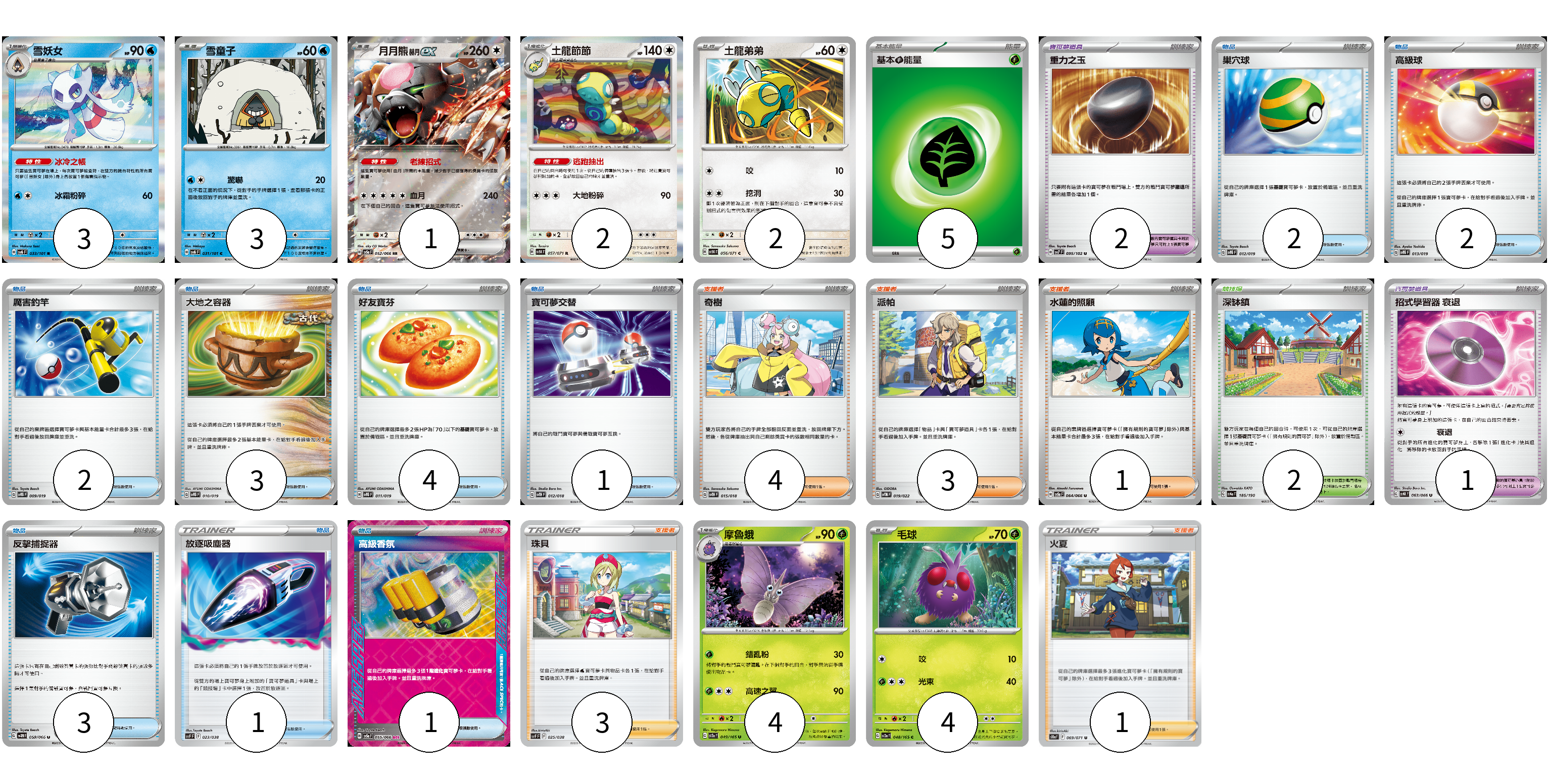 牌組構築方案 以此牌組為基礎新構築牌組 顯示卡面 顯示列表 寶可夢卡(19) 3 3 1 2 2 4 4 寶可夢道具(3) 2 1 物品卡(19) 2 2 2 3 4 1 3 1 1 支援者卡(12) 4 3 1 3 1 競技場卡(2) 2 能量卡(5) 5 寶可夢卡(19) 卡牌名稱 張數 卡牌名稱 張數 雪妖女 SV6 033/101 03 雪童子 SV6 031/101 03 月月熊 赫月 ex SV5a 052/066 01 土龍節節 SV5K 057/071 02 土龍弟弟 SV5K 056/071 02 摩魯蛾 SV2a 049/165 04 毛球 SV2a 048/165 04 寶可夢道具(3) 卡牌名稱 張數 卡牌名稱 張數 重力之玉 SV7 095/102 02 招式學習器 衰退 SV4K 063/066 01 物品卡(19) 卡牌名稱 張數 卡牌名稱 張數 巢穴球 SVTG 012/019 02 高級球 SVTG 013/019 02 厲害釣竿 SVTG 009/019 02 大地之容器 SVTG 010/019 03 好友寶芬 SVTG 011/019 04 寶可夢交替 SVTH 012/018 01 反擊捕捉器 SV4M 059/066 03 放逐吸塵器 SVF 023/038 01 高級香氛 SV5a 055/066 01 支援者卡(12) 卡牌名稱 張數 卡牌名稱 張數 奇樹 SVTH 015/018 04 派帕 SVTM 019/022 03 水蓮的照顧 SV5a 064/066 01 珠貝 SVF 025/038 03 火夏 S10a 069/071 01 競技場卡(2) 卡牌名稱 張數 卡牌名稱 張數 深缽鎮 SV4a 185/190 02 能量卡(5) 卡牌名稱 張數 卡牌名稱 張數 基本【草】能量 SVF GRA 05 以此牌組為基礎新構築牌組 牌組編碼 uChGLu-fNTceg-qaicta copy 列印牌組單 牌組編碼已複製 分享至SNS