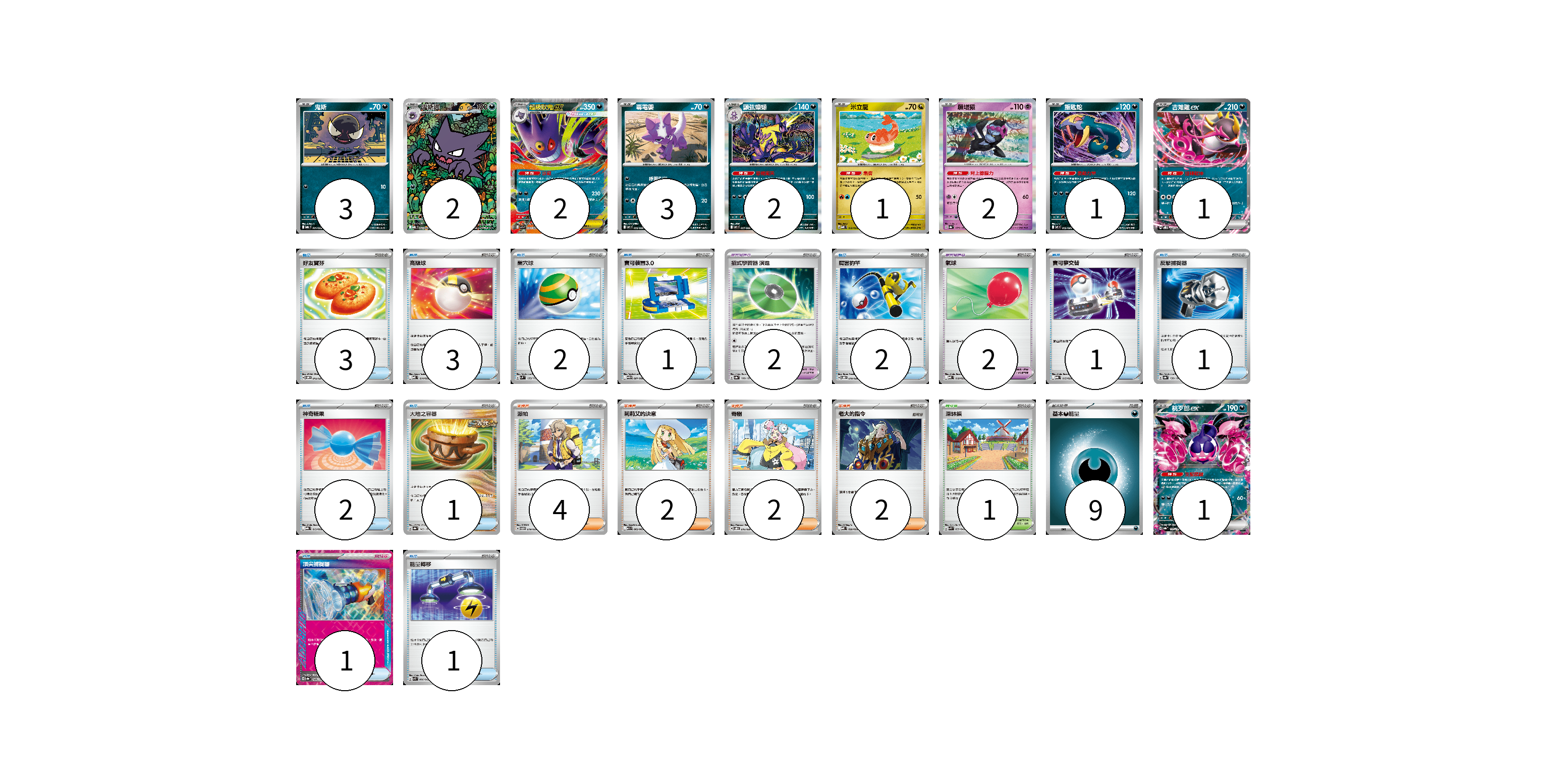 牌組構築方案 以此牌組為基礎新構築牌組 顯示卡面 顯示列表 寶可夢卡(18) 3 2 2 3 2 1 2 1 1 1 寶可夢道具(4) 2 2 物品卡(18) 3 3 2 1 2 1 1 2 1 1 1 支援者卡(10) 4 2 2 2 競技場卡(1) 1 能量卡(9) 9 寶可夢卡(18) 卡牌名稱 張數 卡牌名稱 張數 鬼斯 MBG 001/022 03 鬼斯通 MBG 023/022 02 超級耿鬼ex MBG 003/022 02 毒電嬰 M2 056/080 03 顫弦蠑螈 M2 057/080 02 米立龍 MBD 010/022 01 願增猿 SV8a 075/187 02 飯匙蛇 M2 052/080 01 吉雉雞ex SVOD 004/020 01 桃歹郎ex SV8a 105/187 01 寶可夢道具(4) 卡牌名稱 張數 卡牌名稱 張數 招式學習器 演進 SV8a 160/187 02 氣球 MBD 018/022 02 物品卡(18) 卡牌名稱 張數 卡牌名稱 張數 好友寶芬 SVOM 012/021 03 高級球 MBD 014/022 03 巢穴球 SVM 133/175 02 寶可裝置3.0 SV11B 081/086 01 厲害釣竿 SVOD 010/020 02 寶可夢交替 MBG 015/022 01 反擊捕捉器 SV8a 139/187 01 神奇糖果 MBG 013/022 02 大地之容器 SV8a 143/187 01 頂尖捕捉器 SV8a 148/187 01 能量轉移 SVK 008/042 01 支援者卡(10) 卡牌名稱 張數 卡牌名稱 張數 派帕 SVTM 019/022 04 莉莉艾的決意 M1L 062/063 02 奇樹 SVOD 016/020 02 老大的指令 MBD 020/022 02 競技場卡(1) 卡牌名稱 張數 卡牌名稱 張數 深缽鎮 SVK 039/042 01 能量卡(9) 卡牌名稱 張數 卡牌名稱 張數 基本【惡】能量 MBG DAR 09 以此牌組為基礎新構築牌組 牌組編碼 uDZRKv-Xwafqc-EOhuUC copy 列印牌組單 牌組編碼已複製 分享至SNS