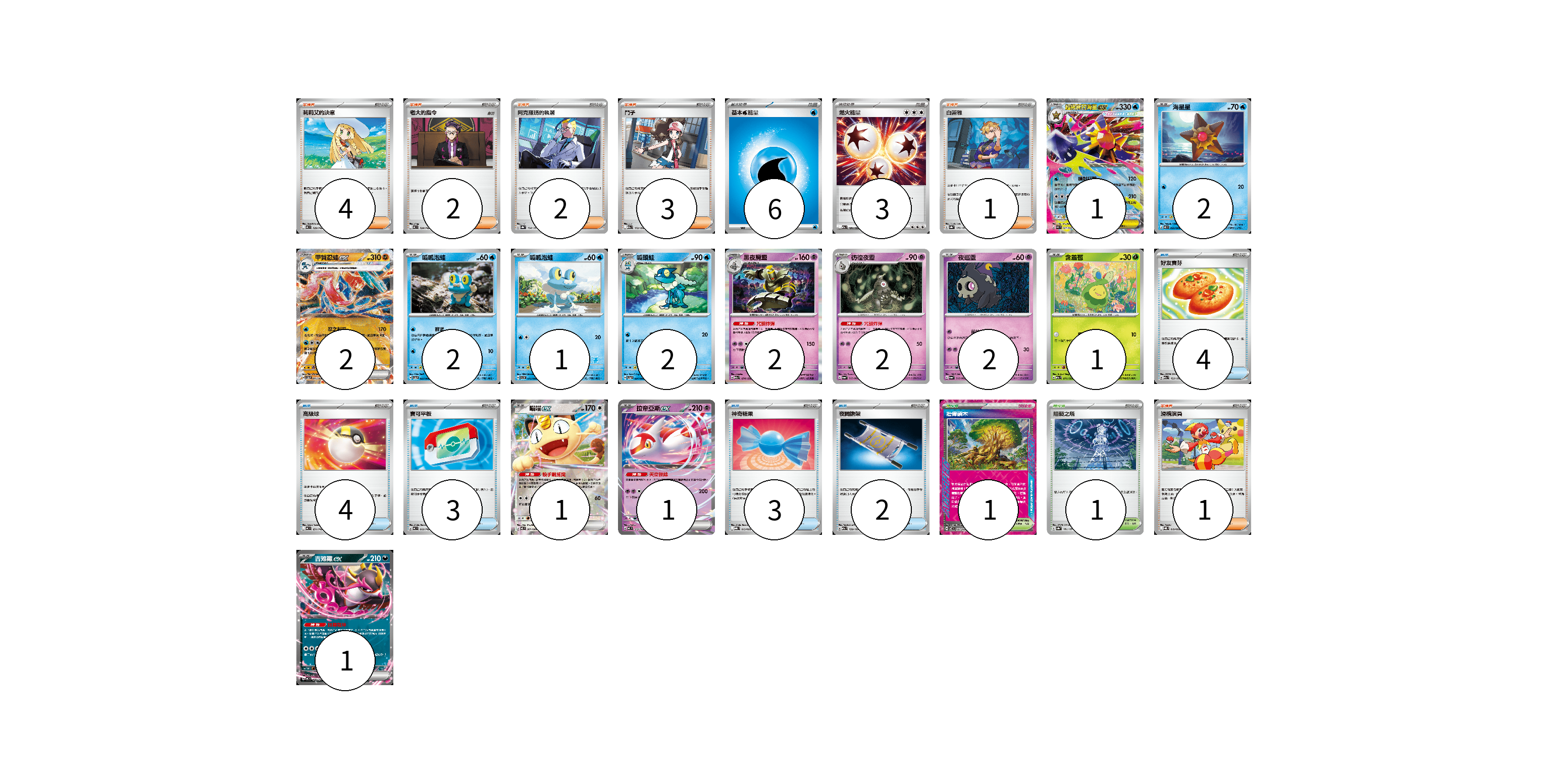 牌組構築方案 以此牌組為基礎新構築牌組 顯示卡面 顯示列表 寶可夢卡(20) 1 2 2 2 1 2 2 2 2 1 1 1 1 物品卡(16) 4 4 3 3 2 支援者卡(13) 4 2 2 3 1 1 競技場卡(2) 1 1 能量卡(9) 6 3 寶可夢卡(20) 卡牌名稱 張數 卡牌名稱 張數 超級寶石海星ex M3 021/080 01 海星星 M3 020/080 02 甲賀忍蛙ex SV5a 045/066 02 呱呱泡蛙 SV5a 023/066 02 呱呱泡蛙 SVI 015/066 01 呱頭蛙 SV5a 024/066 02 黑夜魔靈 M2a 074/193 02 彷徨夜靈 SV6a 019/064 02 夜巡靈 SV6a 018/064 02 含羞苞 M2a 011/193 01 喵喵ex M3 061/080 01 拉帝亞斯ex MC 312/742 01 吉雉雞ex MC 489/742 01 物品卡(16) 卡牌名稱 張數 卡牌名稱 張數 好友寶芬 M2a 153/193 04 高級球 MC 651/742 04 寶可平板 MC 662/742 03 神奇糖果 MBG 013/022 03 夜間擔架 M2a 159/193 02 支援者卡(13) 卡牌名稱 張數 卡牌名稱 張數 莉莉艾的決意 MC 729/742 04 老大的指令 MC 724/742 02 阿克羅瑪的執著 SV8a 164/187 02 鬥子 M2a 172/193 03 白蕾雅 SV8a 176/187 01 滑稽演員 SVQL 019/022 01 競技場卡(2) 卡牌名稱 張數 卡牌名稱 張數 壯偉碩木 SV7 101/102 01 阻礙之塔 SV8a 181/187 01 能量卡(9) 卡牌名稱 張數 卡牌名稱 張數 基本【水】能量 MC WAT 06 燃火能量 M2a 191/193 03 以此牌組為基礎新構築牌組 牌組編碼 uFCYLy-CPDqHy-WitIMp copy 列印牌組單 牌組編碼已複製 分享至SNS
