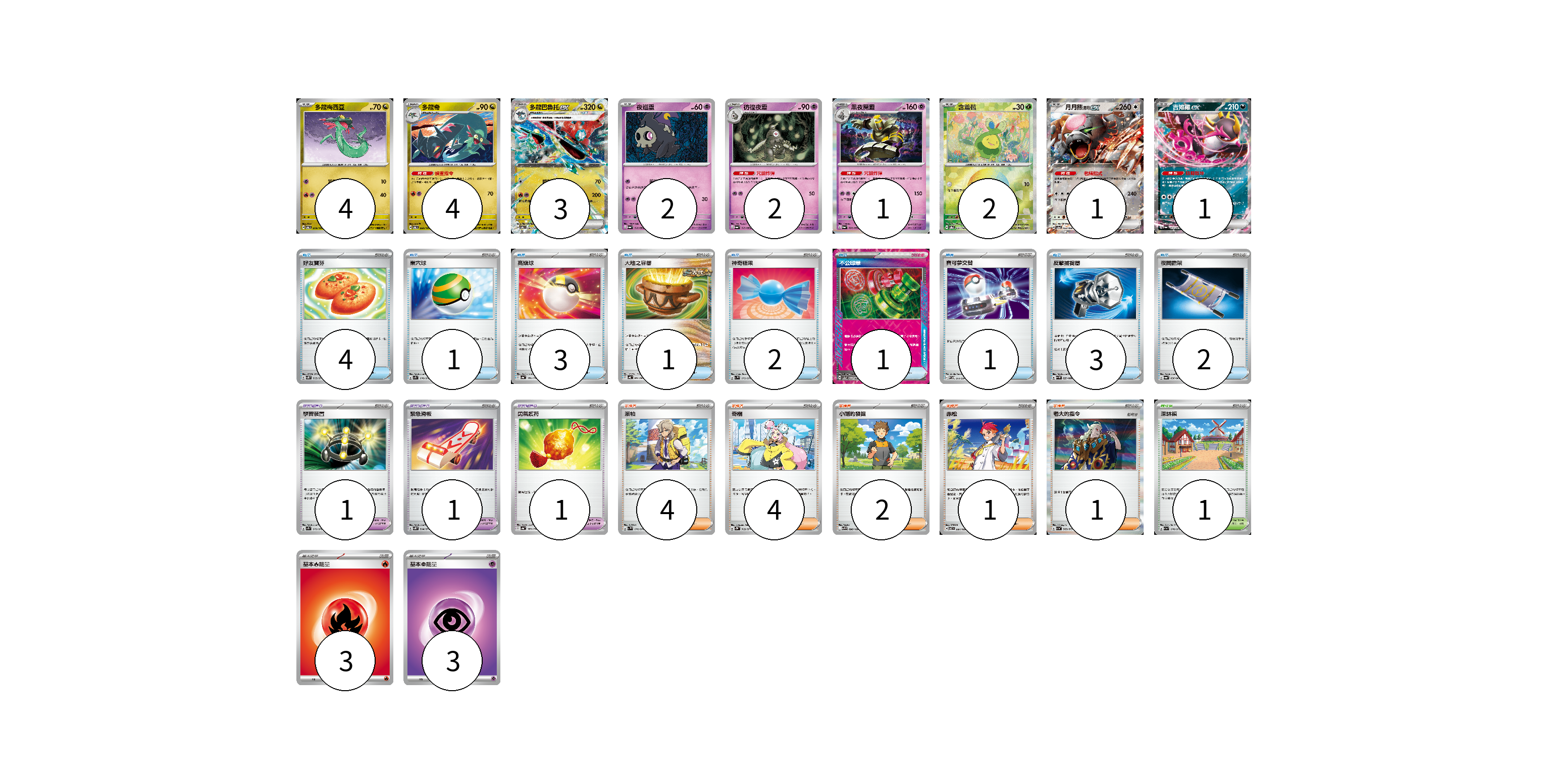 牌組構築方案 以此牌組為基礎新構築牌組 顯示卡面 顯示列表 寶可夢卡(20) 4 4 3 2 2 1 2 1 1 寶可夢道具(3) 1 1 1 物品卡(18) 4 1 3 1 2 1 1 3 2 支援者卡(12) 4 4 2 1 1 競技場卡(1) 1 能量卡(6) 3 3 寶可夢卡(20) 卡牌名稱 張數 卡牌名稱 張數 多龍梅西亞 SV6 079/101 04 多龍奇 SV6 080/101 04 多龍巴魯托ex SV6 081/101 03 夜巡靈 SV6a 018/064 02 彷徨夜靈 SV6a 019/064 02 黑夜魔靈 SV6a 020/064 01 含羞苞 SV8a 001/187 02 月月熊 赫月 ex SV5a 052/066 01 吉雉雞ex SV6a 038/064 01 寶可夢道具(3) 卡牌名稱 張數 卡牌名稱 張數 學習裝置 SV1S 072/078 01 緊急滑板 SV5K 064/071 01 勇氣護符 SV4a 169/190 01 物品卡(18) 卡牌名稱 張數 卡牌名稱 張數 好友寶芬 SV5K 063/071 04 巢穴球 SV1S 070/078 01 高級球 SV4a 161/190 03 大地之容器 SV4K 060/066 01 神奇糖果 SV1V 072/078 02 不公印章 SV5a 053/066 01 寶可夢交替 SV-P 014/SV-P 01 反擊捕捉器 SV4M 059/066 03 夜間擔架 SV6a 056/064 02 支援者卡(12) 卡牌名稱 張數 卡牌名稱 張數 派帕 SV1V 076/078 04 奇樹 SV2D 069/071 04 小剛的發掘 SV9 096/100 02 赤松 SV7 097/102 01 老大的指令 SV1a 069/073 01 競技場卡(1) 卡牌名稱 張數 卡牌名稱 張數 深缽鎮 SV1a 070/073 01 能量卡(6) 卡牌名稱 張數 卡牌名稱 張數 基本火能量 sv-p FIR 03 基本超能量 sv-p PSY 03 以此牌組為基礎新構築牌組 牌組編碼 uFGaeJ-DqaSwv-xTTRcy copy 列印牌組單 牌組編碼已複製 分享至SNS