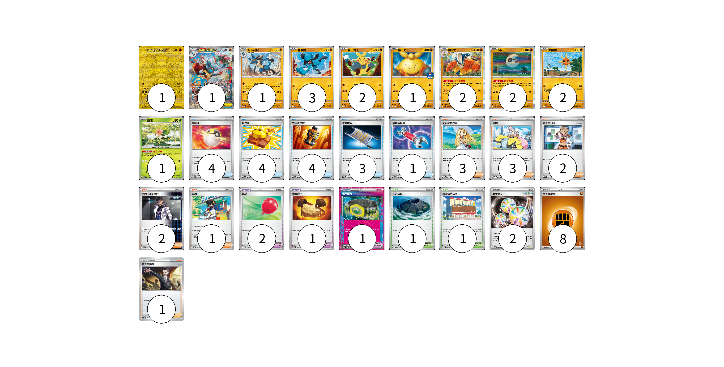 牌組構築方案 以此牌組為基礎新構築牌組 顯示卡面 顯示列表 寶可夢卡(16) 1 1 1 3 2 1 2 2 2 1 寶可夢道具(4) 2 1 1 物品卡(16) 4 4 4 3 1 支援者卡(12) 3 3 2 2 1 1 競技場卡(2) 1 1 能量卡(10) 2 8 寶可夢卡(16) 卡牌名稱 張數 卡牌名稱 張數 超級路卡利歐ex M1L 092/063 01 超級路卡利歐ex M1L 088/063 01 路卡利歐 SV4a 105/190 01 利歐路 M1L 028/063 03 幕下力士 M1L 024/063 02 幕下力士 M-P 015/M-P 01 鐵掌力士 M1L 025/063 02 月石 M1L 026/063 02 太陽岩 M1L 027/063 02 謝米 SV9a 006/063 01 寶可夢道具(4) 卡牌名稱 張數 卡牌名稱 張數 氣球 MBD 018/022 02 岩石胸甲 SV4a 164/190 01 極限腰帶 SV5K 066/071 01 物品卡(16) 卡牌名稱 張數 卡牌名稱 張數 高級球 MBD 014/022 04 戰鬥鑼 M1L 059/063 04 力量蛋白飲 M1L 058/063 04 夜間擔架 MBD 016/022 03 道具拆除器 SV11W 080/086 01 支援者卡(12) 卡牌名稱 張數 卡牌名稱 張數 莉莉艾的決意 MBD 021/022 03 奇樹 SVOD 016/020 03 博士的研究 SVK 032/042 02 弗圖博士的劇本 SVK 034/042 02 烏栗 SV8a 169/187 01 老大的指令(坂木) SC2D 154/157 01 競技場卡(2) 卡牌名稱 張數 卡牌名稱 張數 引力山岳 SV8 106/106 01 城鎮百貨公司 SVK 037/042 01 能量卡(10) 卡牌名稱 張數 卡牌名稱 張數 反轉能量 SV4a 189/190 02 基本【鬥】能量 SVI FIG 08 以此牌組為基礎新構築牌組 牌組編碼 uHZaQY-bWXdRF-mugkmH copy 列印牌組單 牌組編碼已複製 分享至SNS