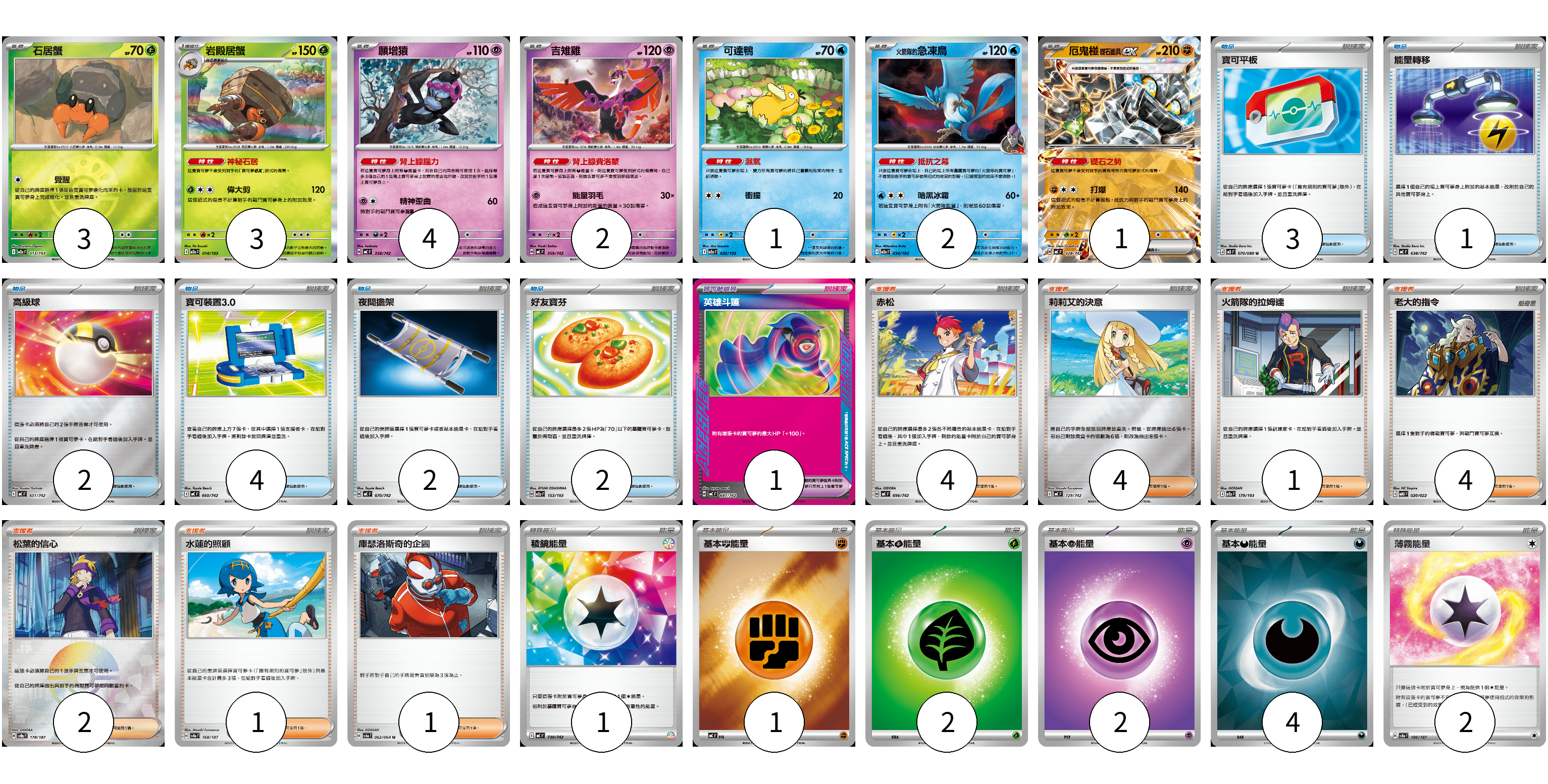 牌組構築方案 以此牌組為基礎新構築牌組 顯示卡面 顯示列表 寶可夢卡(16) 3 3 4 2 1 2 1 寶可夢道具(1) 1 物品卡(14) 3 1 2 4 2 2 支援者卡(17) 4 4 1 4 2 1 1 能量卡(12) 1 1 2 2 4 2 寶可夢卡(16) 卡牌名稱 張數 卡牌名稱 張數 石居蟹 M2a 013/193 03 岩殿居蟹 M2a 014/193 03 願增猿 MC 358/742 04 吉雉雞 MC 359/742 02 可達鴨 M2a 032/193 01 <火箭隊的>急凍鳥 M2a 034/193 02 厄鬼椪 礎石面具ex MC 428/742 01 寶可夢道具(1) 卡牌名稱 張數 卡牌名稱 張數 英雄斗篷 MC 687/742 01 物品卡(14) 卡牌名稱 張數 卡牌名稱 張數 寶可平板 M3 070/080 03 能量轉移 MC 638/742 01 高級球 MC 651/742 02 寶可裝置3.0 MC 660/742 04 夜間擔架 MC 670/742 02 好友寶芬 M2a 153/193 02 支援者卡(17) 卡牌名稱 張數 卡牌名稱 張數 赤松 MC 696/742 04 莉莉艾的決意 MC 729/742 04 火箭隊的拉姆達 M2a 179/193 01 老大的指令 MBD 020/022 04 松葉的信心 SV8a 178/187 02 水蓮的照顧 SV8a 168/187 01 庫瑟洛斯奇的企圖 SV6a 062/064 01 能量卡(12) 卡牌名稱 張數 卡牌名稱 張數 稜鏡能量 MC 739/742 01 基本【鬥】能量 MC FIG 01 基本【草】能量 MJ GRA 02 基本【超】能量 M-P PSY 02 基本【惡】能量 SVOM DAR 04 薄霧能量 SV8a 186/187 02 以此牌組為基礎新構築牌組 牌組編碼 uIrIpy-riczDh-GJnpgg copy 列印牌組單 牌組編碼已複製 分享至SNS