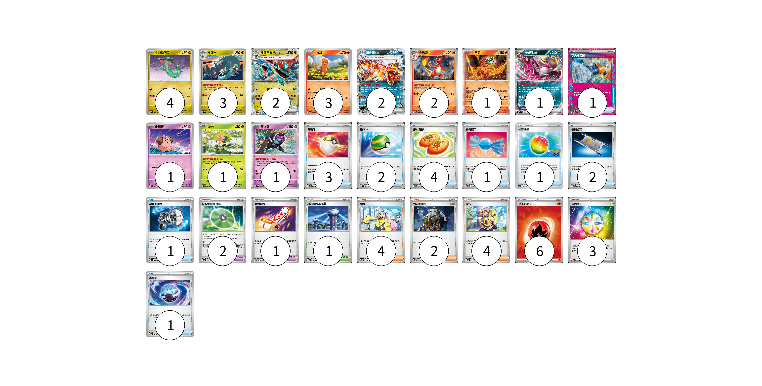 牌組構築方案 以此牌組為基礎新構築牌組 顯示卡面 顯示列表 寶可夢卡(21) 4 3 2 3 2 2 1 1 1 1 1 寶可夢道具(3) 2 1 物品卡(16) 1 3 2 4 1 1 2 1 1 支援者卡(10) 4 2 4 競技場卡(1) 1 能量卡(9) 6 3 寶可夢卡(21) 卡牌名稱 張數 卡牌名稱 張數 多龍梅西亞 SV8a 118/187 04 多龍奇 SV8a 119/187 03 多龍巴魯托ex SV8a 120/187 02 小火龍 SVTL 001/021 03 噴火龍ex SV3 066/108 02 火恐龍 SVTL 002/021 02 古玉魚 SV8a 025/187 01 吉雉雞ex SV8a 104/187 01 皮寶寶 SV4a 077/190 01 謝米 SV9a 006/063 01 願增猿 SV8a 075/187 01 寶可夢道具(3) 卡牌名稱 張數 卡牌名稱 張數 招式學習器 演進 SV8a 160/187 02 緊急滑板 SVOD 015/020 01 物品卡(16) 卡牌名稱 張數 卡牌名稱 張數 頂尖捕捉器 SV5M 062/071 01 高級球 SVOM 013/021 03 巢穴球 SVM 133/175 02 好友寶芬 SVOD 011/020 04 神奇糖果 SVOD 013/020 01 神奇糖果 S10b 066/071 01 夜間擔架 SVOM 016/021 02 反擊捕捉器 SV4M 059/066 01 太晶珠 SV8a 145/187 01 支援者卡(10) 卡牌名稱 張數 卡牌名稱 張數 奇樹 SVOM 018/021 04 老大的指令 SVOM 020/021 02 派帕 SVK 035/042 04 競技場卡(1) 卡牌名稱 張數 卡牌名稱 張數 火箭隊的監視塔 SV10 096/098 01 能量卡(9) 卡牌名稱 張數 卡牌名稱 張數 基本【火】能量 SVK FIR 06 夜光能量 SVK 042/042 03 以此牌組為基礎新構築牌組 牌組編碼 uLlXpQ-ojXFUw-CrZShj copy 列印牌組單 牌組編碼已複製 分享至SNS