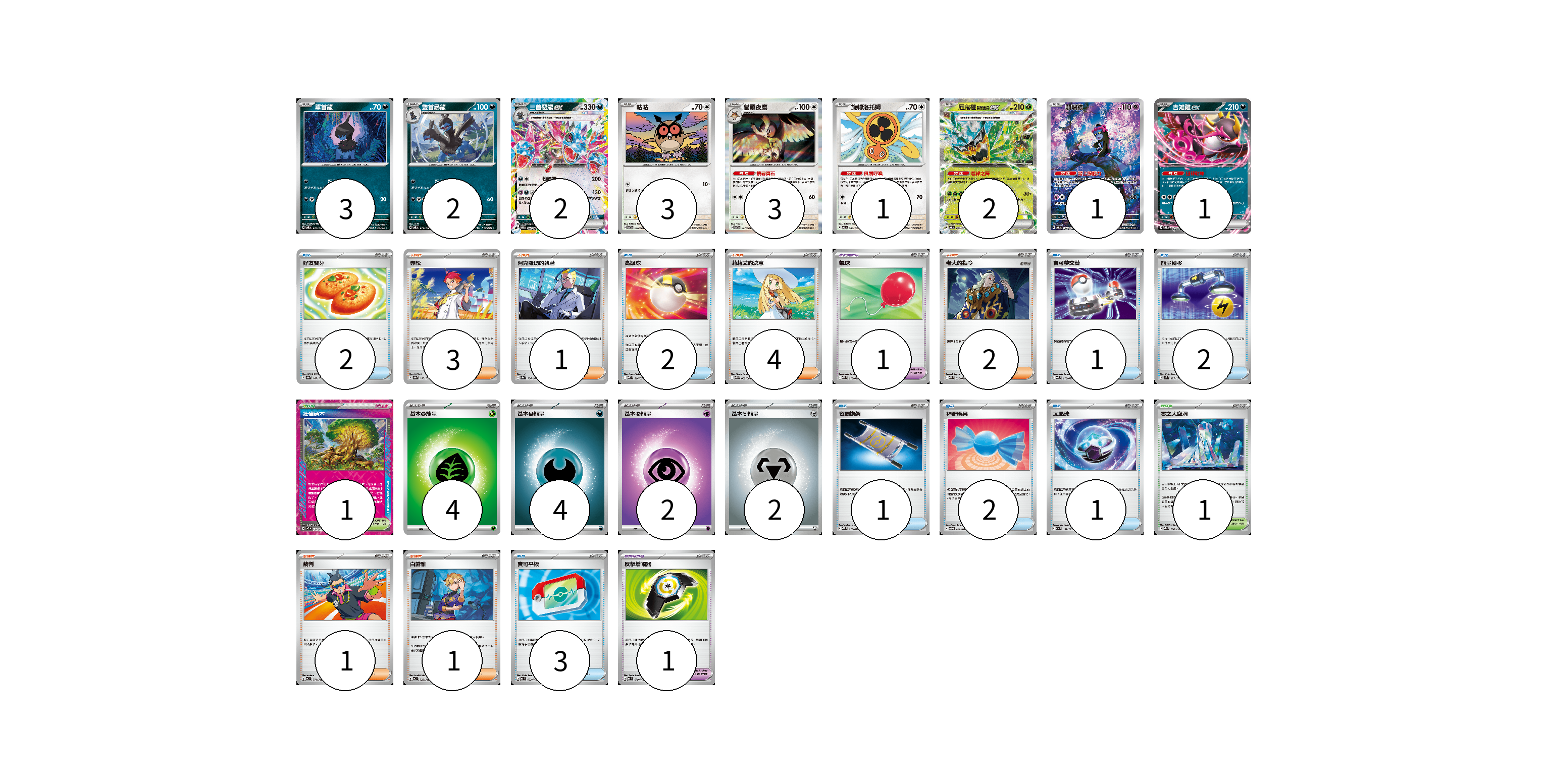 牌組構築方案 以此牌組為基礎新構築牌組 顯示卡面 顯示列表 寶可夢卡(18) 3 2 2 3 3 1 2 1 1 寶可夢道具(2) 1 1 物品卡(14) 2 2 1 2 1 2 1 3 支援者卡(12) 3 1 4 2 1 1 競技場卡(2) 1 1 能量卡(12) 4 4 2 2 寶可夢卡(18) 卡牌名稱 張數 卡牌名稱 張數 單首龍 SV8 070/106 03 雙首暴龍 SV8 071/106 02 三首惡龍ex SV8 072/106 02 咕咕 SV7 076/102 03 貓頭夜鷹 SV7 077/102 03 旋轉洛托姆 SV7 080/102 01 厄鬼椪 碧草面具ex SV6 016/101 02 願增猿 SV6 107/101 01 吉雉雞ex SVOD 004/020 01 寶可夢道具(2) 卡牌名稱 張數 卡牌名稱 張數 氣球 MBD 018/022 01 反擊增幅器 MC 679/742 01 物品卡(14) 卡牌名稱 張數 卡牌名稱 張數 好友寶芬 SV8a 147/187 02 高級球 MBD 014/022 02 寶可夢交替 SVQL 016/022 01 能量轉移 SVM 127/175 02 夜間擔架 MBD 016/022 01 神奇糖果 SVOD 013/020 02 太晶珠 M2a 152/193 01 寶可平板 MC 662/742 03 支援者卡(12) 卡牌名稱 張數 卡牌名稱 張數 赤松 SV8a 163/187 03 阿克羅瑪的執著 SV8a 164/187 01 莉莉艾的決意 M1L 062/063 04 老大的指令 MBD 020/022 02 裁判 MC 711/742 01 白蕾雅 MC 722/742 01 競技場卡(2) 卡牌名稱 張數 卡牌名稱 張數 壯偉碩木 SV7 101/102 01 零之大空洞 M2a 184/193 01 能量卡(12) 卡牌名稱 張數 卡牌名稱 張數 基本【草】能量 M-P GRA 04 基本【惡】能量 MBG DAR 04 基本【超】能量 MBD PSY 02 基本【鋼】能量 M-P MET 02 以此牌組為基礎新構築牌組 牌組編碼 uMtnBd-YiKMdN-nMYwUn copy 列印牌組單 牌組編碼已複製 分享至SNS