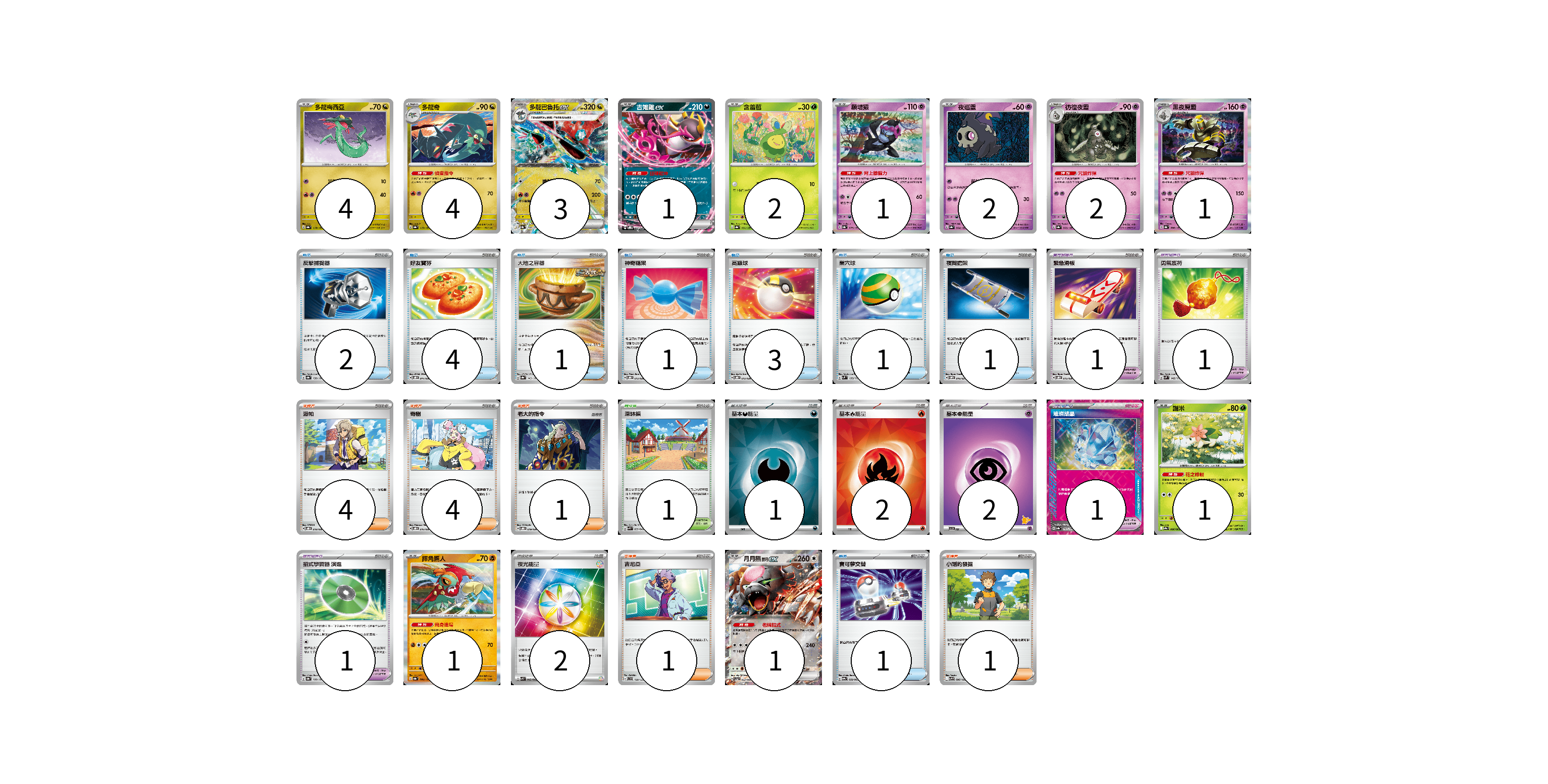 牌組構築方案 以此牌組為基礎新構築牌組 顯示卡面 顯示列表 寶可夢卡(23) 4 4 3 1 2 1 2 2 1 1 1 1 寶可夢道具(4) 1 1 1 1 物品卡(14) 2 4 1 1 3 1 1 1 支援者卡(11) 4 4 1 1 1 競技場卡(1) 1 能量卡(7) 1 2 2 2 寶可夢卡(23) 卡牌名稱 張數 卡牌名稱 張數 多龍梅西亞 SV8a 118/187 04 多龍奇 SV8a 119/187 04 多龍巴魯托ex SV8a 120/187 03 吉雉雞ex SVOD 004/020 01 含羞苞 SV8a 001/187 02 願增猿 SV8a 075/187 01 夜巡靈 SV8a 064/187 02 彷徨夜靈 SV8a 065/187 02 黑夜魔靈 SV8a 066/187 01 謝米 SV9a 006/063 01 摔角鷹人 SV8a 084/187 01 月月熊 赫月 ex SV5a 052/066 01 寶可夢道具(4) 卡牌名稱 張數 卡牌名稱 張數 緊急滑板 SVOD 015/020 01 勇氣護符 SVM 142/175 01 璀璨結晶 SV8a 152/187 01 招式學習器 演進 SV8a 160/187 01 物品卡(14) 卡牌名稱 張數 卡牌名稱 張數 反擊捕捉器 SV8a 139/187 02 好友寶芬 SVOD 011/020 04 大地之容器 SV8a 143/187 01 神奇糖果 SVOD 013/020 01 高級球 SVOD 012/020 03 巢穴球 SVM 133/175 01 夜間擔架 SVOM 016/021 01 寶可夢交替 SV9a 058/063 01 支援者卡(11) 卡牌名稱 張數 卡牌名稱 張數 派帕 SVOD 018/020 04 奇樹 SVOD 016/020 04 老大的指令 SVOD 019/020 01 吉尼亞 SVD 129/139 01 小剛的發掘 SV9 096/100 01 競技場卡(1) 卡牌名稱 張數 卡牌名稱 張數 深缽鎮 SVK 039/042 01 能量卡(7) 卡牌名稱 張數 卡牌名稱 張數 基本【惡】能量 SVOM DAR 01 基本【火】能量 SVK FIR 02 基本【超】能量 SVI PSY 02 夜光能量 SVK 042/042 02 以此牌組為基礎新構築牌組 牌組編碼 uPMZIY-pwnmdq-ZhCHQg copy 列印牌組單 牌組編碼已複製 分享至SNS