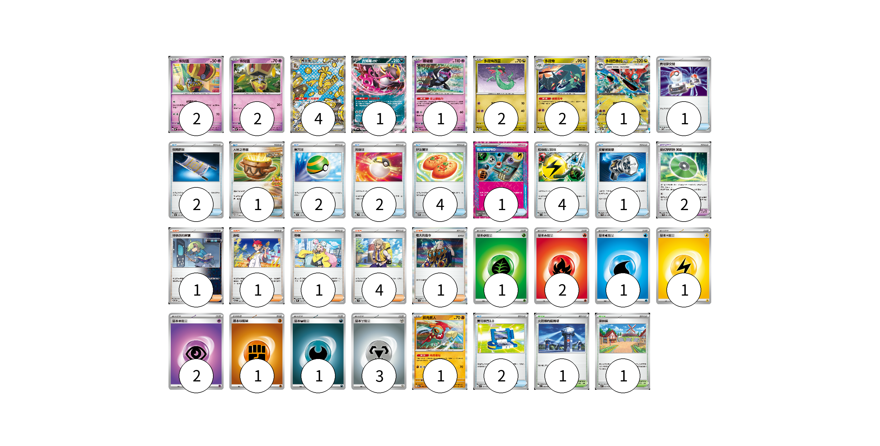 牌組構築方案 以此牌組為基礎新構築牌組 顯示卡面 顯示列表 寶可夢卡(16) 2 2 4 1 1 2 2 1 1 寶可夢道具(2) 2 物品卡(20) 1 2 1 2 2 4 1 4 1 2 支援者卡(8) 1 1 1 4 1 競技場卡(2) 1 1 能量卡(12) 1 2 1 1 2 1 1 3 寶可夢卡(16) 卡牌名稱 張數 卡牌名稱 張數 索財靈 SV3a 020/062 02 索財靈 SV3a 021/062 02 賽富豪ex SV8a 220/187 04 吉雉雞ex SV8a 104/187 01 願增猿 SV6 055/101 01 多龍梅西亞 SV6 079/101 02 多龍奇 SV6 080/101 02 多龍巴魯托ex SV6 081/101 01 摔角鷹人 SV8a 084/187 01 寶可夢道具(2) 卡牌名稱 張數 卡牌名稱 張數 招式學習器 演進 SV4M 063/066 02 物品卡(20) 卡牌名稱 張數 卡牌名稱 張數 寶可夢交替 SV-P 014/SV-P 01 夜間擔架 SV6a 056/064 02 大地之容器 SV-P 084/SV-P 01 巢穴球 SV1S 070/078 02 高級球 SV1V 070/078 02 好友寶芬 SV5K 063/071 04 能量輸送PRO SV7a 052/064 01 超級能量回收 SV1a 064/073 04 反擊捕捉器 SV4M 059/066 01 寶可裝置3.0 SVK 021/042 02 支援者卡(8) 卡牌名稱 張數 卡牌名稱 張數 暗碼迷的解讀 SV5M 067/071 01 赤松 SV7 097/102 01 奇樹 SV2D 069/071 01 派帕 SV1V 076/078 04 老大的指令 SV1a 069/073 01 競技場卡(2) 卡牌名稱 張數 卡牌名稱 張數 火箭隊的監視塔 SV10 096/098 01 深缽鎮 SVK 039/042 01 能量卡(12) 卡牌名稱 張數 卡牌名稱 張數 基本草能量 sv-p GRA 01 基本火能量 sv-p FIR 02 基本水能量 sv-p WAT 01 基本雷能量 sv-p LIG 01 基本超能量 sv-p PSY 02 基本【鬥】能量 SVAM FIG 01 基本惡能量 sv-p DAR 01 基本鋼能量 sv-p MET 03 以此牌組為基礎新構築牌組 牌組編碼 uQpfZW-PpfCpC-jdCUjP copy 列印牌組單 牌組編碼已複製 分享至SNS