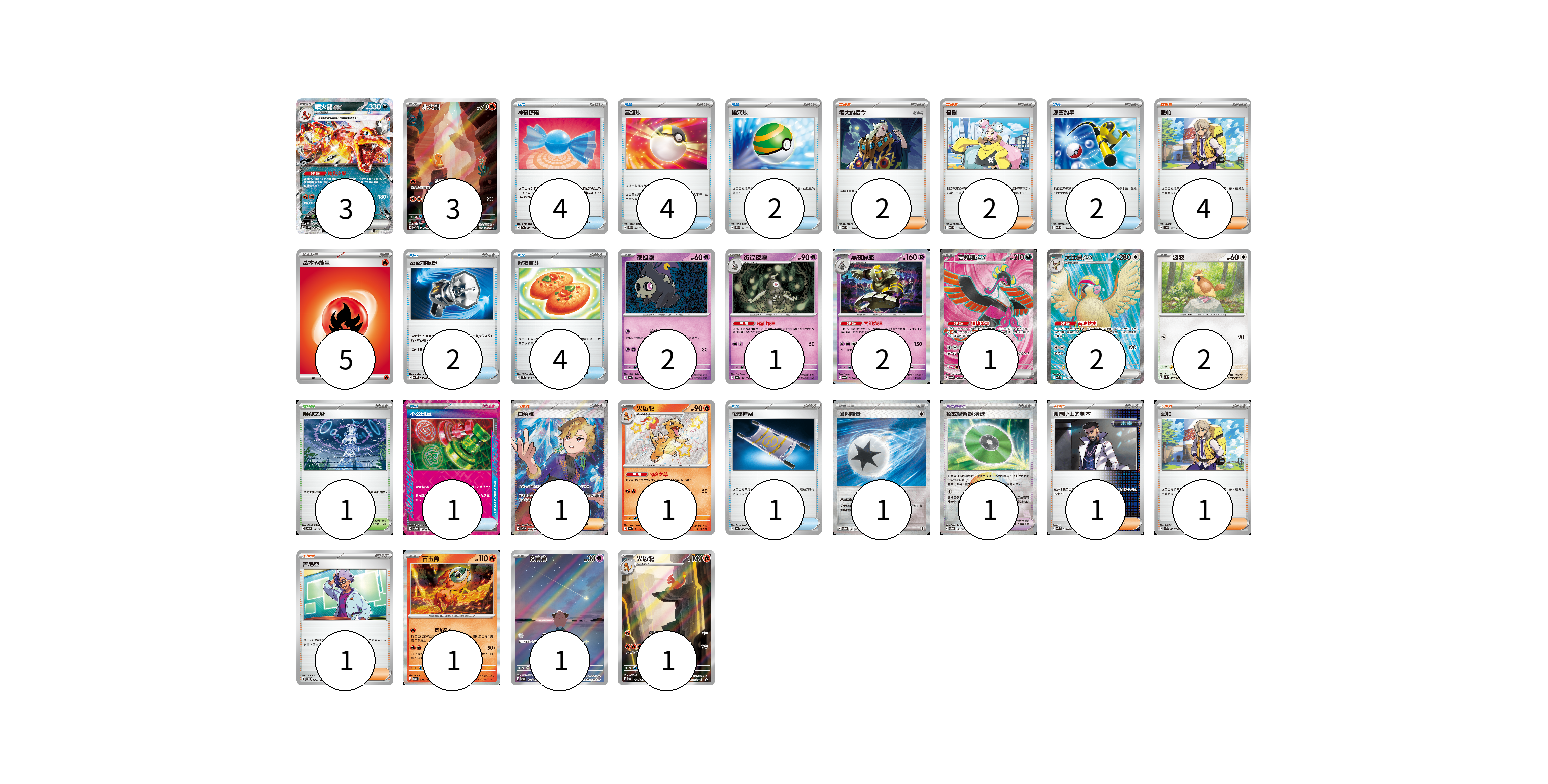 牌組構築方案 以此牌組為基礎新構築牌組 顯示卡面 顯示列表 寶可夢卡(20) 3 3 2 1 2 1 2 2 1 1 1 1 寶可夢道具(1) 1 物品卡(20) 4 4 2 2 2 4 1 1 支援者卡(12) 2 2 4 1 1 1 1 競技場卡(1) 1 能量卡(6) 5 1 寶可夢卡(20) 卡牌名稱 張數 卡牌名稱 張數 噴火龍ex SV3 066/108 03 小火龍 SV2a 168/165 03 夜巡靈 SV6a 018/064 02 彷徨夜靈 SV6a 019/064 01 黑夜魔靈 SV6a 020/064 02 吉雉雞ex SV6a 081/064 01 大比鳥ex SV3 128/108 02 波波 SV3 087/108 02 火恐龍 SV4a 211/190 01 古玉魚 SV8a 025/187 01 皮寶寶 SV3 113/108 01 火恐龍 SV2a 169/165 01 寶可夢道具(1) 卡牌名稱 張數 卡牌名稱 張數 招式學習器 演進 SV8a 160/187 01 物品卡(20) 卡牌名稱 張數 卡牌名稱 張數 神奇糖果 SV3a 053/062 04 高級球 SVEL 012/020 04 巢穴球 SVEL 011/020 02 厲害釣竿 SVF 013/038 02 反擊捕捉器 SV4M 059/066 02 好友寶芬 SV5K 063/071 04 不公印章 SV5a 053/066 01 夜間擔架 SV6a 056/064 01 支援者卡(12) 卡牌名稱 張數 卡牌名稱 張數 老大的指令 SVEL 019/020 02 奇樹 SVEL 016/020 02 派帕 SVD 137/139 04 白蕾雅 SV7 126/102 01 弗圖博士的劇本 SVK 034/042 01 派帕 SVK 035/042 01 吉尼亞 SVD 129/139 01 競技場卡(1) 卡牌名稱 張數 卡牌名稱 張數 阻礙之塔 SV6 100/101 01 能量卡(6) 卡牌名稱 張數 卡牌名稱 張數 基本【火】能量 SVF FIR 05 噴射能量 SV8a 185/187 01 以此牌組為基礎新構築牌組 牌組編碼 uQsina-xtXhfK-jshkGG copy 列印牌組單 牌組編碼已複製 分享至SNS
