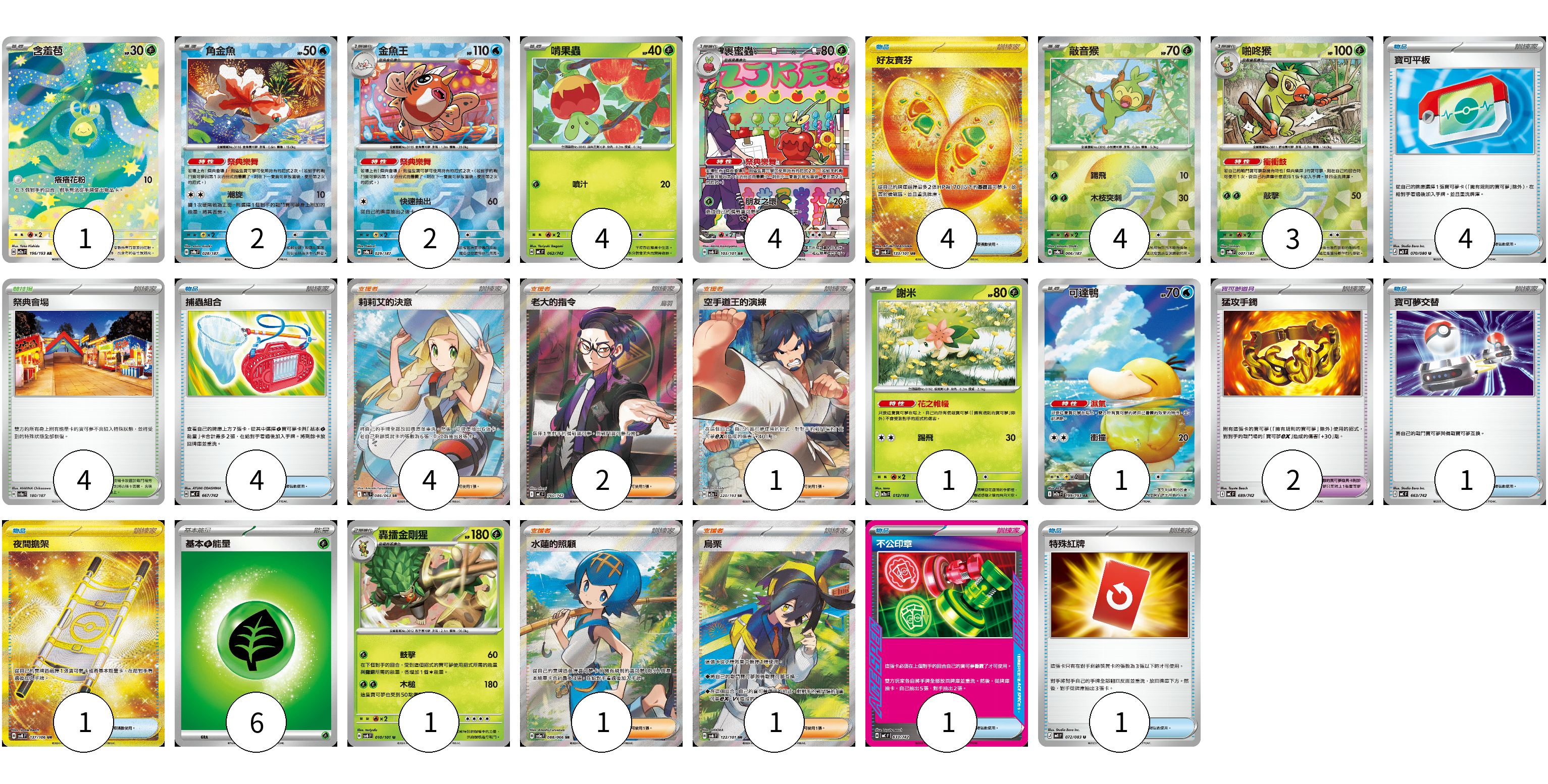 牌組構築方案 以此牌組為基礎新構築牌組 顯示卡面 顯示列表 寶可夢卡(23) 1 2 2 4 4 4 3 1 1 1 寶可夢道具(2) 2 物品卡(16) 4 4 4 1 1 1 1 支援者卡(9) 4 2 1 1 1 競技場卡(4) 4 能量卡(6) 6 寶可夢卡(23) 卡牌名稱 張數 卡牌名稱 張數 含羞苞 M2a 196/193 01 角金魚 SV8a 028/187 02 金魚王 SV8a 029/187 02 啃果蟲 MC 062/742 04 裹蜜蟲 SV6 103/101 04 敲音猴 SV8a 006/187 04 啪咚猴 SV8a 007/187 03 謝米 M2a 012/193 01 可達鴨 M2a 199/193 01 轟擂金剛猩 SV6 010/101 01 寶可夢道具(2) 卡牌名稱 張數 卡牌名稱 張數 猛攻手鐲 MC 689/742 02 物品卡(16) 卡牌名稱 張數 卡牌名稱 張數 好友寶芬 SV6 133/101 04 寶可平板 M3 070/080 04 捕蟲組合 MC 667/742 04 寶可夢交替 MC 663/742 01 夜間擔架 SV8 137/106 01 不公印章 MC 633/742 01 特殊紅牌 M4 072/083 01 支援者卡(9) 卡牌名稱 張數 卡牌名稱 張數 莉莉艾的決意 M1L 086/063 04 老大的指令(烏羽) MC 760/742 02 空手道王的演練 M2a 220/193 01 水蓮的照顧 SV5a 088/066 01 烏栗 SV6 122/101 01 競技場卡(4) 卡牌名稱 張數 卡牌名稱 張數 祭典會場 SV8a 180/187 04 能量卡(6) 卡牌名稱 張數 卡牌名稱 張數 基本【草】能量 MC GRA 06 以此牌組為基礎新構築牌組 牌組編碼 uUdaMw-OXnciE-cBEYHL copy 列印牌組單 牌組編碼已複製 分享至SNS
