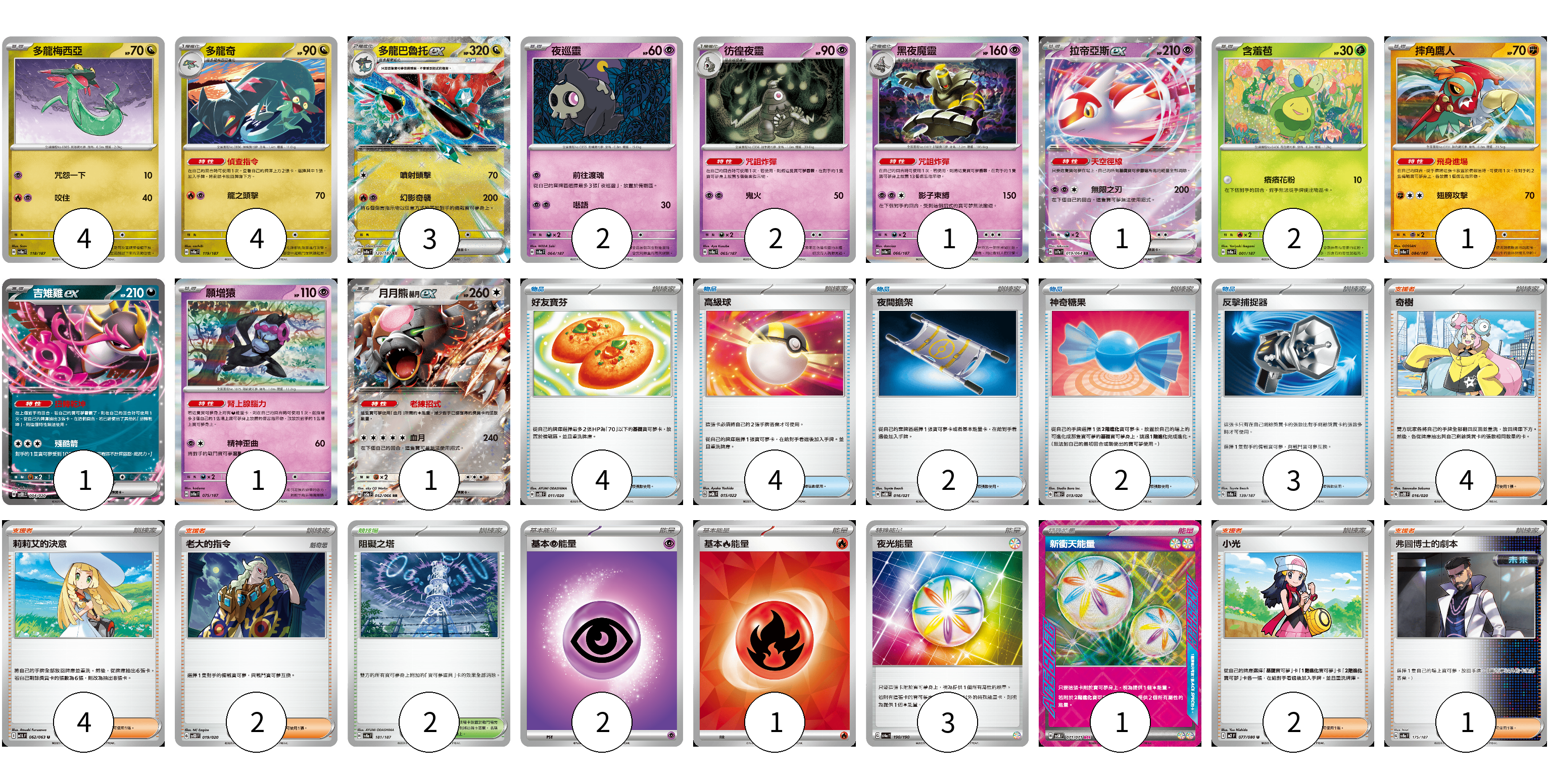 牌組構築方案 以此牌組為基礎新構築牌組 顯示卡面 顯示列表 寶可夢卡(23) 4 4 3 2 2 1 1 2 1 1 1 1 物品卡(15) 4 4 2 2 3 支援者卡(13) 4 4 2 2 1 競技場卡(2) 2 能量卡(7) 2 1 3 1 寶可夢卡(23) 卡牌名稱 張數 卡牌名稱 張數 多龍梅西亞 SV8a 118/187 04 多龍奇 SV8a 119/187 04 多龍巴魯托ex SV8a 120/187 03 夜巡靈 SV8a 064/187 02 彷徨夜靈 SV8a 065/187 02 黑夜魔靈 SV8a 066/187 01 拉帝亞斯ex SV7a 019/064 01 含羞苞 SV8a 001/187 02 摔角鷹人 SV8a 084/187 01 吉雉雞ex SVOD 004/020 01 願增猿 SV8a 075/187 01 月月熊 赫月 ex SV5a 052/066 01 物品卡(15) 卡牌名稱 張數 卡牌名稱 張數 好友寶芬 SVOD 011/020 04 高級球 SVQL 015/022 04 夜間擔架 SVOM 016/021 02 神奇糖果 SVOD 013/020 02 反擊捕捉器 SV8a 139/187 03 支援者卡(13) 卡牌名稱 張數 卡牌名稱 張數 奇樹 SVOD 016/020 04 莉莉艾的決意 M1L 062/063 04 老大的指令 SVOD 019/020 02 小光 M2 077/080 02 弗圖博士的劇本 SV8a 175/187 01 競技場卡(2) 卡牌名稱 張數 卡牌名稱 張數 阻礙之塔 SV8a 181/187 02 能量卡(7) 卡牌名稱 張數 卡牌名稱 張數 基本【超】能量 M-P PSY 02 基本【火】能量 SVQL FIR 01 夜光能量 SV4a 190/190 03 新衝天能量 SV5K 071/071 01 以此牌組為基礎新構築牌組 牌組編碼 uVKhQL-kvUgnZ-ydlZFd copy 列印牌組單 牌組編碼已複製 分享至SNS