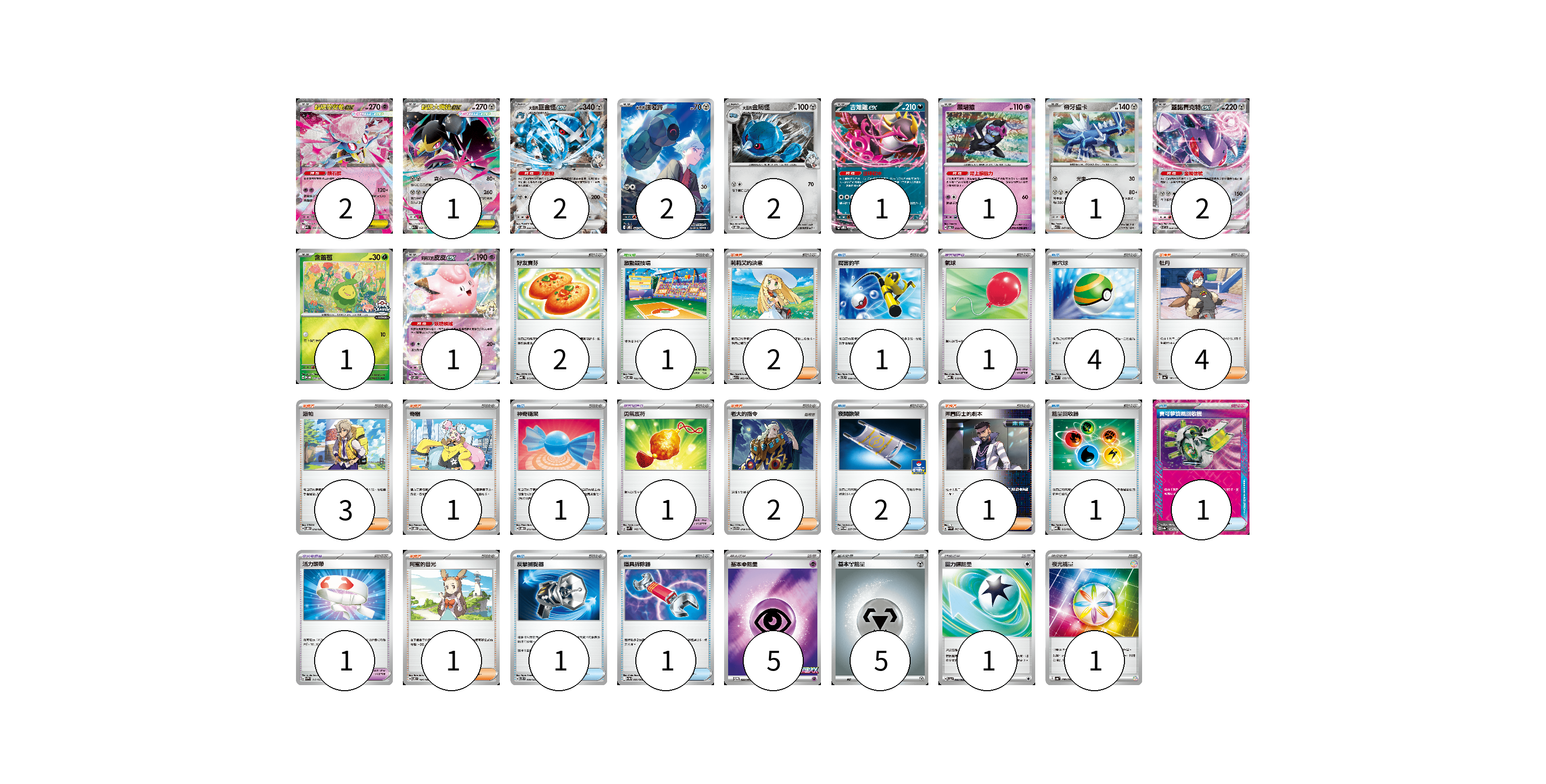 牌組構築方案 以此牌組為基礎新構築牌組 顯示卡面 顯示列表 寶可夢卡(16) 2 1 2 2 2 1 1 1 2 1 1 寶可夢道具(3) 1 1 1 物品卡(14) 2 1 4 1 2 1 1 1 1 支援者卡(14) 2 4 3 1 2 1 1 競技場卡(1) 1 能量卡(12) 5 5 1 1 寶可夢卡(16) 卡牌名稱 張數 卡牌名稱 張數 超級蒂安希ex MBD 006/022 02 超級大嘴娃ex M1L 046/063 01 <大吾的>巨金怪ex SVOD 008/020 02 <大吾的>鐵啞鈴 SVOD 021/020 02 <大吾的>金屬怪 SVOD 007/020 02 吉雉雞ex SVOD 004/020 01 願增猿 SV6 055/101 01 帝牙盧卡 M1L 047/063 01 蓋諾賽克特ex SV11B 069/086 02 含羞苞 M-P 037/M-P 01 莉莉艾的皮皮ex SV9 033/100 01 寶可夢道具(3) 卡牌名稱 張數 卡牌名稱 張數 氣球 MBD 018/022 01 勇氣護符 SVM 142/175 01 活力頭帶 SVAW 019/023 01 物品卡(14) 卡牌名稱 張數 卡牌名稱 張數 好友寶芬 MBD 013/022 02 厲害釣竿 SVTL 009/021 01 巢穴球 SVM 133/175 04 神奇糖果 SVOD 013/020 01 夜間擔架 SV-P 227/SV-P 02 能量回收器 MBD 012/022 01 寶可夢旋風回收機 SV8a 149/187 01 反擊捕捉器 SVTS 009/022 01 道具拆除器 SV11W 080/086 01 支援者卡(14) 卡牌名稱 張數 卡牌名稱 張數 莉莉艾的決意 M1L 062/063 02 牡丹 SV4a 182/190 04 派帕 SVOD 018/020 03 奇樹 SVOD 016/020 01 老大的指令 SVTG 019/019 02 弗圖博士的劇本 SV4M 065/066 01 阿蜜的目光 SV8 104/106 01 競技場卡(1) 卡牌名稱 張數 卡牌名稱 張數 激動競技場 SV8 105/106 01 能量卡(12) 卡牌名稱 張數 卡牌名稱 張數 基本【超】能量 M-P 033/M-P 05 基本【鋼】能量 M-P MET 05 回力鏢能量 SV5a 066/066 01 夜光能量 SV4a 190/190 01 以此牌組為基礎新構築牌組 牌組編碼 uWNBBv-fjhIws-zFRvBo copy 列印牌組單 牌組編碼已複製 分享至SNS