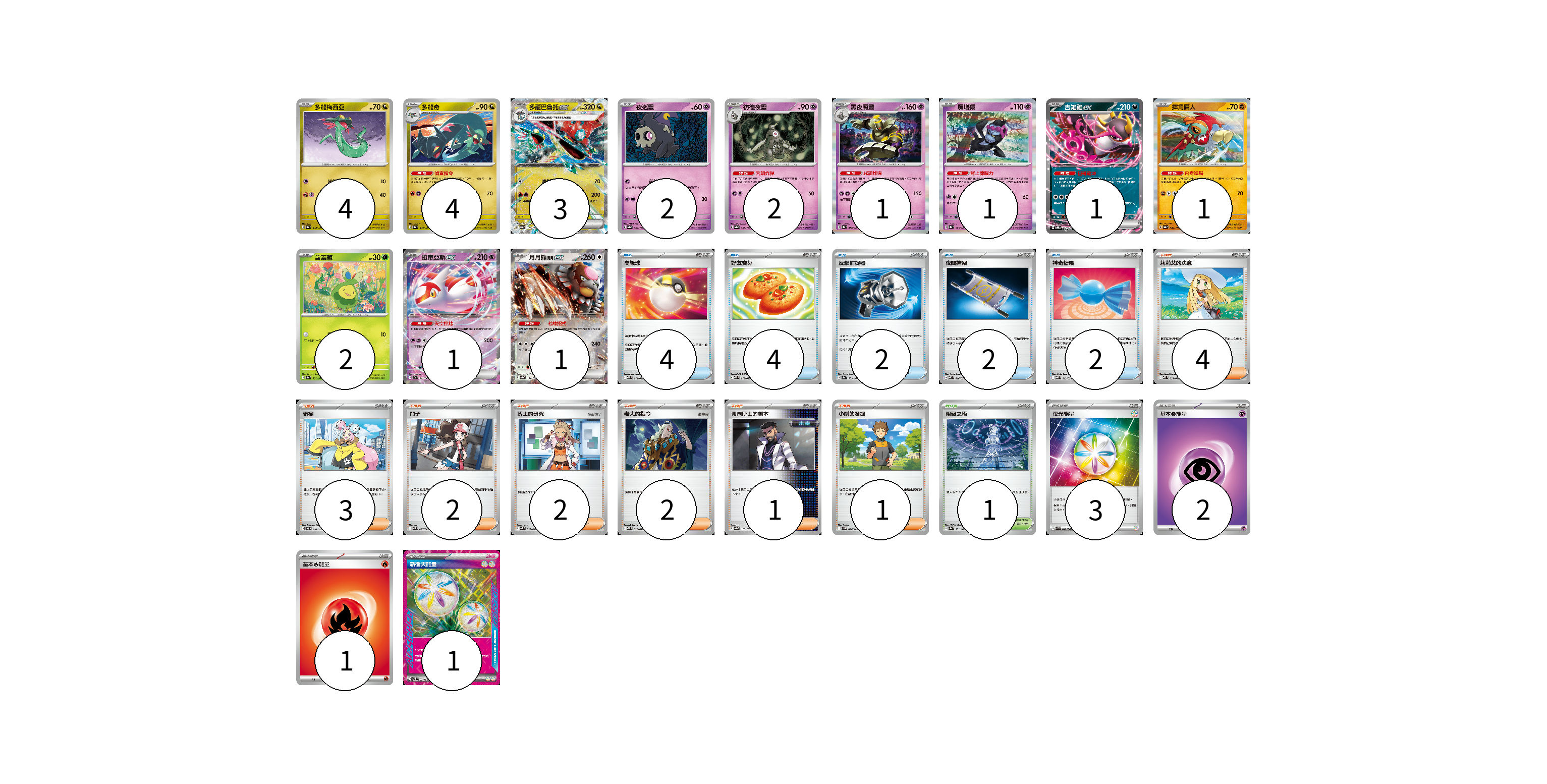 牌組構築方案 以此牌組為基礎新構築牌組 顯示卡面 顯示列表 寶可夢卡(23) 4 4 3 2 2 1 1 1 1 2 1 1 物品卡(14) 4 4 2 2 2 支援者卡(15) 4 3 2 2 2 1 1 競技場卡(1) 1 能量卡(7) 3 2 1 1 寶可夢卡(23) 卡牌名稱 張數 卡牌名稱 張數 多龍梅西亞 SV8a 118/187 04 多龍奇 SV8a 119/187 04 多龍巴魯托ex SV8a 120/187 03 夜巡靈 SV8a 064/187 02 彷徨夜靈 SV8a 065/187 02 黑夜魔靈 SV8a 066/187 01 願增猿 SV8a 075/187 01 吉雉雞ex SVOD 004/020 01 摔角鷹人 SV8a 084/187 01 含羞苞 SV8a 001/187 02 拉帝亞斯ex SV7a 019/064 01 月月熊 赫月ex SV8a 134/187 01 物品卡(14) 卡牌名稱 張數 卡牌名稱 張數 高級球 MBD 014/022 04 好友寶芬 MBD 013/022 04 反擊捕捉器 SV8a 139/187 02 夜間擔架 MBD 016/022 02 神奇糖果 MBG 013/022 02 支援者卡(15) 卡牌名稱 張數 卡牌名稱 張數 莉莉艾的決意 MBD 021/022 04 奇樹 SVOD 016/020 03 鬥子 SV11W 085/086 02 博士的研究 SVK 032/042 02 老大的指令 MBD 020/022 02 弗圖博士的劇本 SV8a 175/187 01 小剛的發掘 SV9 096/100 01 競技場卡(1) 卡牌名稱 張數 卡牌名稱 張數 阻礙之塔 SV8a 181/187 01 能量卡(7) 卡牌名稱 張數 卡牌名稱 張數 夜光能量 SVK 042/042 03 基本超能量 sv-p PSY 02 基本火能量 sv-p FIR 01 新衝天能量 SV5K 071/071 01 以此牌組為基礎新構築牌組 牌組編碼 uXVfuI-ZdArEM-ERxPgc copy 列印牌組單 牌組編碼已複製 分享至SNS