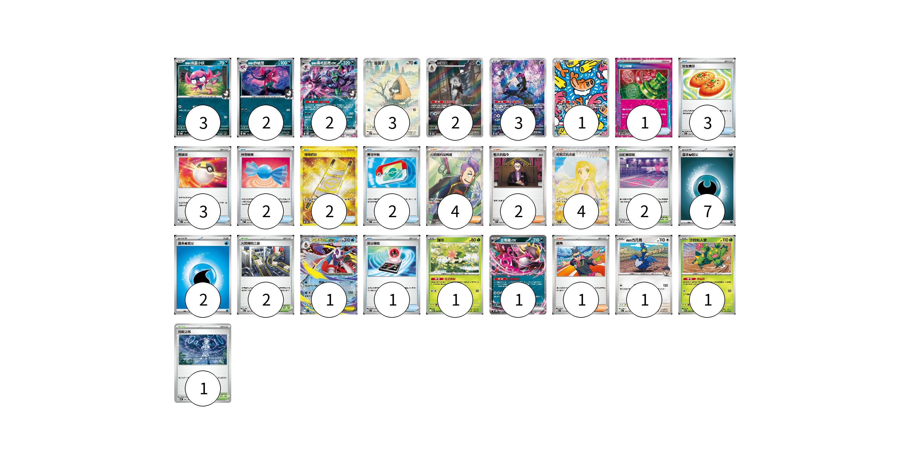 牌組構築方案 以此牌組為基礎新構築牌組 顯示卡面 顯示列表 寶可夢卡(21) 3 2 2 3 2 3 1 1 1 1 1 1 物品卡(14) 1 3 3 2 2 2 1 支援者卡(11) 4 2 4 1 競技場卡(5) 2 2 1 能量卡(9) 7 2 寶可夢卡(21) 卡牌名稱 張數 卡牌名稱 張數 <瑪俐的>搗蛋小妖 SVOM 005/021 03 <瑪俐的>詐唬魔 SVOM 006/021 02 <瑪俐的>長毛巨魔ex SVOM 007/021 02 雪童子 M2a 200/193 03 雪妖女 SV6 104/101 02 願增猿 SV6 107/101 03 米立龍 SV6 112/101 01 超級雪妖女ex M2a 036/193 01 謝米 SV9a 006/063 01 吉雉雞ex SVOD 004/020 01 <赫普的>古月鳥 MC 624/742 01 沙鈴仙人掌 SV9 006/100 01 物品卡(14) 卡牌名稱 張數 卡牌名稱 張數 不公印章 SV5a 053/066 01 好友寶芬 MC 648/742 03 高級球 MC 651/742 03 神奇糖果 MC 655/742 02 夜間擔架 SV8 137/106 02 寶可平板 MC 662/742 02 能量輸送 MC 639/742 01 支援者卡(11) 卡牌名稱 張數 卡牌名稱 張數 火箭隊的拉姆達 SV10 122/098 04 老大的指令 MC 724/742 02 莉莉艾的決意 M1L 091/063 04 裁判 MC 711/742 01 競技場卡(5) 卡牌名稱 張數 卡牌名稱 張數 尖釘鎮道館 SVOM 021/021 02 火箭隊的工廠 M2a 190/193 02 阻礙之塔 SV8a 181/187 01 能量卡(9) 卡牌名稱 張數 卡牌名稱 張數 基本【惡】能量 MC DAR 07 基本【水】能量 MC WAT 02 以此牌組為基礎新構築牌組 牌組編碼 uZlMdV-niBuKP-pvLWdM copy 列印牌組單 牌組編碼已複製 分享至SNS