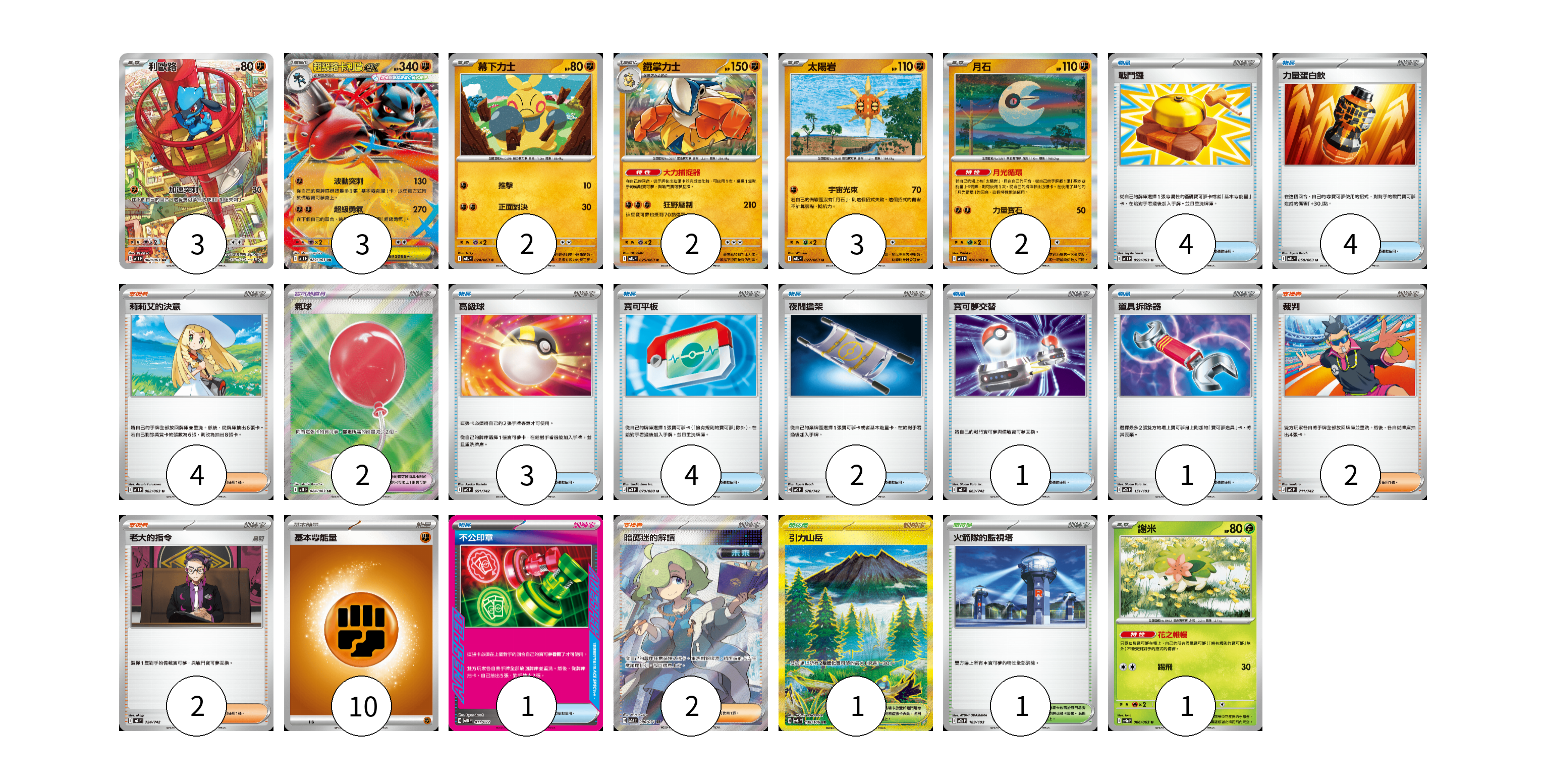 牌組構築方案 以此牌組為基礎新構築牌組 顯示卡面 顯示列表 寶可夢卡(16) 3 3 2 2 3 2 1 寶可夢道具(2) 2 物品卡(20) 4 4 3 4 2 1 1 1 支援者卡(10) 4 2 2 2 競技場卡(2) 1 1 能量卡(10) 10 寶可夢卡(16) 卡牌名稱 張數 卡牌名稱 張數 利歐路 M1L 068/063 03 超級路卡利歐ex M1L 029/063 03 幕下力士 M1L 024/063 02 鐵掌力士 M1L 025/063 02 太陽岩 M1L 027/063 03 月石 M1L 026/063 02 謝米 SV9a 006/063 01 寶可夢道具(2) 卡牌名稱 張數 卡牌名稱 張數 氣球 M1L 084/063 02 物品卡(20) 卡牌名稱 張數 卡牌名稱 張數 戰鬥鑼 M1L 059/063 04 力量蛋白飲 M1L 058/063 04 高級球 MC 651/742 03 寶可平板 M3 070/080 04 夜間擔架 MC 670/742 02 寶可夢交替 MC 663/742 01 道具拆除器 M2a 151/193 01 不公印章 MBD 011/022 01 支援者卡(10) 卡牌名稱 張數 卡牌名稱 張數 莉莉艾的決意 M1L 062/063 04 裁判 MC 711/742 02 老大的指令 MC 724/742 02 暗碼迷的解讀 SV5M 090/071 02 競技場卡(2) 卡牌名稱 張數 卡牌名稱 張數 引力山岳 SV8 138/106 01 火箭隊的監視塔 M2a 189/193 01 能量卡(10) 卡牌名稱 張數 卡牌名稱 張數 基本【鬥】能量 MC FIG 10 以此牌組為基礎新構築牌組 牌組編碼 uaDDDb-ADasdh-GpdYup copy 列印牌組單 牌組編碼已複製 分享至SNS
