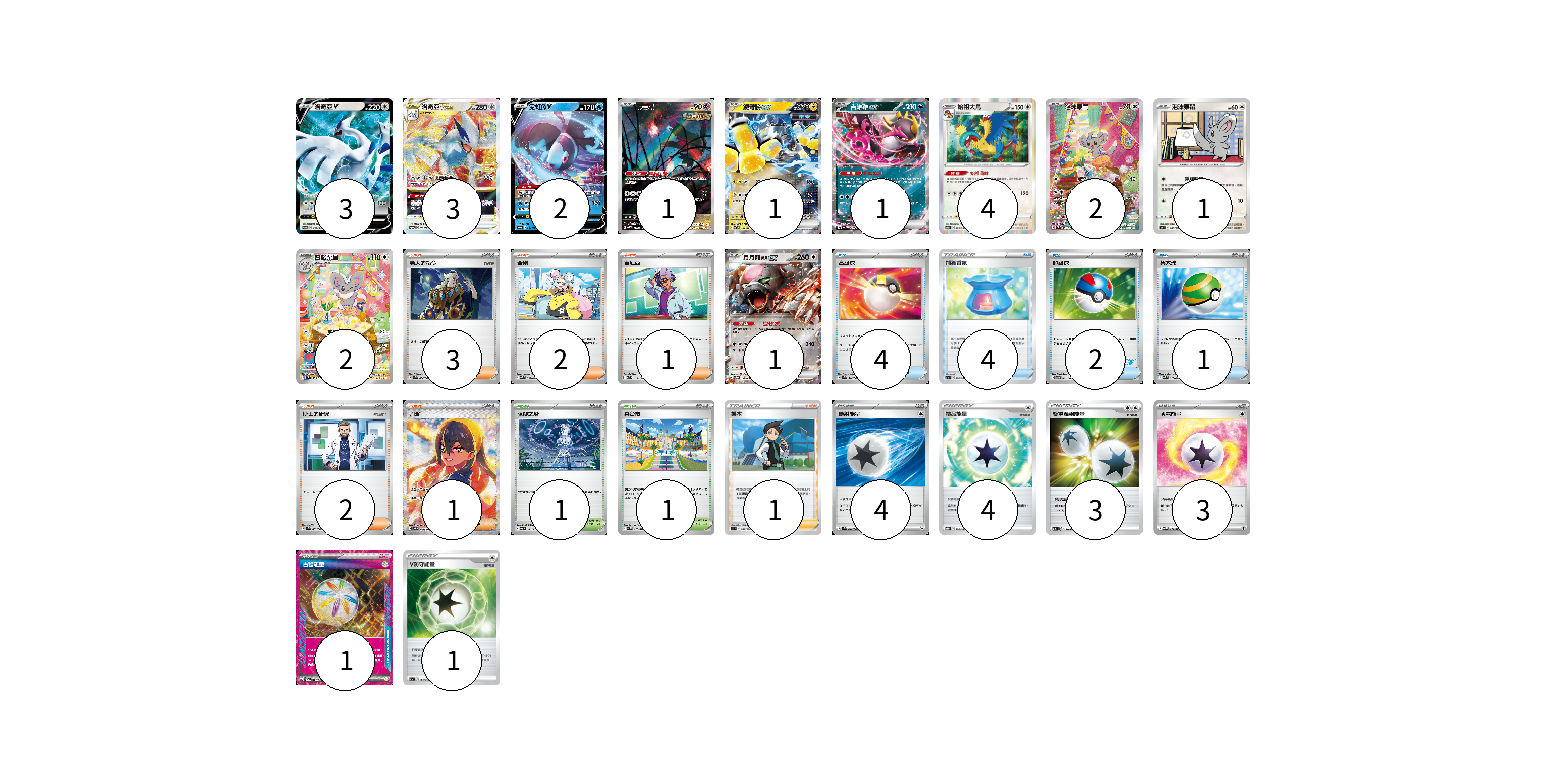 牌組構築方案 以此牌組為基礎新構築牌組 顯示卡面 顯示列表 寶可夢卡(21) 3 3 2 1 1 1 4 2 1 2 1 物品卡(11) 4 4 2 1 支援者卡(10) 3 2 1 2 1 1 競技場卡(2) 1 1 能量卡(16) 4 4 3 3 1 1 寶可夢卡(21) 卡牌名稱 張數 卡牌名稱 張數 洛奇亞V S-P 219/S-P 03 洛奇亞VSTAR SV-P 163/SV-P 03 霓虹魚V SVHK 004/022 02 振翼髮 SV5K 076/071 01 鐵臂膀ex SVTR 007/021 01 吉雉雞ex SV6a 038/064 01 始祖大鳥 S12 083/098 04 泡沫栗鼠 SV5K 082/071 02 泡沫栗鼠 S9 085/100 01 奇諾栗鼠 SV5K 083/071 02 月月熊 赫月 ex SV5a 052/066 01 物品卡(11) 卡牌名稱 張數 卡牌名稱 張數 高級球 SVK 018/042 04 捕獲香氛 S11a 060/068 04 超級球 SVI 052/066 02 巢穴球 SVK 016/042 01 支援者卡(10) 卡牌名稱 張數 卡牌名稱 張數 老大的指令 SVK 036/042 03 奇樹 SVK 031/042 02 吉尼亞 SVD 129/139 01 博士的研究 SVK 033/042 02 丹瑜 SV6 130/101 01 捩木 S11 097/100 01 競技場卡(2) 卡牌名稱 張數 卡牌名稱 張數 阻礙之塔 SV6 100/101 01 桌台市 SV1V 078/078 01 能量卡(16) 卡牌名稱 張數 卡牌名稱 張數 噴射能量 SVK 040/042 04 禮品能量 S11 100/100 04 雙重渦輪能量 SVTM 022/022 03 薄霧能量 SV5M 071/071 03 古舊能量 SV6 101/101 01 V防守能量 S11a 068/068 01 以此牌組為基礎新構築牌組 牌組編碼 uanYfj-DovBBd-ZKNMjS copy 列印牌組單 牌組編碼已複製 分享至SNS