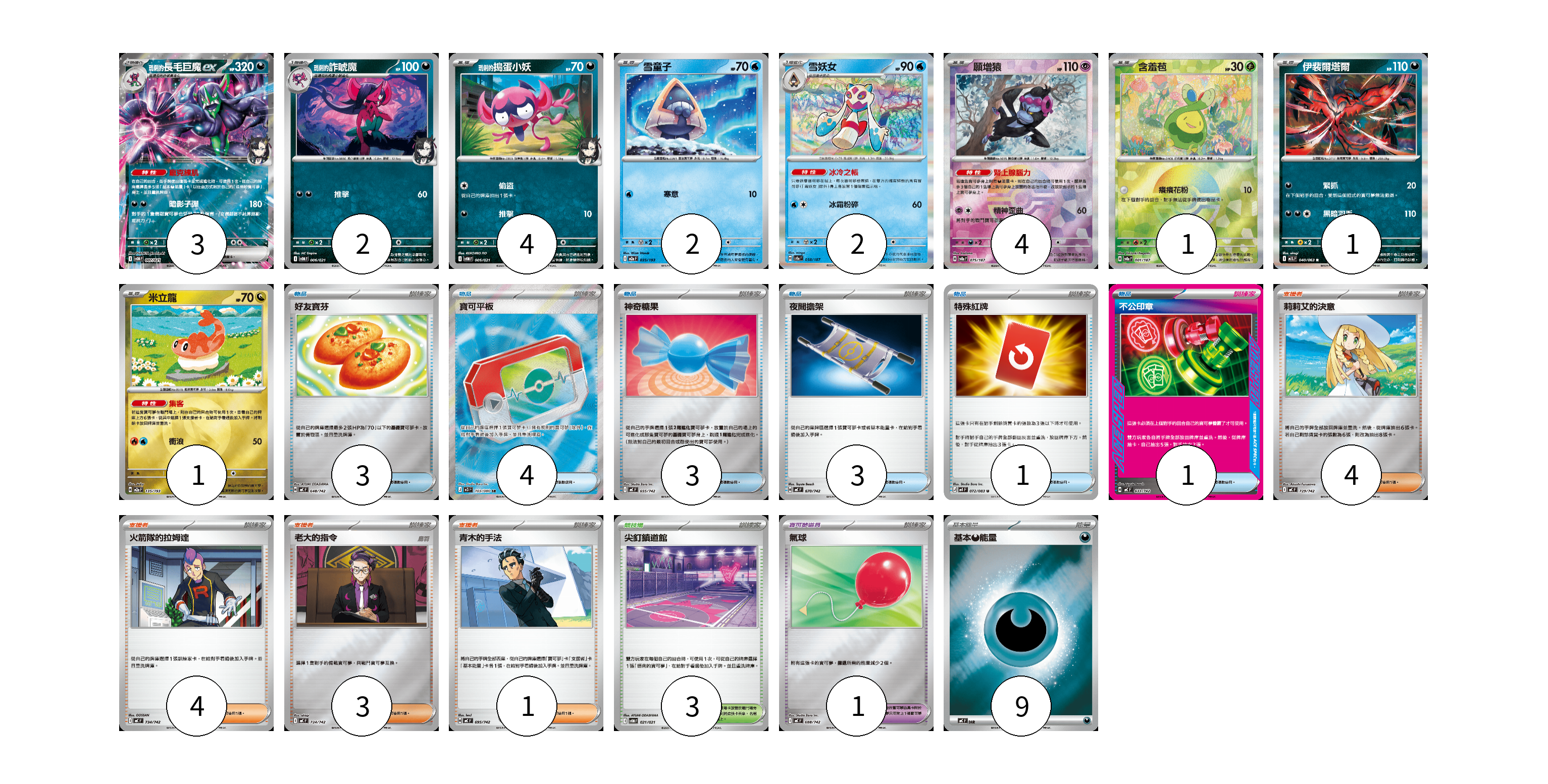 牌組構築方案 以此牌組為基礎新構築牌組 顯示卡面 顯示列表 寶可夢卡(20) 3 2 4 2 2 4 1 1 1 寶可夢道具(1) 1 物品卡(15) 3 4 3 3 1 1 支援者卡(12) 4 4 3 1 競技場卡(3) 3 能量卡(9) 9 寶可夢卡(20) 卡牌名稱 張數 卡牌名稱 張數 <瑪俐的>長毛巨魔ex SVOM 007/021 03 <瑪俐的>詐唬魔 SVOM 006/021 02 <瑪俐的>搗蛋小妖 SVOM 005/021 04 雪童子 M2a 035/193 02 雪妖女 SV8a 038/187 02 願增猿 SV8a 075/187 04 含羞苞 SV8a 001/187 01 伊裴爾塔爾 M1L 040/063 01 米立龍 M2a 135/193 01 寶可夢道具(1) 卡牌名稱 張數 卡牌名稱 張數 氣球 MC 688/742 01 物品卡(15) 卡牌名稱 張數 卡牌名稱 張數 好友寶芬 MC 648/742 03 寶可平板 M3 103/080 04 神奇糖果 MC 655/742 03 夜間擔架 MC 670/742 03 特殊紅牌 M4 072/083 01 不公印章 MC 633/742 01 支援者卡(12) 卡牌名稱 張數 卡牌名稱 張數 莉莉艾的決意 MC 729/742 04 火箭隊的拉姆達 MC 734/742 04 老大的指令 MC 724/742 03 青木的手法 MC 695/742 01 競技場卡(3) 卡牌名稱 張數 卡牌名稱 張數 尖釘鎮道館 SVOM 021/021 03 能量卡(9) 卡牌名稱 張數 卡牌名稱 張數 基本【惡】能量 MC DAR 09 以此牌組為基礎新構築牌組 牌組編碼 ubJJOl-gCQwxb-GPWQWU copy 列印牌組單 牌組編碼已複製 分享至SNS