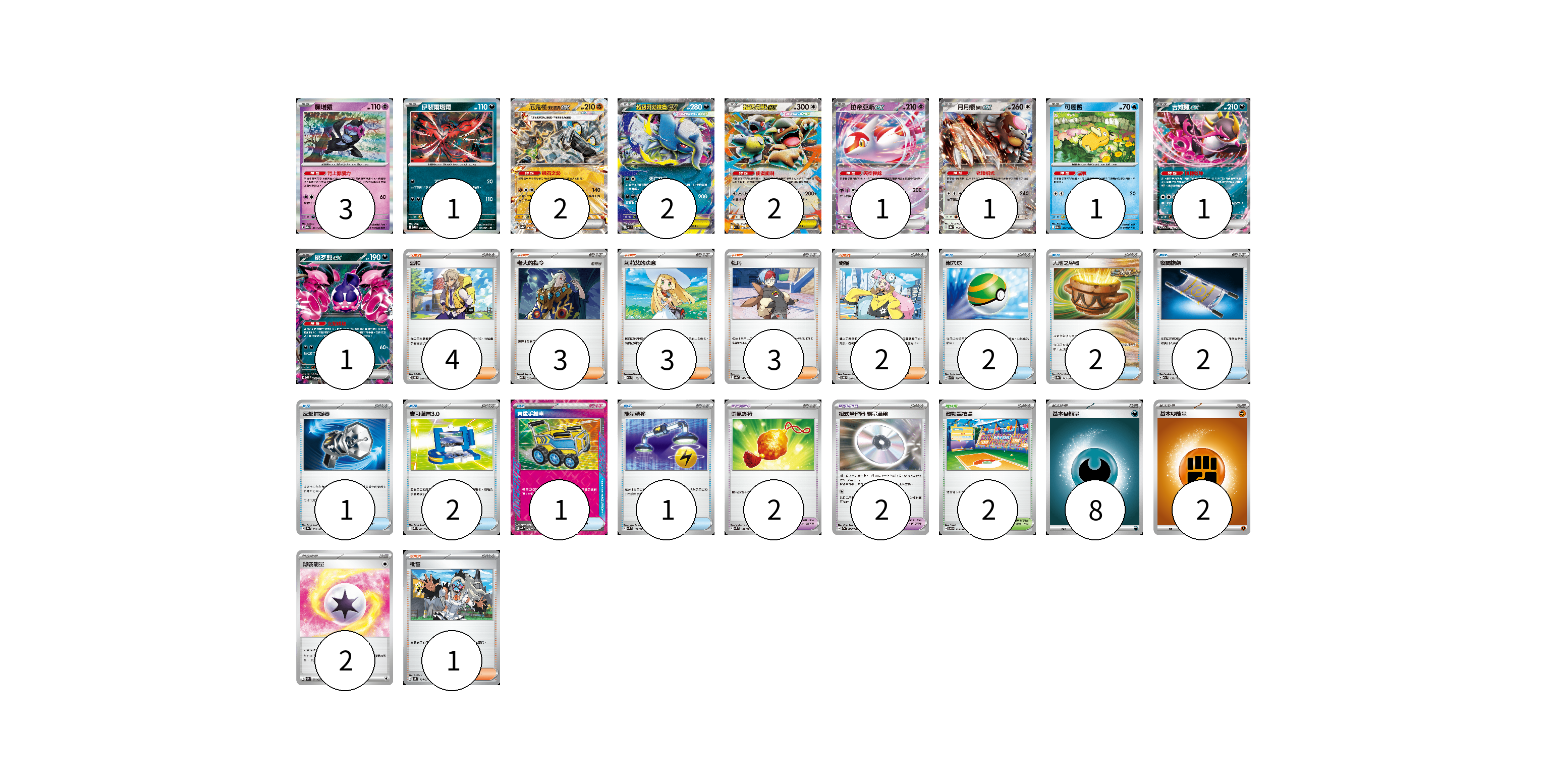 牌組構築方案 以此牌組為基礎新構築牌組 顯示卡面 顯示列表 寶可夢卡(15) 3 1 2 2 2 1 1 1 1 1 寶可夢道具(4) 2 2 物品卡(11) 2 2 2 1 2 1 1 支援者卡(16) 4 3 3 3 2 1 競技場卡(2) 2 能量卡(12) 8 2 2 寶可夢卡(15) 卡牌名稱 張數 卡牌名稱 張數 願增猿 M2a 081/193 03 伊裴爾塔爾 M1L 040/063 01 厄鬼椪 礎石面具ex SV8a 091/187 02 超級阿勃梭魯ex M1L 038/063 02 超級袋獸ex M1S 051/063 02 拉帝亞斯ex M2a 075/193 01 月月熊 赫月ex SV8a 134/187 01 可達鴨 M2a 032/193 01 吉雉雞ex M2a 114/193 01 桃歹郎ex MBG 009/022 01 寶可夢道具(4) 卡牌名稱 張數 卡牌名稱 張數 勇氣護符 SVM 142/175 02 招式學習器 能量渦輪 SV3a 056/062 02 物品卡(11) 卡牌名稱 張數 卡牌名稱 張數 巢穴球 SVK 016/042 02 大地之容器 SV8a 143/187 02 夜間擔架 M2a 159/193 02 反擊捕捉器 SV8a 139/187 01 寶可裝置3.0 SV11B 081/086 02 貴重手推車 SVK 020/042 01 能量轉移 SVM 127/175 01 支援者卡(16) 卡牌名稱 張數 卡牌名稱 張數 派帕 SVOD 018/020 04 老大的指令 MBD 020/022 03 莉莉艾的決意 M2a 175/193 03 牡丹 SV4a 182/190 03 奇樹 SVOD 016/020 02 枇琶 SV5K 068/071 01 競技場卡(2) 卡牌名稱 張數 卡牌名稱 張數 激動競技場 SV8 105/106 02 能量卡(12) 卡牌名稱 張數 卡牌名稱 張數 基本【惡】能量 MBG DAR 08 基本【鬥】能量 M-P FIG 02 薄霧能量 SV5M 071/071 02 以此牌組為基礎新構築牌組 牌組編碼 ucjvnn-hmDXvo-nCnghL copy 列印牌組單 牌組編碼已複製 分享至SNS