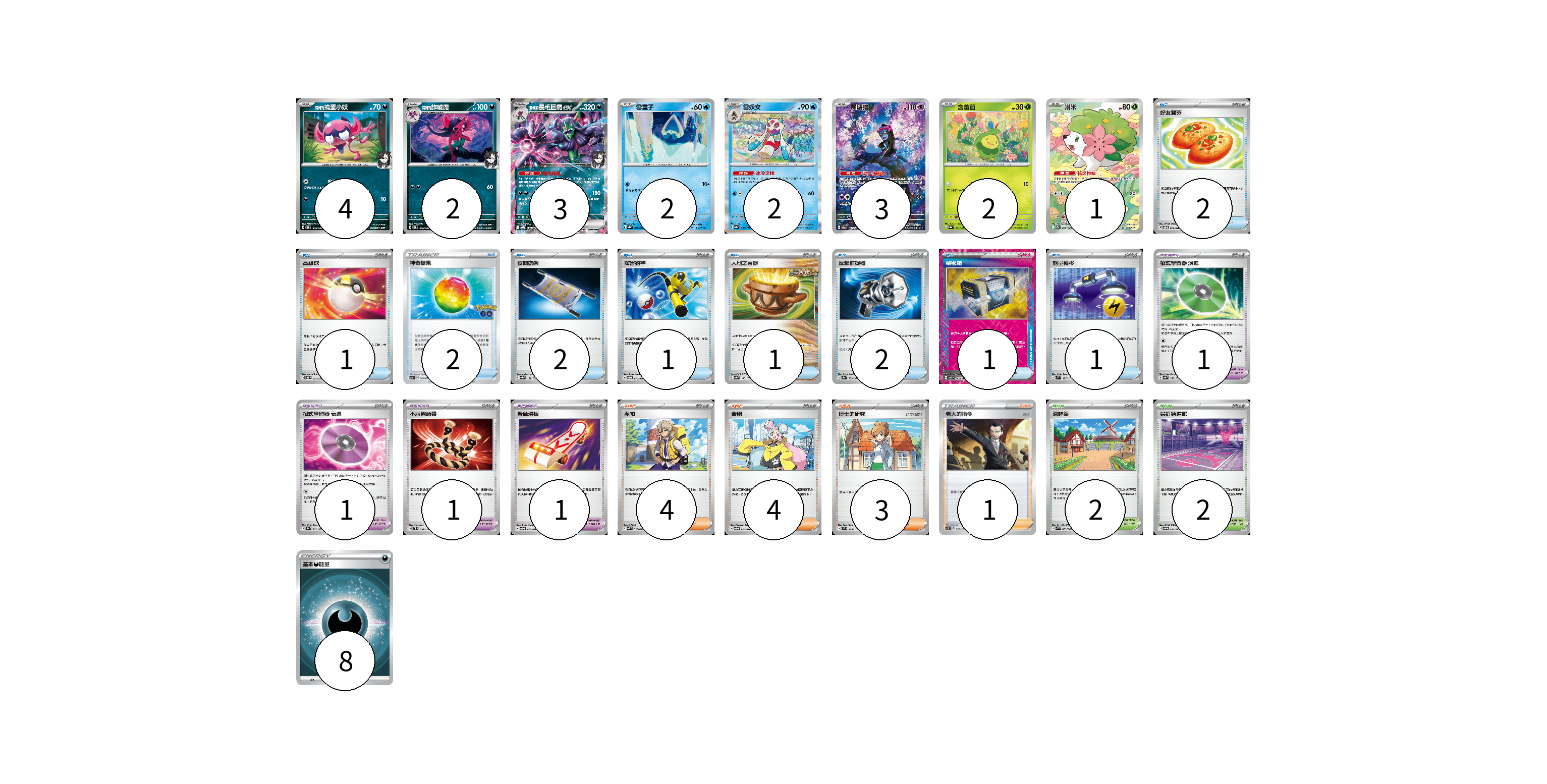 牌組構築方案 以此牌組為基礎新構築牌組 顯示卡面 顯示列表 寶可夢卡(19) 4 2 3 2 2 3 2 1 寶可夢道具(4) 1 1 1 1 物品卡(13) 2 1 2 2 1 1 2 1 1 支援者卡(12) 4 4 3 1 競技場卡(4) 2 2 能量卡(8) 8 寶可夢卡(19) 卡牌名稱 張數 卡牌名稱 張數 <瑪俐的>搗蛋小妖 SVOM 005/021 04 <瑪俐的>詐唬魔 SVOM 006/021 02 <瑪俐的>長毛巨魔ex SVOM 007/021 03 雪童子 SV3a 005/062 02 雪妖女 SV8a 038/187 02 願增猿 SV6 107/101 03 含羞苞 SV8a 001/187 02 謝米 SV9a 066/063 01 寶可夢道具(4) 卡牌名稱 張數 卡牌名稱 張數 招式學習器 演進 SV8a 160/187 01 招式學習器 衰退 SV8a 161/187 01 不服輸頭帶 SVTL 016/021 01 緊急滑板 SVOD 015/020 01 物品卡(13) 卡牌名稱 張數 卡牌名稱 張數 好友寶芬 SVOD 011/020 02 高級球 SVOD 012/020 01 神奇糖果 S10b 066/071 02 夜間擔架 SV8a 151/187 02 厲害釣竿 SVOD 010/020 01 大地之容器 SV8a 143/187 01 反擊捕捉器 SV8a 139/187 02 秘密箱 SV6 092/101 01 能量轉移 SVM 127/175 01 支援者卡(12) 卡牌名稱 張數 卡牌名稱 張數 派帕 SVK 035/042 04 奇樹 SVOD 016/020 04 博士的研究 SVM 166/175 03 老大的指令(坂木) SC1b 148/153 01 競技場卡(4) 卡牌名稱 張數 卡牌名稱 張數 深缽鎮 SVK 039/042 02 尖釘鎮道館 SVOM 021/021 02 能量卡(8) 卡牌名稱 張數 卡牌名稱 張數 基本惡能量 SLD DAR 08 以此牌組為基礎新構築牌組 牌組編碼 udTilA-Ebinzq-SYgZIc copy 列印牌組單 牌組編碼已複製 分享至SNS