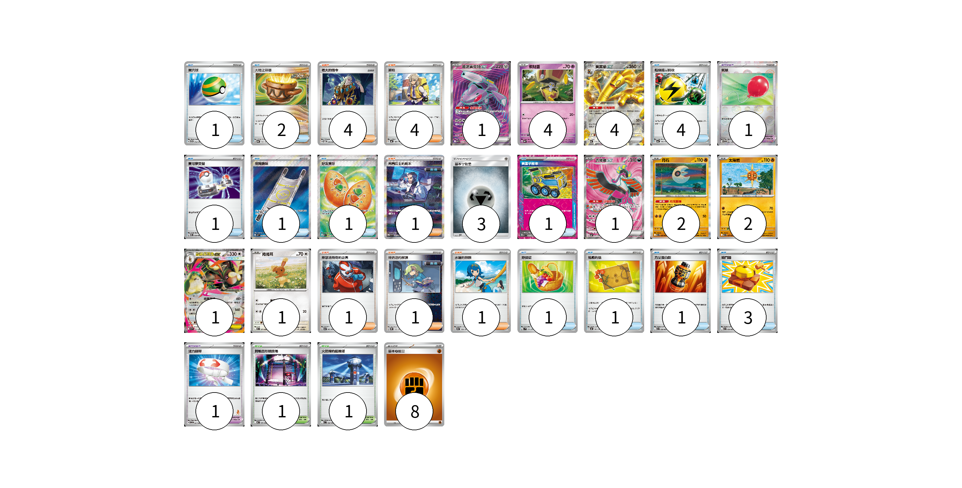 牌組構築方案 以此牌組為基礎新構築牌組 顯示卡面 顯示列表 寶可夢卡(16) 1 4 4 1 2 2 1 1 寶可夢道具(2) 1 1 物品卡(17) 1 2 4 1 1 1 1 1 1 1 3 支援者卡(12) 4 4 1 1 1 1 競技場卡(2) 1 1 能量卡(11) 3 8 寶可夢卡(16) 卡牌名稱 張數 卡牌名稱 張數 蓋諾賽克特ex SV11B 164/086 01 索財靈 SV8a 073/187 04 賽富豪ex SV8a 117/187 04 吉雉雞ex SV6a 081/064 01 月石 M1L 026/063 02 太陽岩 M1L 027/063 02 超級長耳兔ex M2 072/080 01 捲捲耳 M2 071/080 01 寶可夢道具(2) 卡牌名稱 張數 卡牌名稱 張數 氣球 SV11B 082/086 01 活力頭帶 SVI 057/066 01 物品卡(17) 卡牌名稱 張數 卡牌名稱 張數 巢穴球 SVTG 012/019 01 大地之容器 SV8a 143/187 02 超級能量回收 SV4a 157/190 04 寶可夢交替 SV9a 058/063 01 夜間擔架 M1L 083/063 01 好友寶芬 M1S 081/063 01 貴重手推車 SVK 020/042 01 野餐籃 SV1V 071/078 01 勉勵的信 SV4a 162/190 01 力量蛋白飲 M1L 058/063 01 戰鬥鑼 M1L 059/063 03 支援者卡(12) 卡牌名稱 張數 卡牌名稱 張數 老大的指令 SVOD 019/020 04 派帕 SV4a 180/190 04 弗圖博士的劇本 SV4M 091/066 01 庫瑟洛斯奇的企圖 SV6a 062/064 01 暗碼迷的解讀 SV8a 165/187 01 水蓮的照顧 SV8a 168/187 01 競技場卡(2) 卡牌名稱 張數 卡牌名稱 張數 對戰圓形競技場 M2 079/080 01 火箭隊的監視塔 SV10 096/098 01 能量卡(11) 卡牌名稱 張數 卡牌名稱 張數 基本鋼能量 AS6D MET 03 基本【鬥】能量 SVTG FIG 08 以此牌組為基礎新構築牌組 牌組編碼 ugFfAt-IZUtdW-ApVvDc copy 列印牌組單 牌組編碼已複製 分享至SNS