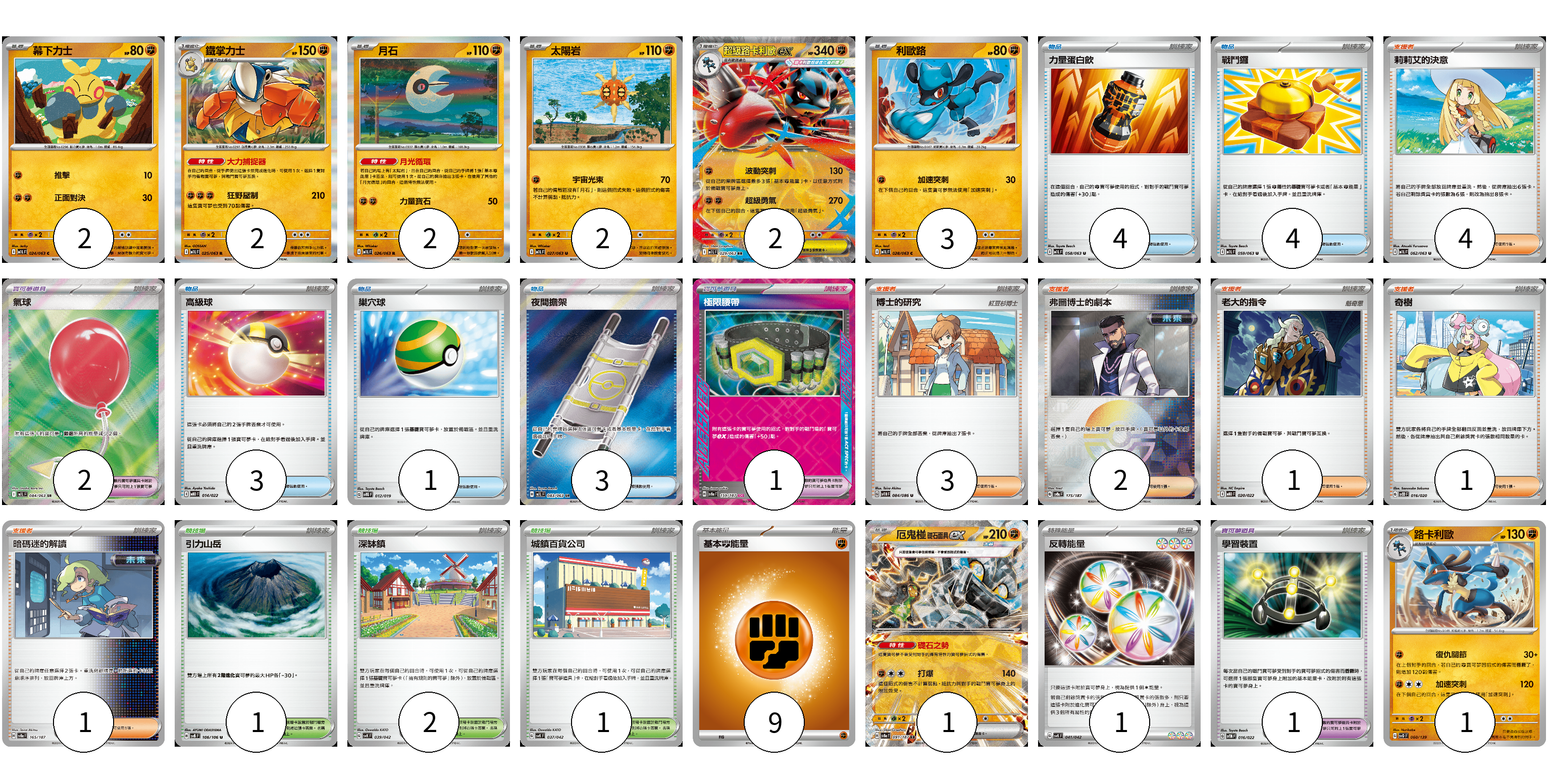 牌組構築方案 以此牌組為基礎新構築牌組 顯示卡面 顯示列表 寶可夢卡(15) 2 2 2 2 2 3 1 1 寶可夢道具(4) 2 1 1 物品卡(15) 4 4 3 1 3 支援者卡(12) 4 3 2 1 1 1 競技場卡(4) 1 2 1 能量卡(10) 9 1 寶可夢卡(15) 卡牌名稱 張數 卡牌名稱 張數 幕下力士 M1L 024/063 02 鐵掌力士 M1L 025/063 02 月石 M1L 026/063 02 太陽岩 M1L 027/063 02 超級路卡利歐ex M1L 029/063 02 利歐路 M1L 028/063 03 厄鬼椪 礎石面具ex SV8a 091/187 01 路卡利歐 SVD 060/139 01 寶可夢道具(4) 卡牌名稱 張數 卡牌名稱 張數 氣球 M1L 084/063 02 極限腰帶 SV8a 159/187 01 學習裝置 SVTM 016/022 01 物品卡(15) 卡牌名稱 張數 卡牌名稱 張數 力量蛋白飲 M1L 058/063 04 戰鬥鑼 M1L 059/063 04 高級球 MBD 014/022 03 巢穴球 SVTG 012/019 01 夜間擔架 M1L 083/063 03 支援者卡(12) 卡牌名稱 張數 卡牌名稱 張數 莉莉艾的決意 M1L 062/063 04 博士的研究 SV11B 084/086 03 弗圖博士的劇本 SV8a 175/187 02 老大的指令 MBD 020/022 01 奇樹 SVOD 016/020 01 暗碼迷的解讀 SV8a 165/187 01 競技場卡(4) 卡牌名稱 張數 卡牌名稱 張數 引力山岳 SV8 106/106 01 深缽鎮 SVK 039/042 02 城鎮百貨公司 SVK 037/042 01 能量卡(10) 卡牌名稱 張數 卡牌名稱 張數 基本【鬥】能量 M-P FIG 09 反轉能量 SVK 041/042 01 以此牌組為基礎新構築牌組 牌組編碼 uhFSom-ueVaek-nokuFQ copy 列印牌組單 牌組編碼已複製 分享至SNS