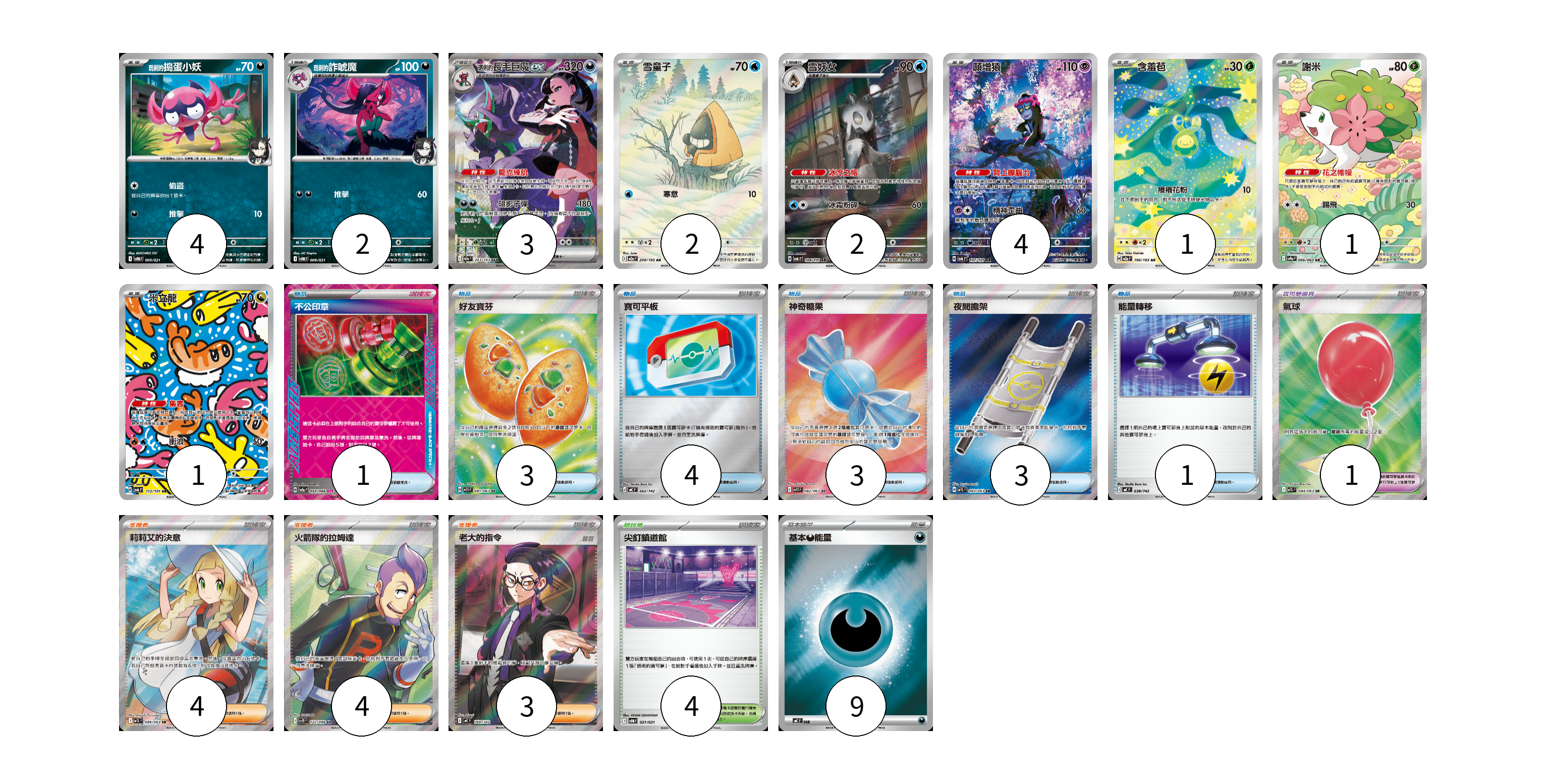 牌組構築方案 以此牌組為基礎新構築牌組 顯示卡面 顯示列表 寶可夢卡(20) 4 2 3 2 2 4 1 1 1 寶可夢道具(1) 1 物品卡(15) 1 3 4 3 3 1 支援者卡(11) 4 4 3 競技場卡(4) 4 能量卡(9) 9 寶可夢卡(20) 卡牌名稱 張數 卡牌名稱 張數 <瑪俐的>搗蛋小妖 SVOM 005/021 04 <瑪俐的>詐唬魔 SVOM 006/021 02 <瑪俐的>長毛巨魔ex M2a 243/193 03 雪童子 M2a 200/193 02 雪妖女 SV6 104/101 02 願增猿 SV6 107/101 04 含羞苞 M2a 196/193 01 謝米 SV9a 066/063 01 米立龍 SV6 112/101 01 寶可夢道具(1) 卡牌名稱 張數 卡牌名稱 張數 氣球 M1L 084/063 01 物品卡(15) 卡牌名稱 張數 卡牌名稱 張數 不公印章 SV5a 053/066 01 好友寶芬 M1S 081/063 03 寶可平板 MC 662/742 04 神奇糖果 M1S 082/063 03 夜間擔架 M1L 083/063 03 能量轉移 MC 638/742 01 支援者卡(11) 卡牌名稱 張數 卡牌名稱 張數 莉莉艾的決意 M1L 086/063 04 火箭隊的拉姆達 SV10 122/098 04 老大的指令(烏羽) MC 760/742 03 競技場卡(4) 卡牌名稱 張數 卡牌名稱 張數 尖釘鎮道館 SVOM 021/021 04 能量卡(9) 卡牌名稱 張數 卡牌名稱 張數 基本【惡】能量 MC DAR 09 以此牌組為基礎新構築牌組 牌組編碼 uheNks-TjFYwc-apQAJC copy 列印牌組單 牌組編碼已複製 分享至SNS
