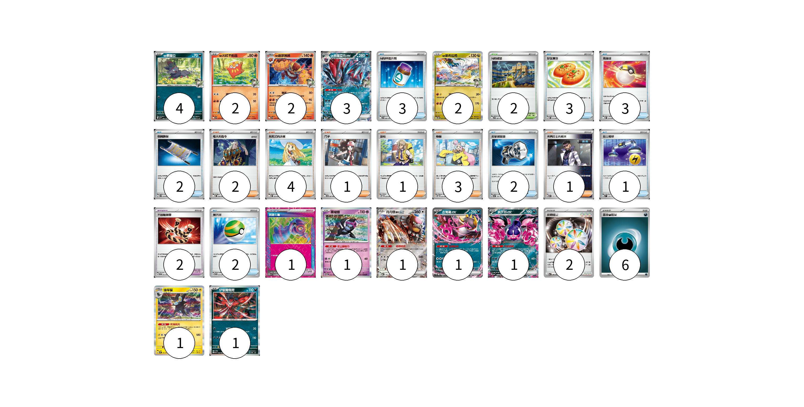 牌組構築方案 以此牌組為基礎新構築牌組 顯示卡面 顯示列表 寶可夢卡(19) 4 2 2 3 2 1 1 1 1 1 1 寶可夢道具(3) 2 1 物品卡(16) 3 3 3 2 2 1 2 支援者卡(12) 2 4 1 1 3 1 競技場卡(2) 2 能量卡(8) 2 6 寶可夢卡(19) 卡牌名稱 張數 卡牌名稱 張數 N的索羅亞 SV9 060/100 04 N的火紅不倒翁 SV9 015/100 02 N的達摩狒狒 SV9 016/100 02 N的索羅亞克ex SV9 061/100 03 N的萊希拉姆 SV9 074/100 02 願增猿 SV6 055/101 01 月月熊 赫月ex SV8a 134/187 01 吉雉雞ex SVOD 004/020 01 桃歹郎ex SV6a 039/064 01 倫琴貓 SV2D 021/071 01 伊裴爾塔爾 M1L 040/063 01 寶可夢道具(3) 卡牌名稱 張數 卡牌名稱 張數 不服輸頭帶 SVTL 016/021 02 英雄斗篷 SV5M 064/071 01 物品卡(16) 卡牌名稱 張數 卡牌名稱 張數 N的PP提升劑 SV9 089/100 03 好友寶芬 MBD 013/022 03 高級球 MBD 014/022 03 夜間擔架 MBD 016/022 02 反擊捕捉器 SV8a 139/187 02 能量轉移 SVM 127/175 01 巢穴球 SVTR 013/021 02 支援者卡(12) 卡牌名稱 張數 卡牌名稱 張數 老大的指令 MBD 020/022 02 莉莉艾的決意 MBD 021/022 04 鬥子 SV11W 085/086 01 派帕 SVOD 018/020 01 奇樹 SVOD 016/020 03 弗圖博士的劇本 SV8a 175/187 01 競技場卡(2) 卡牌名稱 張數 卡牌名稱 張數 N的城堡 SV9 097/100 02 能量卡(8) 卡牌名稱 張數 卡牌名稱 張數 反轉能量 SV4a 189/190 02 基本【惡】能量 SVB DAR 06 以此牌組為基礎新構築牌組 牌組編碼 uitDJr-DTbKGq-VcrkAR copy 列印牌組單 牌組編碼已複製 分享至SNS