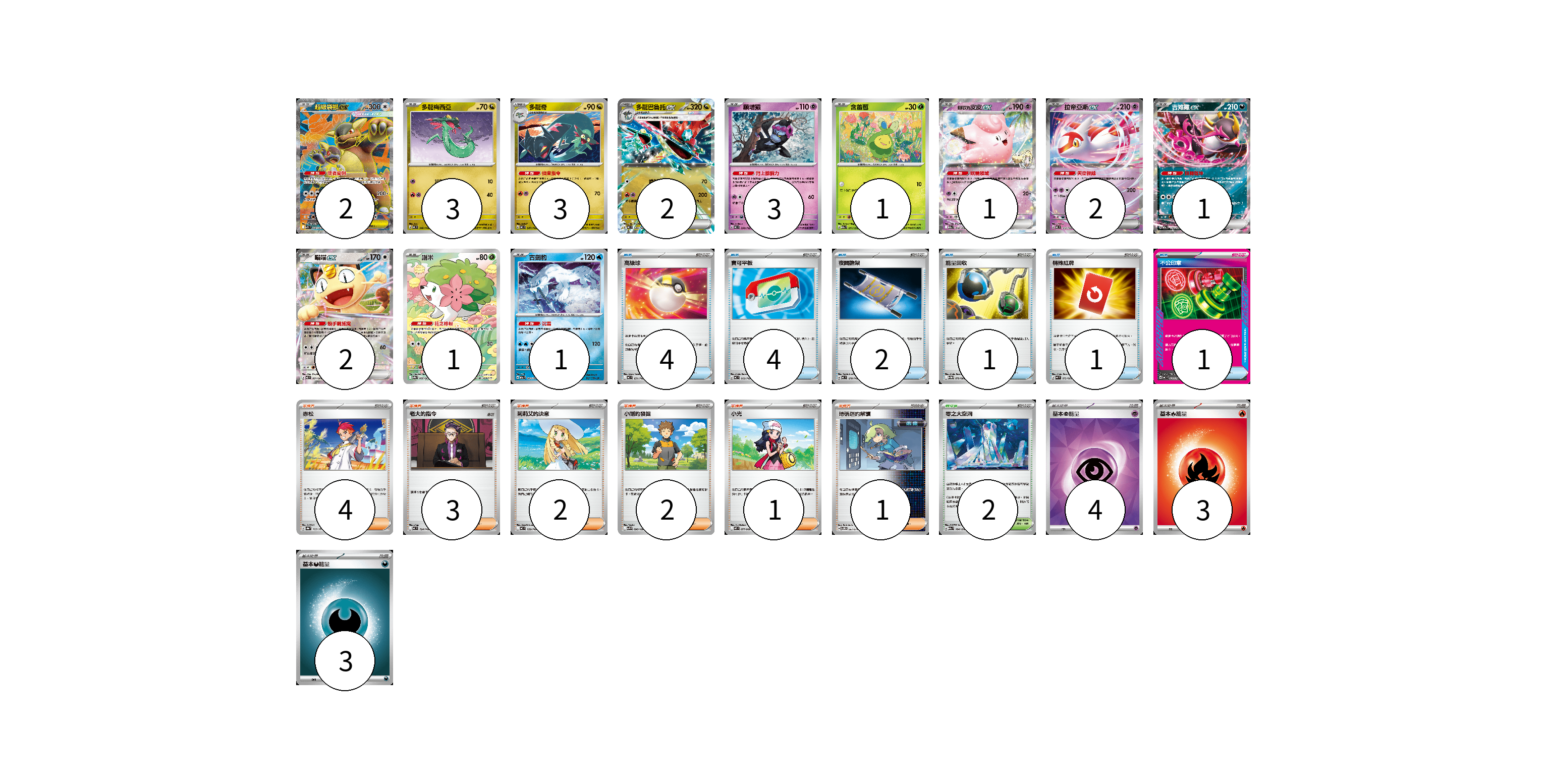 牌組構築方案 以此牌組為基礎新構築牌組 顯示卡面 顯示列表 寶可夢卡(22) 2 3 3 2 3 1 1 2 1 2 1 1 物品卡(13) 4 4 2 1 1 1 支援者卡(13) 4 3 2 2 1 1 競技場卡(2) 2 能量卡(10) 4 3 3 寶可夢卡(22) 卡牌名稱 張數 卡牌名稱 張數 超級袋獸ex M1S 080/063 02 多龍梅西亞 MC 546/742 03 多龍奇 MC 547/742 03 多龍巴魯托ex MC 548/742 02 願增猿 MC 358/742 03 含羞苞 M2a 011/193 01 莉莉艾的皮皮ex M2a 060/193 01 拉帝亞斯ex MC 312/742 02 吉雉雞ex M2a 114/193 01 喵喵ex M3 061/080 02 謝米 SV9a 066/063 01 古劍豹 M2a 043/193 01 物品卡(13) 卡牌名稱 張數 卡牌名稱 張數 高級球 MC 651/742 04 寶可平板 MC 662/742 04 夜間擔架 MC 670/742 02 能量回收 SV11W 079/086 01 特殊紅牌 M4 072/083 01 不公印章 MC 633/742 01 支援者卡(13) 卡牌名稱 張數 卡牌名稱 張數 赤松 SV8a 163/187 04 老大的指令 MC 724/742 03 莉莉艾的決意 MC 729/742 02 小剛的發掘 SV9 096/100 02 小光 M2 077/080 01 暗碼迷的解讀 SV5M 067/071 01 競技場卡(2) 卡牌名稱 張數 卡牌名稱 張數 零之大空洞 M2a 184/193 02 能量卡(10) 卡牌名稱 張數 卡牌名稱 張數 基本【超】能量 SVOD PSY 04 基本【火】能量 MC FIR 03 基本【惡】能量 MC DAR 03 以此牌組為基礎新構築牌組 牌組編碼 ulQgKe-jTGWSv-kXGOYk copy 列印牌組單 牌組編碼已複製 分享至SNS