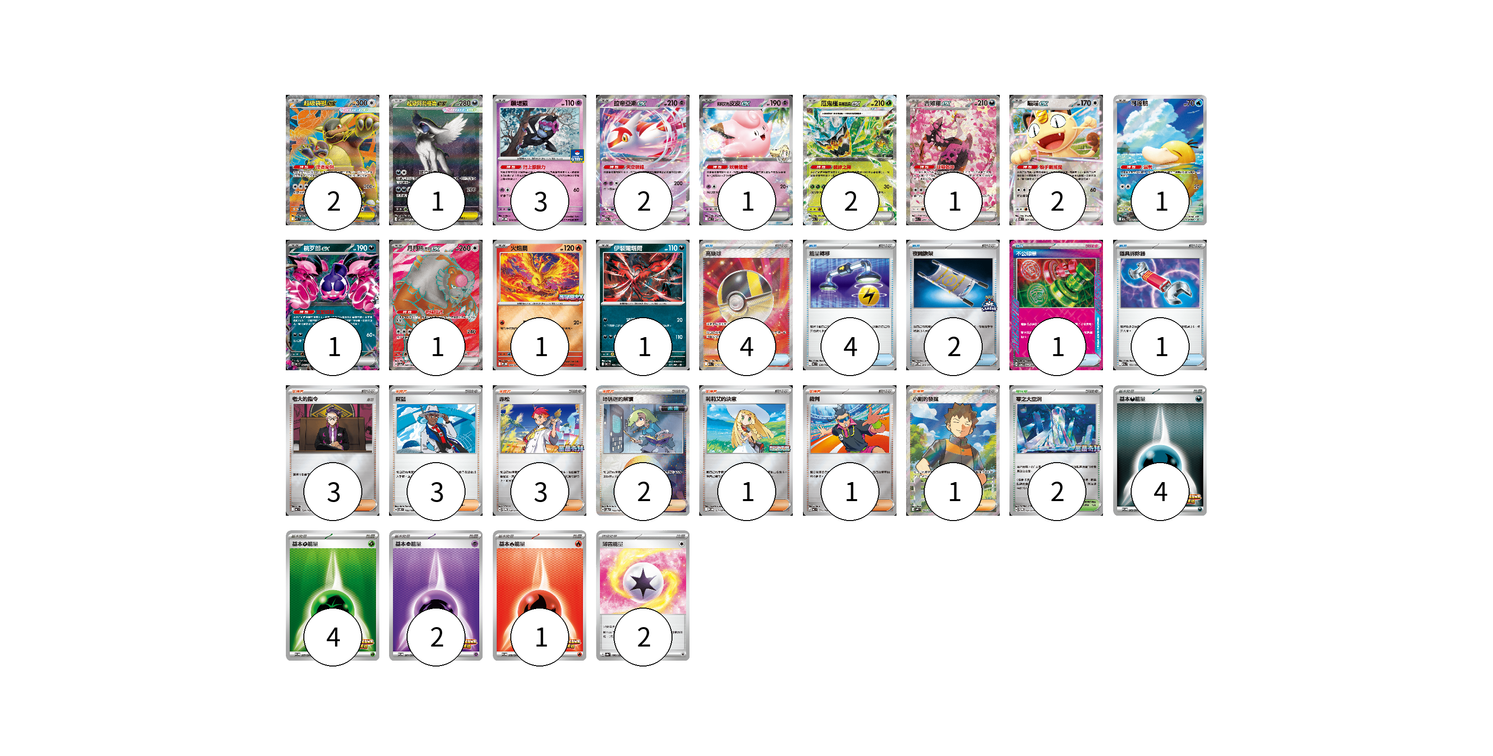 牌組構築方案 以此牌組為基礎新構築牌組 顯示卡面 顯示列表 寶可夢卡(19) 2 1 3 2 1 2 1 2 1 1 1 1 1 物品卡(12) 4 4 2 1 1 支援者卡(14) 3 3 3 2 1 1 1 競技場卡(2) 2 能量卡(13) 4 4 2 1 2 寶可夢卡(19) 卡牌名稱 張數 卡牌名稱 張數 超級袋獸ex M1S 080/063 02 超級阿勃梭魯ex M1L 089/063 01 願增猿 M-P 014/M-P 03 拉帝亞斯ex M2a 075/193 02 莉莉艾的皮皮ex MC 287/742 01 厄鬼椪 碧草面具ex M2a 017/193 02 吉雉雞ex M2a 244/193 01 喵喵ex M3 061/080 02 可達鴨 M2a 199/193 01 桃歹郎ex MC 491/742 01 月月熊 赫月 ex SV5a 084/066 01 火焰鳥 M-P 022/M-P 01 伊裴爾塔爾 MC 481/742 01 物品卡(12) 卡牌名稱 張數 卡牌名稱 張數 高級球 M2a 216/193 04 能量轉移 MC 638/742 04 夜間擔架 SV-P 204/SV-P 02 不公印章 SV5a 053/066 01 道具拆除器 M2a 151/193 01 支援者卡(14) 卡牌名稱 張數 卡牌名稱 張數 老大的指令 MC 724/742 03 席藍 SV8 102/106 03 赤松 SV-P 150/SV-P 03 暗碼迷的解讀 SV8a 165/187 02 莉莉艾的決意 M-P 011/M-P 01 裁判 MC 711/742 01 小剛的發掘 SV9 123/100 01 競技場卡(2) 卡牌名稱 張數 卡牌名稱 張數 零之大空洞 SV-P 151/SV-P 02 能量卡(13) 卡牌名稱 張數 卡牌名稱 張數 基本【惡】能量 SV-P 263/SV-P 04 基本【草】能量 SV-P 257/SV-P 04 基本【超】能量 SV-P 261/SV-P 02 基本【火】能量 SV-P 258/SV-P 01 薄霧能量 SV8a 186/187 02 以此牌組為基礎新構築牌組 牌組編碼 ulzeMM-UlXCLH-PPKNTd copy 列印牌組單 牌組編碼已複製 分享至SNS