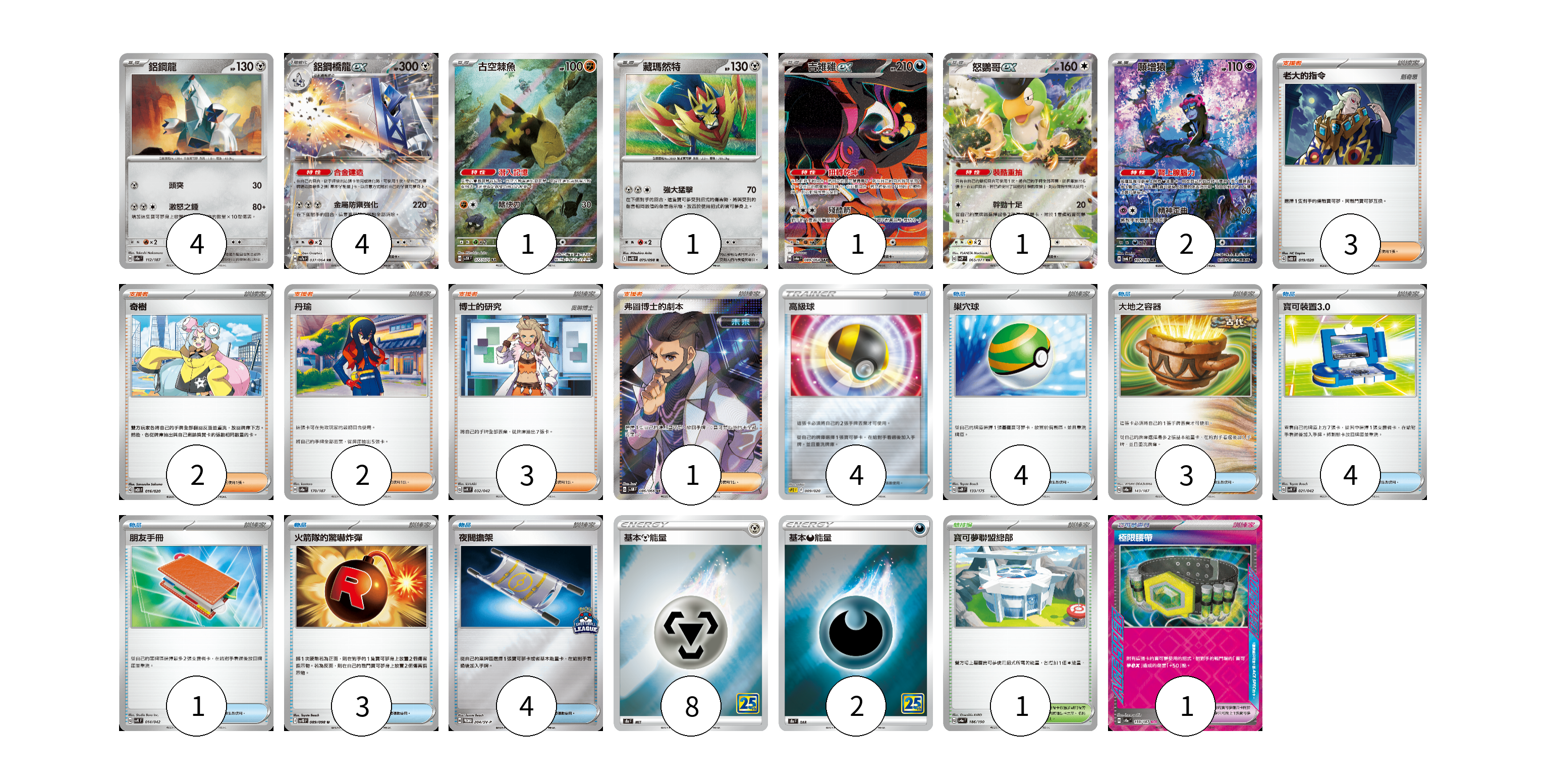 牌組構築方案 以此牌組為基礎新構築牌組 顯示卡面 顯示列表 寶可夢卡(14) 4 4 1 1 1 1 2 寶可夢道具(1) 1 物品卡(23) 4 4 3 4 1 3 4 支援者卡(11) 3 2 2 3 1 競技場卡(1) 1 能量卡(10) 8 2 寶可夢卡(14) 卡牌名稱 張數 卡牌名稱 張數 鋁鋼龍 SV8a 112/187 04 鋁鋼橋龍ex SV7a 037/064 04 古空棘魚 SV5K 077/071 01 藏瑪然特 SV10 075/098 01 吉雉雞ex SV6a 089/064 01 怒鸚哥ex SV2P 065/071 01 願增猿 SV6 107/101 02 寶可夢道具(1) 卡牌名稱 張數 卡牌名稱 張數 極限腰帶 SV8a 159/187 01 物品卡(23) 卡牌名稱 張數 卡牌名稱 張數 高級球 SPZ 009/020 04 巢穴球 SVM 133/175 04 大地之容器 SV8a 143/187 03 寶可裝置3.0 SVK 021/042 04 朋友手冊 SVK 014/042 01 火箭隊的驚嚇炸彈 SV10 089/098 03 夜間擔架 SV-P 204/SV-P 04 支援者卡(11) 卡牌名稱 張數 卡牌名稱 張數 老大的指令 SVOD 019/020 03 奇樹 SVOD 016/020 02 丹瑜 SV8a 170/187 02 博士的研究 SVK 032/042 03 弗圖博士的劇本 SV4M 086/066 01 競技場卡(1) 卡牌名稱 張數 卡牌名稱 張數 寶可夢聯盟總部 SV4a 186/190 01 能量卡(10) 卡牌名稱 張數 卡牌名稱 張數 基本鋼能量 S8a MET 08 基本惡能量 S8a DAR 02 以此牌組為基礎新構築牌組 牌組編碼 umEMYA-PbiufJ-kNFxDQ copy 列印牌組單 牌組編碼已複製 分享至SNS