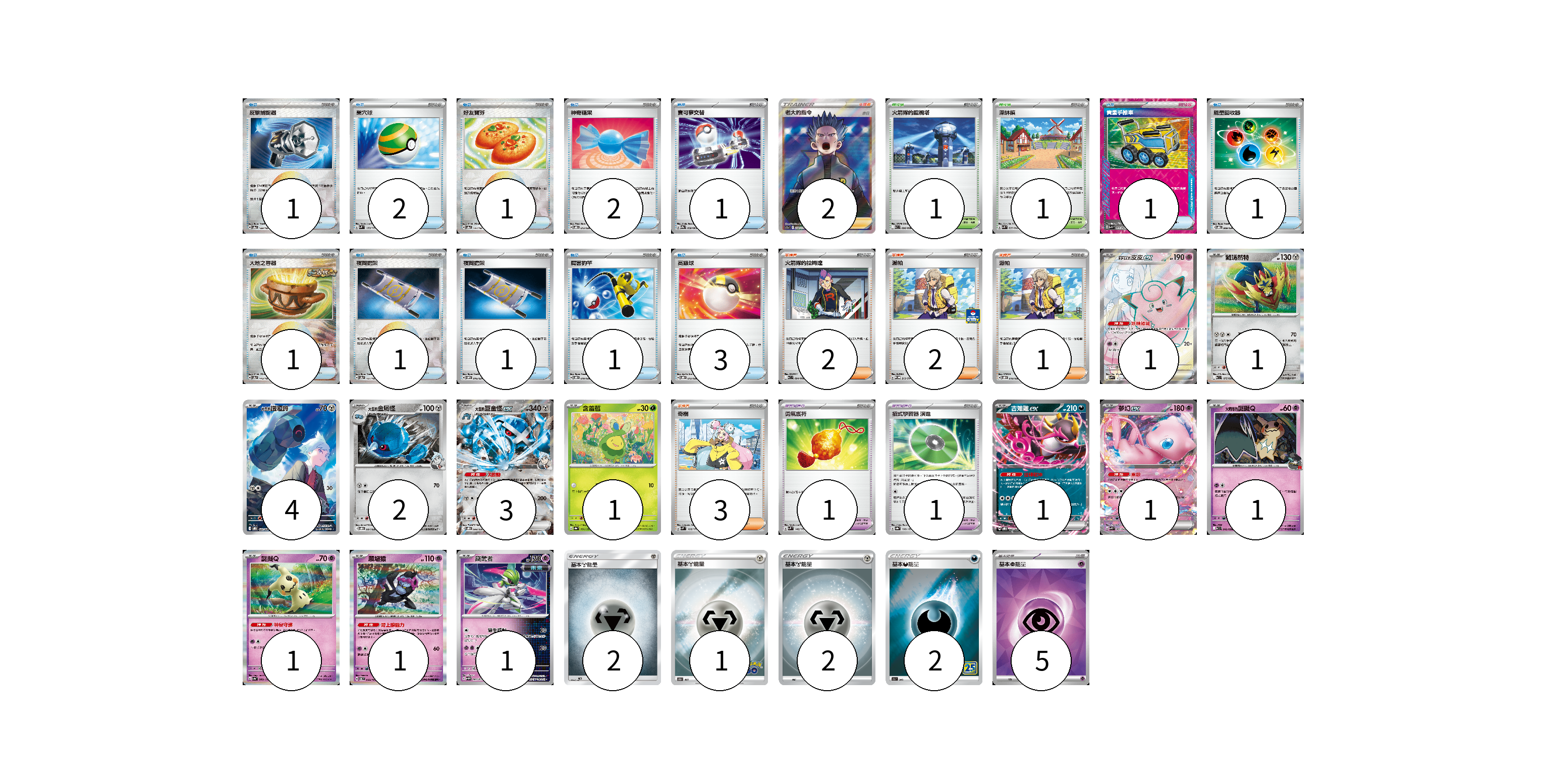 牌組構築方案 以此牌組為基礎新構築牌組 顯示卡面 顯示列表 寶可夢卡(18) 1 1 4 2 3 1 1 1 1 1 1 1 寶可夢道具(2) 1 1 物品卡(16) 1 2 1 2 1 1 1 1 1 1 1 3 支援者卡(10) 2 2 2 1 3 競技場卡(2) 1 1 能量卡(12) 2 1 2 2 5 寶可夢卡(18) 卡牌名稱 張數 卡牌名稱 張數 莉莉艾的皮皮ex SV9 115/100 01 藏瑪然特 SV10 075/098 01 <大吾的>鐵啞鈴 SVOD 021/020 04 <大吾的>金屬怪 SVOD 007/020 02 <大吾的>巨金怪ex SVOD 008/020 03 含羞苞 SV8a 001/187 01 吉雉雞ex SVOD 004/020 01 夢幻ex SVK 001/042 01 <火箭隊的>謎擬Q SV10 042/098 01 謎擬Q SV4a 088/190 01 願增猿 SV6 055/101 01 鐵武者 SVHM 008/022 01 寶可夢道具(2) 卡牌名稱 張數 卡牌名稱 張數 勇氣護符 SVM 142/175 01 招式學習器 演進 SV8a 160/187 01 物品卡(16) 卡牌名稱 張數 卡牌名稱 張數 反擊捕捉器 SV8a 139/187 01 巢穴球 SVM 133/175 02 好友寶芬 SV8a 147/187 01 神奇糖果 SVOD 013/020 02 寶可夢交替 SV9a 058/063 01 貴重手推車 SVK 020/042 01 能量回收器 SVOD 009/020 01 大地之容器 SV8a 143/187 01 夜間擔架 SV8a 151/187 01 夜間擔架 SVOM 016/021 01 厲害釣竿 SVOD 010/020 01 高級球 SVOD 012/020 03 支援者卡(10) 卡牌名稱 張數 卡牌名稱 張數 老大的指令(赤日) S12a 250/172 02 火箭隊的拉姆達 SV10 094/098 02 派帕 SV-P 213/SV-P 02 派帕 SVOD 018/020 01 奇樹 SVM 160/175 03 競技場卡(2) 卡牌名稱 張數 卡牌名稱 張數 火箭隊的監視塔 SV10 096/098 01 深缽鎮 SVK 039/042 01 能量卡(12) 卡牌名稱 張數 卡牌名稱 張數 基本鋼能量 AS6D MET 02 基本鋼能量 S10b MET 01 基本【鋼】能量 SI MET 02 基本惡能量 S8a DAR 02 基本【超】能量 SVOD PSY 05 以此牌組為基礎新構築牌組 牌組編碼 umczjB-CugWaV-MPhtUE copy 列印牌組單 牌組編碼已複製 分享至SNS