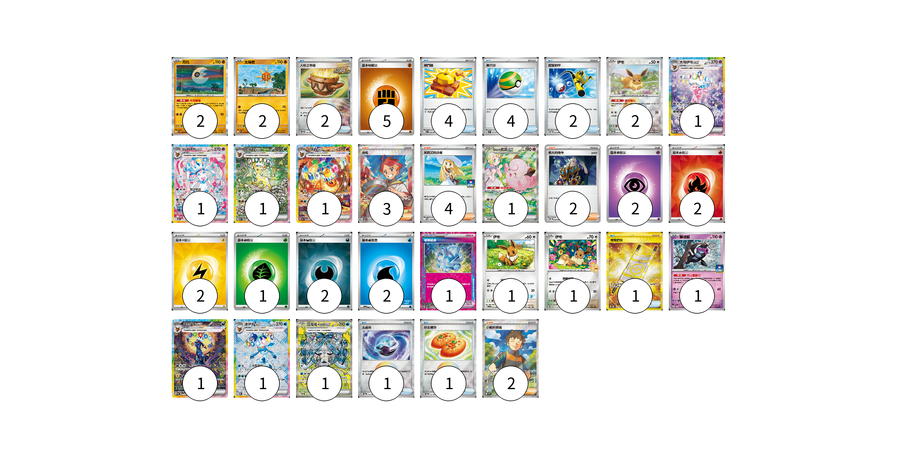 牌組構築方案 以此牌組為基礎新構築牌組 顯示卡面 顯示列表 寶可夢卡(17) 2 2 2 1 1 1 1 1 1 1 1 1 1 1 寶可夢道具(1) 1 物品卡(15) 2 4 4 2 1 1 1 支援者卡(11) 3 4 2 2 能量卡(16) 5 2 2 2 1 2 2 寶可夢卡(17) 卡牌名稱 張數 卡牌名稱 張數 月石 M1L 026/063 02 太陽岩 M1L 027/063 02 伊布 SV8a 125/187 02 太陽伊布ex SV8a 211/187 01 仙子伊布ex SV8a 212/187 01 葉伊布ex SV8a 200/187 01 火伊布ex SV8a 202/187 01 莉莉艾的皮皮ex SV9 126/100 01 伊布 SVI 045/066 01 伊布 SV-P 171/SV-P 01 願增猿 M-P 014/M-P 01 月亮伊布ex SV8a 217/187 01 冰伊布ex SV8a 206/187 01 厄鬼椪 水井面具ex SV8a 208/187 01 寶可夢道具(1) 卡牌名稱 張數 卡牌名稱 張數 璀璨結晶 SV7 094/102 01 物品卡(15) 卡牌名稱 張數 卡牌名稱 張數 大地之容器 SV8a 143/187 02 戰鬥鑼 M1L 059/063 04 巢穴球 SVK 016/042 04 厲害釣竿 SVOM 011/021 02 夜間擔架 SV8 137/106 01 太晶珠 SV8a 145/187 01 好友寶芬 SV8a 147/187 01 支援者卡(11) 卡牌名稱 張數 卡牌名稱 張數 赤松 SV7 123/102 03 莉莉艾的決意 M-P 018/M-P 04 老大的指令 SVOD 019/020 02 小剛的發掘 SV9 123/100 02 能量卡(16) 卡牌名稱 張數 卡牌名稱 張數 基本【鬥】能量 M-P FIG 05 基本【超】能量 M-P PSY 02 基本【火】能量 SVQL FIR 02 基本【雷】能量 SVQP LIG 02 基本【草】能量 M-P GRA 01 基本【惡】能量 SVOM DAR 02 基本【水】能量 SVI WAT 02 以此牌組為基礎新構築牌組 牌組編碼 umePbG-OFizAm-cMmpXI copy 列印牌組單 牌組編碼已複製 分享至SNS