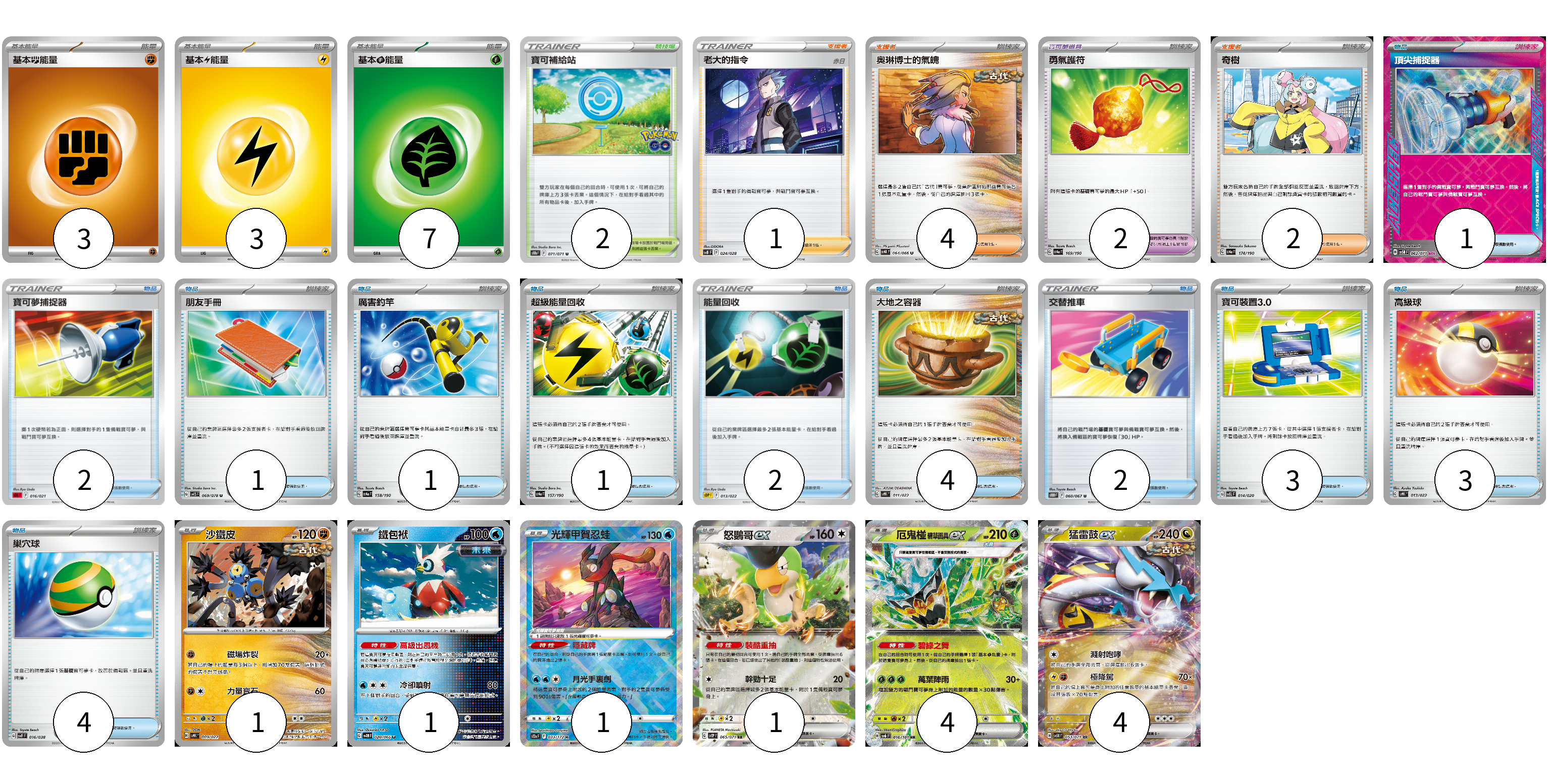牌組構築方案 以此牌組為基礎新構築牌組 顯示卡面 顯示列表 寶可夢卡(12) 1 1 1 1 4 4 寶可夢道具(2) 2 物品卡(24) 1 2 1 1 1 2 4 2 3 3 4 支援者卡(7) 1 4 2 競技場卡(2) 2 能量卡(13) 3 3 7 寶可夢卡(12) 卡牌名稱 張數 卡牌名稱 張數 沙鐵皮 SVHK 009/022 01 鐵包袱 SV4M 020/066 01 光輝甲賀忍蛙 S12a 033/172 01 怒鸚哥ex SV2P 065/071 01 厄鬼椪 碧草面具ex SV6 016/101 04 猛雷鼓ex SV5K 053/071 04 寶可夢道具(2) 卡牌名稱 張數 卡牌名稱 張數 勇氣護符 SV4a 169/190 02 物品卡(24) 卡牌名稱 張數 卡牌名稱 張數 頂尖捕捉器 SV5M 062/071 01 寶可夢捕捉器 SDL 016/021 02 朋友手冊 SV1S 069/078 01 厲害釣竿 SV4a 158/190 01 超級能量回收 SV4a 157/190 01 能量回收 SDP 013/022 02 大地之容器 SVHK 011/022 04 交替推車 S10D 060/067 02 寶可裝置3.0 SVEL 014/020 03 高級球 SVHK 013/022 03 巢穴球 SVF 016/038 04 支援者卡(7) 卡牌名稱 張數 卡牌名稱 張數 老大的指令(赤日) SVB 024/028 01 奧琳博士的氣魄 SV4K 064/066 04 奇樹 SV4a 174/190 02 競技場卡(2) 卡牌名稱 張數 卡牌名稱 張數 寶可補給站 S10b 071/071 02 能量卡(13) 卡牌名稱 張數 卡牌名稱 張數 基本【鬥】能量 SVF FIG 03 基本【雷】能量 SVF LIG 03 基本【草】能量 SVF GRA 07 以此牌組為基礎新構築牌組 牌組編碼 unMQPT-XUUypt-UtKUjR copy 列印牌組單 牌組編碼已複製 分享至SNS