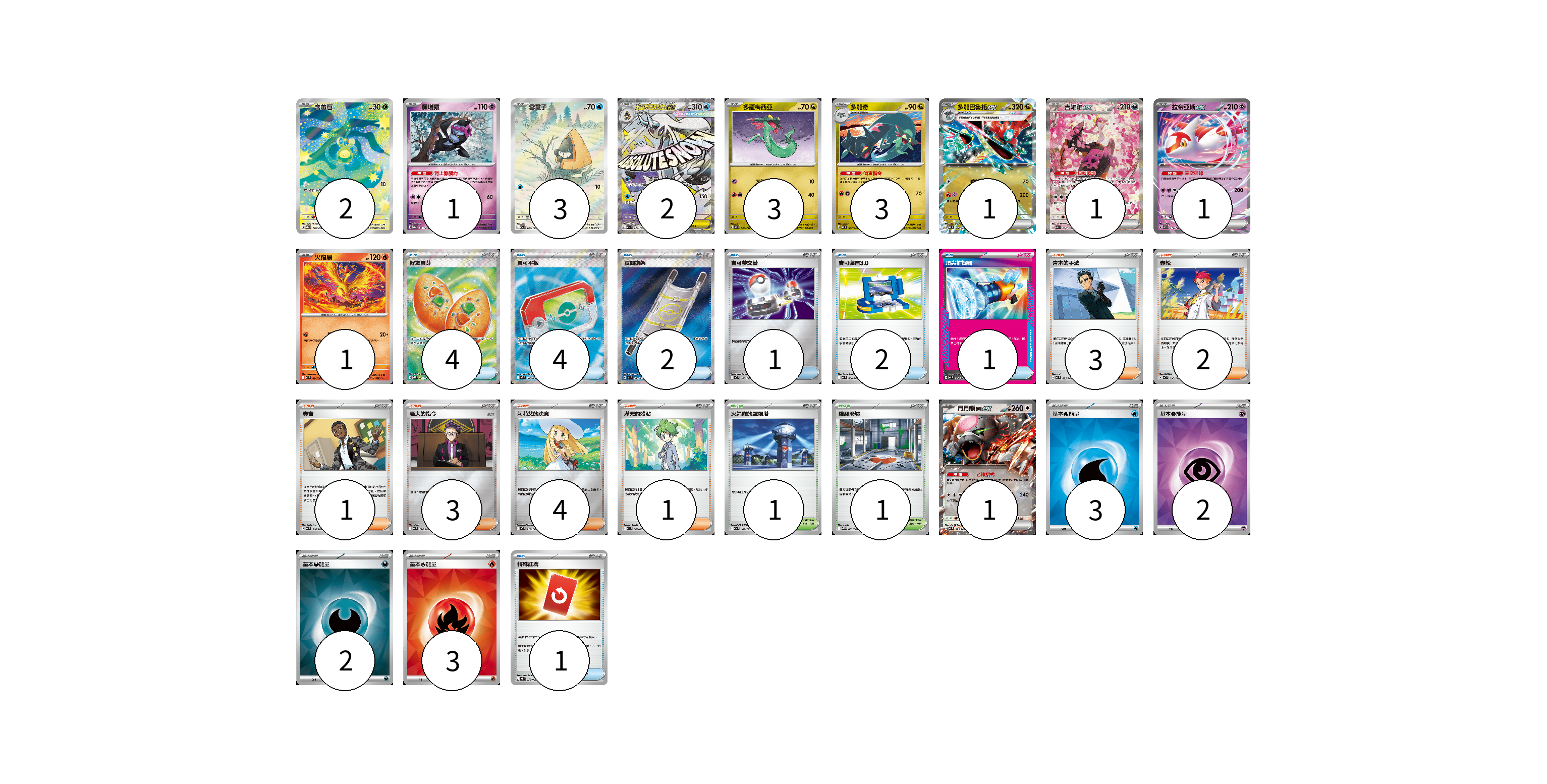 牌組構築方案 以此牌組為基礎新構築牌組 顯示卡面 顯示列表 寶可夢卡(19) 2 1 3 2 3 3 1 1 1 1 1 物品卡(15) 4 4 2 1 2 1 1 支援者卡(14) 3 2 1 3 4 1 競技場卡(2) 1 1 能量卡(10) 3 2 2 3 寶可夢卡(19) 卡牌名稱 張數 卡牌名稱 張數 含羞苞 M2a 196/193 02 願增猿 M2a 081/193 01 雪童子 M2a 200/193 03 超級雪妖女ex M2a 224/193 02 多龍梅西亞 MC 546/742 03 多龍奇 MC 547/742 03 多龍巴魯托ex MC 548/742 01 吉雉雞ex M2a 244/193 01 拉帝亞斯ex MC 312/742 01 火焰鳥 M2 014/080 01 月月熊 赫月 ex MC 625/742 01 物品卡(15) 卡牌名稱 張數 卡牌名稱 張數 好友寶芬 M1S 081/063 04 寶可平板 M3 103/080 04 夜間擔架 M1L 083/063 02 寶可夢交替 MC 663/742 01 寶可裝置3.0 MC 660/742 02 頂尖捕捉器 MC 656/742 01 特殊紅牌 M4 072/083 01 支援者卡(14) 卡牌名稱 張數 卡牌名稱 張數 青木的手法 MC 695/742 03 赤松 MC 696/742 02 賽吉 MC 714/742 01 老大的指令 MC 724/742 03 莉莉艾的決意 MC 729/742 04 滿充的體貼 M1S 060/063 01 競技場卡(2) 卡牌名稱 張數 卡牌名稱 張數 火箭隊的監視塔 M2a 189/193 01 險惡廢墟 M1L 063/063 01 能量卡(10) 卡牌名稱 張數 卡牌名稱 張數 基本【水】能量 SVM WAT 03 基本【超】能量 SVM PSY 02 基本【惡】能量 SVM DAR 02 基本【火】能量 SVQL FIR 03 以此牌組為基礎新構築牌組 牌組編碼 unzQNF-psjkpR-TpHaAU copy 列印牌組單 牌組編碼已複製 分享至SNS
