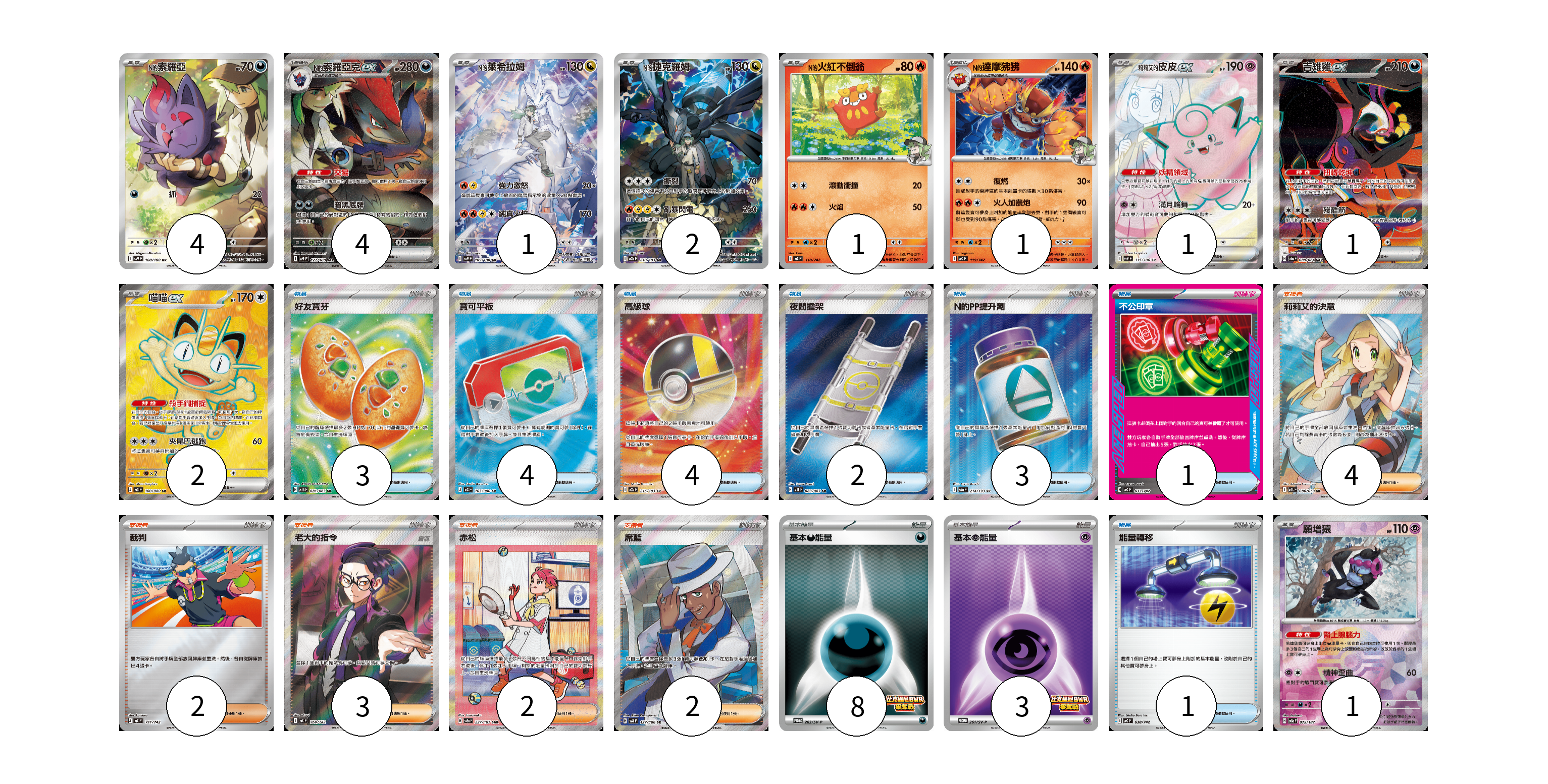 牌組構築方案 以此牌組為基礎新構築牌組 顯示卡面 顯示列表 寶可夢卡(18) 4 4 1 2 1 1 1 1 2 1 物品卡(18) 3 4 4 2 3 1 1 支援者卡(13) 4 2 3 2 2 能量卡(11) 8 3 寶可夢卡(18) 卡牌名稱 張數 卡牌名稱 張數 N的索羅亞 SV9 108/100 04 N的索羅亞克ex SV9 127/100 04 N的萊希拉姆 SV9 109/100 01 N的捷克羅姆 M2a 210/193 02 N的火紅不倒翁 MC 118/742 01 N的達摩狒狒 MC 119/742 01 莉莉艾的皮皮ex SV9 115/100 01 吉雉雞ex SV6a 089/064 01 喵喵ex M3 100/080 02 願增猿 SV8a 075/187 01 物品卡(18) 卡牌名稱 張數 卡牌名稱 張數 好友寶芬 M1S 081/063 03 寶可平板 M3 103/080 04 高級球 M2a 216/193 04 夜間擔架 M1L 083/063 02 N的PP提升劑 M2a 214/193 03 不公印章 MC 633/742 01 能量轉移 MC 638/742 01 支援者卡(13) 卡牌名稱 張數 卡牌名稱 張數 莉莉艾的決意 M1L 086/063 04 裁判 MC 711/742 02 老大的指令(烏羽) MC 760/742 03 赤松 SV8a 227/187 02 席藍 SV8 127/106 02 能量卡(11) 卡牌名稱 張數 卡牌名稱 張數 基本【惡】能量 SV-P 263/SV-P 08 基本【超】能量 SV-P 261/SV-P 03 以此牌組為基礎新構築牌組 牌組編碼 uouuVY-ffwnBj-NEcVwq copy 列印牌組單 牌組編碼已複製 分享至SNS
