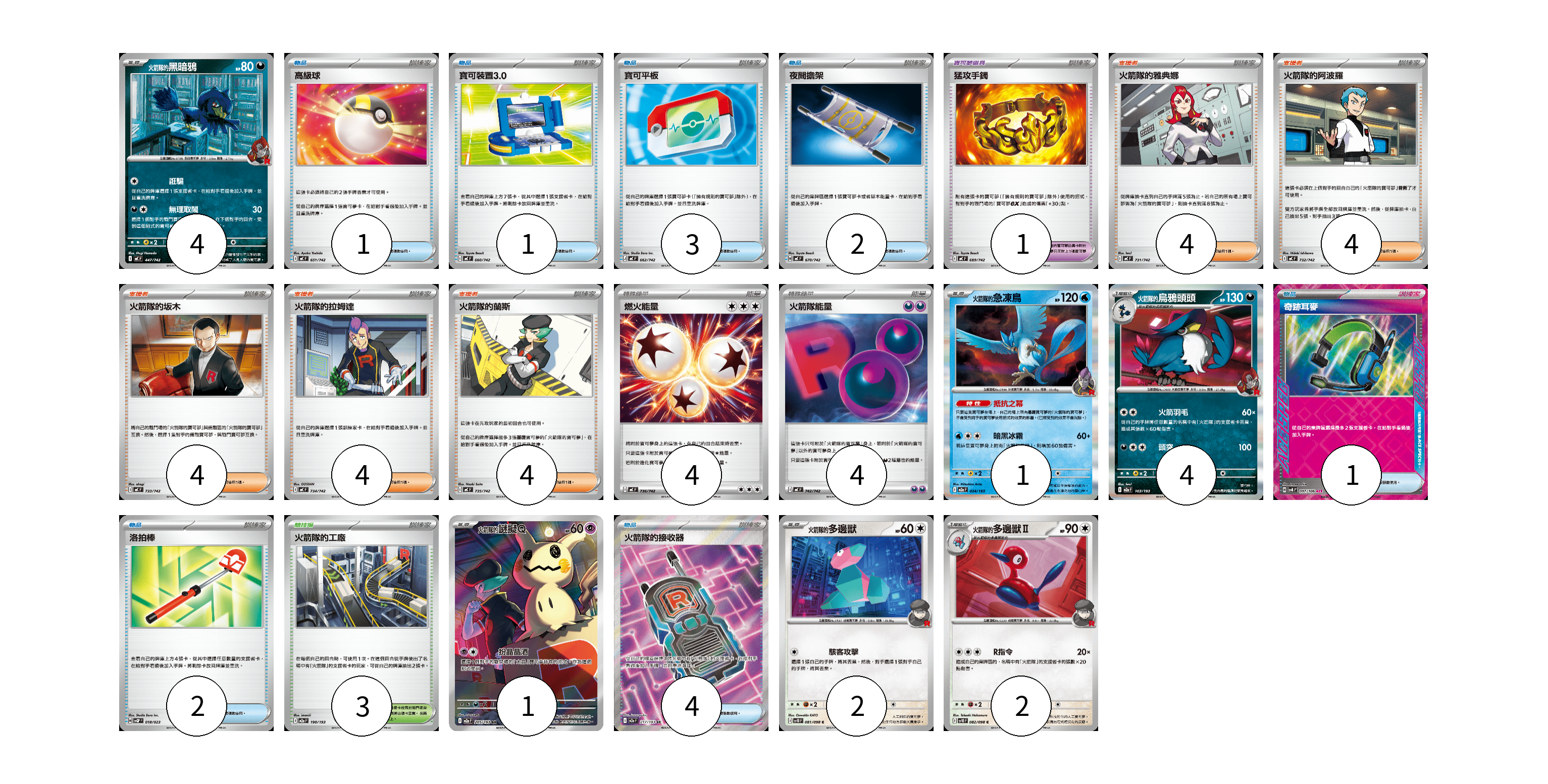 牌組構築方案 以此牌組為基礎新構築牌組 顯示卡面 顯示列表 寶可夢卡(14) 4 1 4 1 2 2 寶可夢道具(1) 1 物品卡(14) 1 1 3 2 1 2 4 支援者卡(20) 4 4 4 4 4 競技場卡(3) 3 能量卡(8) 4 4 寶可夢卡(14) 卡牌名稱 張數 卡牌名稱 張數 <火箭隊的>黑暗鴉 MC 447/742 04 <火箭隊的>急凍鳥 M2a 034/193 01 火箭隊的烏鴉頭頭 M2a 103/193 04 <火箭隊的>謎擬Q M2a 205/193 01 <火箭隊的>多邊獸 SV10 081/098 02 <火箭隊的>多邊獸Ⅱ SV10 082/098 02 寶可夢道具(1) 卡牌名稱 張數 卡牌名稱 張數 猛攻手鐲 MC 689/742 01 物品卡(14) 卡牌名稱 張數 卡牌名稱 張數 高級球 MC 651/742 01 寶可裝置3.0 MC 660/742 01 寶可平板 MC 662/742 03 夜間擔架 MC 670/742 02 奇跡耳麥 SV8 097/106 01 洛拍棒 SVQP 018/023 02 火箭隊的接收器 M2a 217/193 04 支援者卡(20) 卡牌名稱 張數 卡牌名稱 張數 火箭隊的雅典娜 MC 731/742 04 火箭隊的阿波羅 MC 732/742 04 火箭隊的坂木 MC 733/742 04 火箭隊的拉姆達 MC 734/742 04 火箭隊的蘭斯 MC 735/742 04 競技場卡(3) 卡牌名稱 張數 卡牌名稱 張數 火箭隊的工廠 M2a 190/193 03 能量卡(8) 卡牌名稱 張數 卡牌名稱 張數 燃火能量 MC 736/742 04 火箭隊能量 MC 742/742 04 以此牌組為基礎新構築牌組 牌組編碼 urDdam-PuZHYx-EagGRJ copy 列印牌組單 牌組編碼已複製 分享至SNS