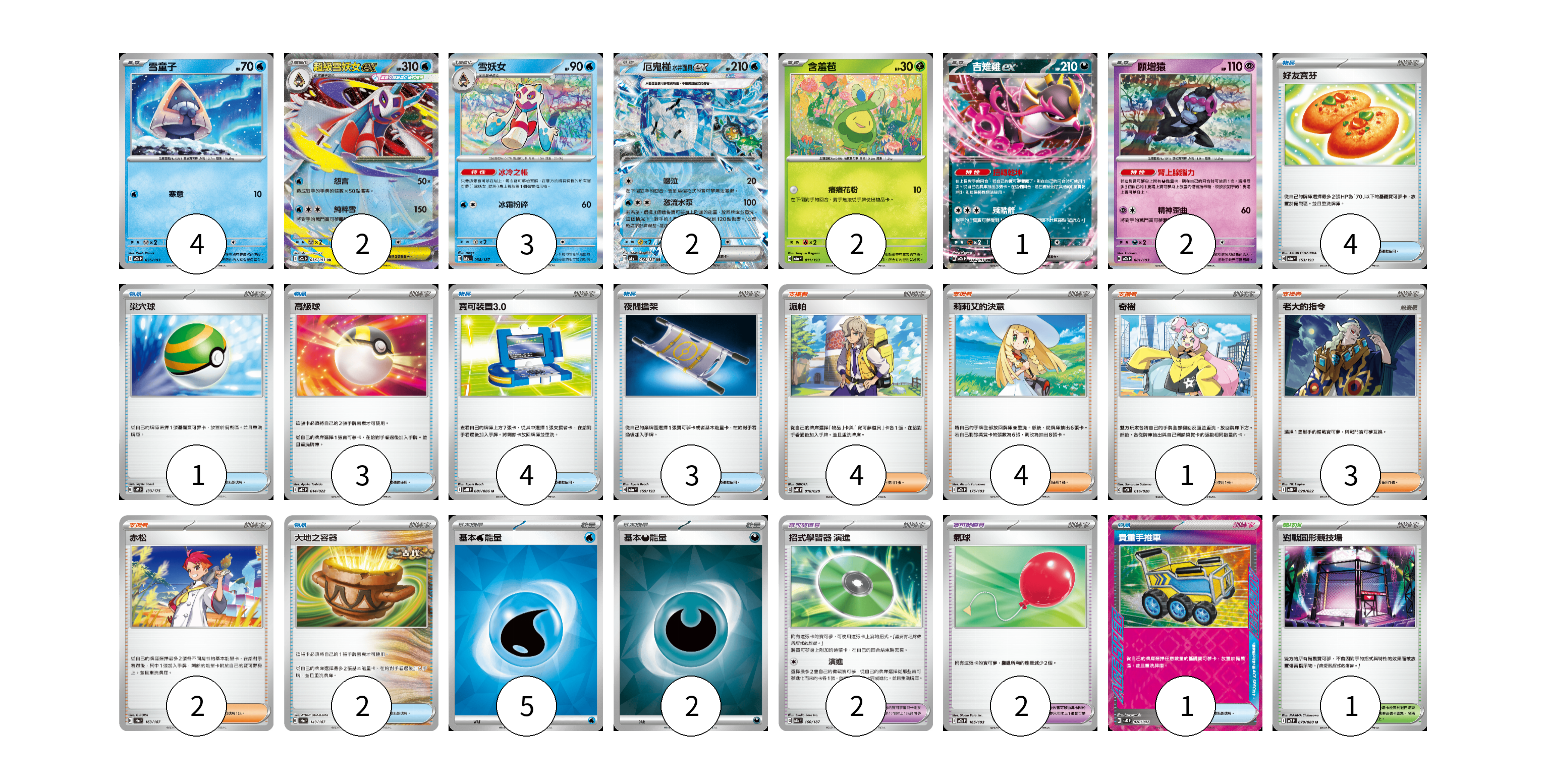 牌組構築方案 以此牌組為基礎新構築牌組 顯示卡面 顯示列表 寶可夢卡(16) 4 2 3 2 2 1 2 寶可夢道具(4) 2 2 物品卡(18) 4 1 3 4 3 2 1 支援者卡(14) 4 4 1 3 2 競技場卡(1) 1 能量卡(7) 5 2 寶可夢卡(16) 卡牌名稱 張數 卡牌名稱 張數 雪童子 M2a 035/193 04 超級雪妖女ex M2a 036/193 02 雪妖女 SV8a 038/187 03 厄鬼椪 水井面具ex SV8a 050/187 02 含羞苞 M2a 011/193 02 吉雉雞ex M2a 114/193 01 願增猿 M2a 081/193 02 寶可夢道具(4) 卡牌名稱 張數 卡牌名稱 張數 招式學習器 演進 SV8a 160/187 02 氣球 M2a 165/193 02 物品卡(18) 卡牌名稱 張數 卡牌名稱 張數 好友寶芬 M2a 153/193 04 巢穴球 SVM 133/175 01 高級球 MBD 014/022 03 寶可裝置3.0 SV11B 081/086 04 夜間擔架 M2a 159/193 03 大地之容器 SV8a 143/187 02 貴重手推車 SVK 020/042 01 支援者卡(14) 卡牌名稱 張數 卡牌名稱 張數 派帕 SVOD 018/020 04 莉莉艾的決意 M2a 175/193 04 奇樹 SVOD 016/020 01 老大的指令 MBD 020/022 03 赤松 SV8a 163/187 02 競技場卡(1) 卡牌名稱 張數 卡牌名稱 張數 對戰圓形競技場 M2 079/080 01 能量卡(7) 卡牌名稱 張數 卡牌名稱 張數 基本【水】能量 SVM WAT 05 基本【惡】能量 SVK DAR 02 以此牌組為基礎新構築牌組 牌組編碼 urciSJ-NWuHaC-pobiNB copy 列印牌組單 牌組編碼已複製 分享至SNS