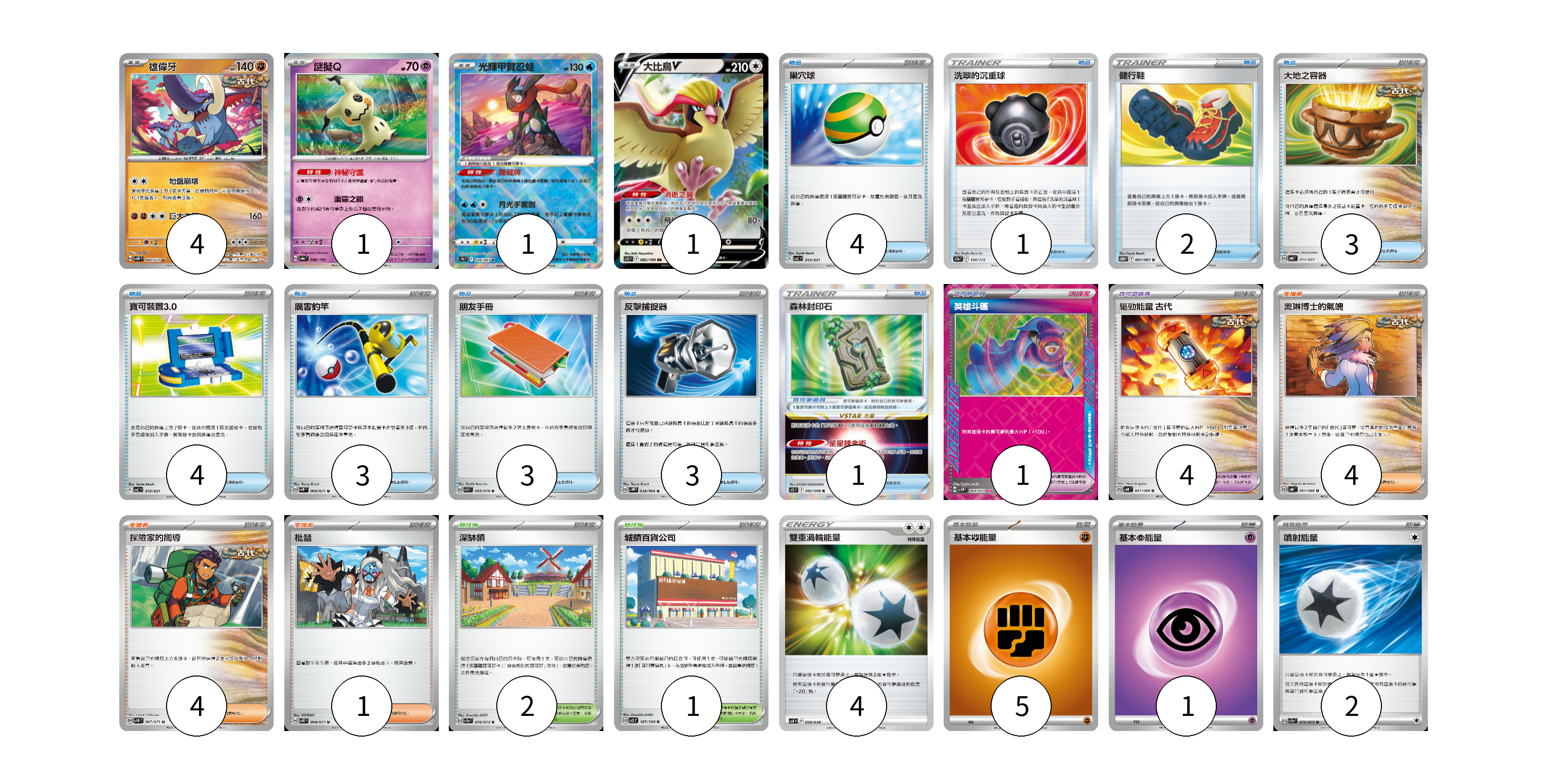 牌組構築方案 以此牌組為基礎新構築牌組 顯示卡面 顯示列表 寶可夢卡(7) 4 1 1 1 寶可夢道具(6) 1 1 4 物品卡(23) 4 1 2 3 4 3 3 3 支援者卡(9) 4 4 1 競技場卡(3) 2 1 能量卡(12) 4 5 1 2 寶可夢卡(7) 卡牌名稱 張數 卡牌名稱 張數 雄偉牙 SV5K 042/071 04 謎擬Q SV4a 088/190 01 光輝甲賀忍蛙 S9a 026/067 01 大比鳥V S11 082/100 01 寶可夢道具(6) 卡牌名稱 張數 卡牌名稱 張數 森林封印石 S12 092/098 01 英雄斗篷 SV5M 064/071 01 驅勁能量 古代 SV4K 061/066 04 物品卡(23) 卡牌名稱 張數 卡牌名稱 張數 巢穴球 SVC 013/021 04 洗翠的沉重球 S12a 140/172 01 健行鞋 S10D 061/067 02 大地之容器 SVHK 011/022 03 寶可裝置3.0 SVC 015/021 04 厲害釣竿 SV2P 066/071 03 朋友手冊 SV1S 069/078 03 反擊捕捉器 SV4M 059/066 03 支援者卡(9) 卡牌名稱 張數 卡牌名稱 張數 奧琳博士的氣魄 SV4K 064/066 04 探險家的嚮導 SV5K 067/071 04 枇琶 SV5K 068/071 01 競技場卡(3) 卡牌名稱 張數 卡牌名稱 張數 深缽鎮 SV1a 070/073 02 城鎮百貨公司 SV3 107/108 01 能量卡(12) 卡牌名稱 張數 卡牌名稱 張數 雙重渦輪能量 SVF 038/038 04 基本【鬥】能量 SVAM FIG 05 基本超能量 sv-p PSY 01 噴射能量 SV1a 072/073 02 以此牌組為基礎新構築牌組 牌組編碼 usNKGk-qAELgS-eBFQFp copy 列印牌組單 牌組編碼已複製 分享至SNS