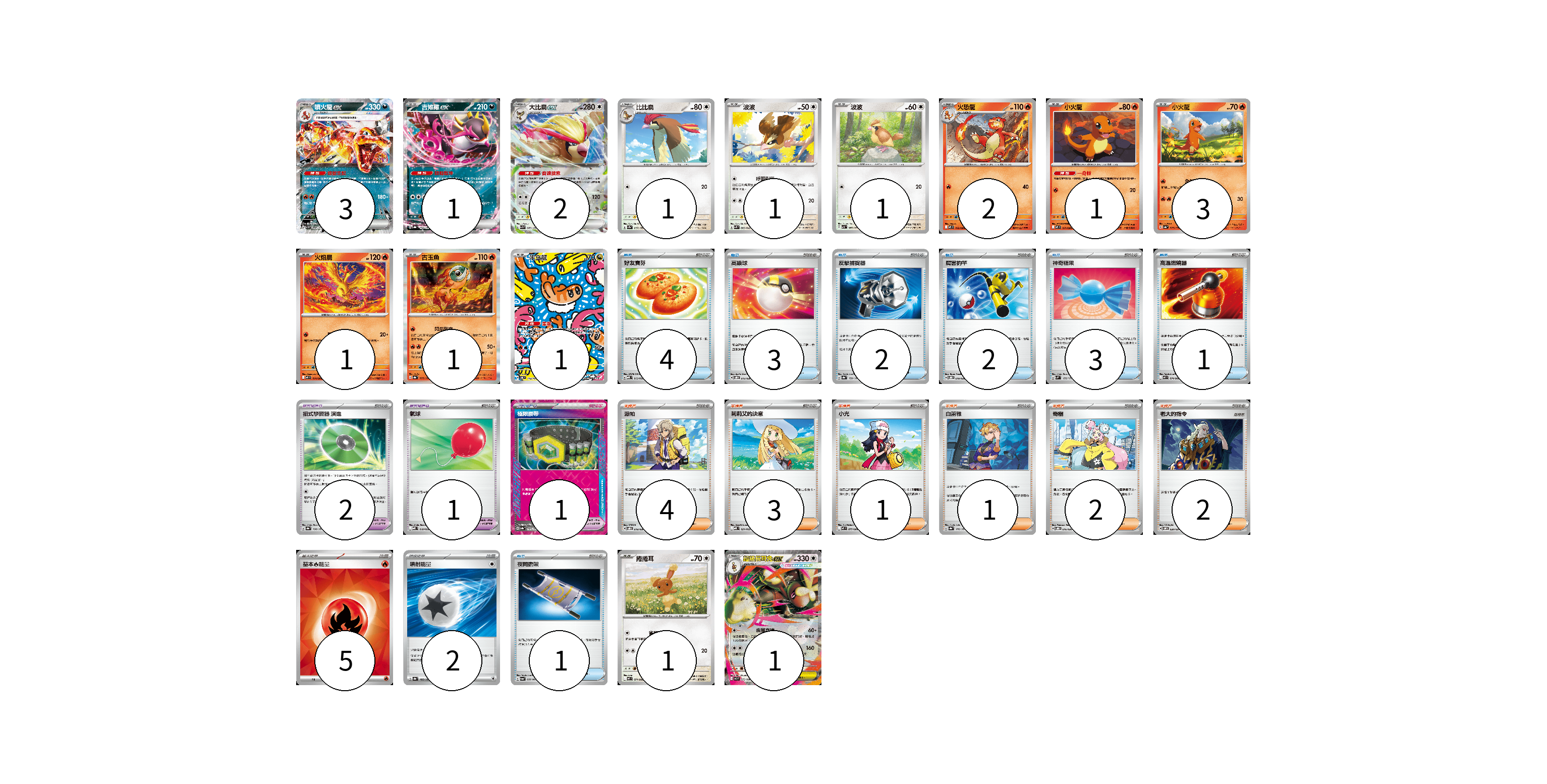 牌組構築方案 以此牌組為基礎新構築牌組 顯示卡面 顯示列表 寶可夢卡(20) 3 1 2 1 1 1 2 1 3 1 1 1 1 1 寶可夢道具(4) 2 1 1 物品卡(16) 4 3 2 2 3 1 1 支援者卡(13) 4 3 1 1 2 2 能量卡(7) 5 2 寶可夢卡(20) 卡牌名稱 張數 卡牌名稱 張數 噴火龍ex SV3 066/108 03 吉雉雞ex SV8a 104/187 01 大比鳥ex SV3 089/108 02 比比鳥 SV2a 017/165 01 波波 SVK 003/042 01 波波 SV3 087/108 01 火恐龍 M2 012/080 02 小火龍 M2 011/080 01 小火龍 SV4a 025/190 03 火焰鳥 M2 014/080 01 古玉魚 SV8a 025/187 01 米立龍 SV6 112/101 01 捲捲耳 M2 071/080 01 超級長耳兔ex M2 072/080 01 寶可夢道具(4) 卡牌名稱 張數 卡牌名稱 張數 招式學習器 演進 SV8a 160/187 02 氣球 MBD 018/022 01 極限腰帶 SV8a 159/187 01 物品卡(16) 卡牌名稱 張數 卡牌名稱 張數 好友寶芬 MBD 013/022 04 高級球 SVOD 012/020 03 反擊捕捉器 SV8a 139/187 02 厲害釣竿 SVOD 010/020 02 神奇糖果 SVM 135/175 03 高溫燃燒器 M2 074/080 01 夜間擔架 SV6a 056/064 01 支援者卡(13) 卡牌名稱 張數 卡牌名稱 張數 派帕 SVOD 018/020 04 莉莉艾的決意 MBD 021/022 03 小光 M2 077/080 01 白蕾雅 SV8a 176/187 01 奇樹 SVOD 016/020 02 老大的指令 SVOM 020/021 02 能量卡(7) 卡牌名稱 張數 卡牌名稱 張數 基本【火】能量 SVM FIR 05 噴射能量 SV8a 185/187 02 以此牌組為基礎新構築牌組 牌組編碼 ususGa-JYmpdU-ADexoj copy 列印牌組單 牌組編碼已複製 分享至SNS