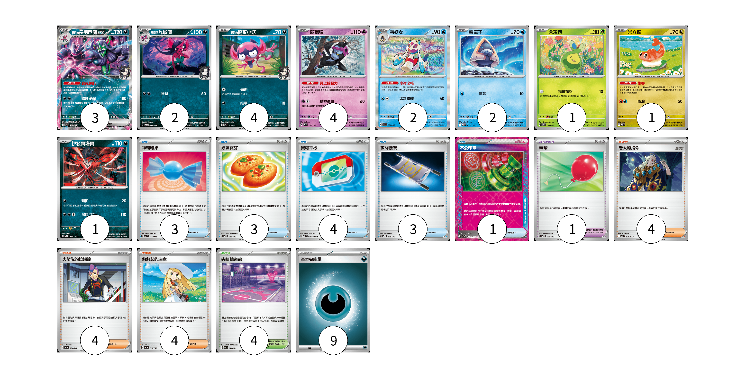 牌組構築方案 以此牌組為基礎新構築牌組 顯示卡面 顯示列表 寶可夢卡(20) 3 2 4 4 2 2 1 1 1 寶可夢道具(1) 1 物品卡(14) 3 3 4 3 1 支援者卡(12) 4 4 4 競技場卡(4) 4 能量卡(9) 9 寶可夢卡(20) 卡牌名稱 張數 卡牌名稱 張數 <瑪俐的>長毛巨魔ex SVOM 007/021 03 <瑪俐的>詐唬魔 SVOM 006/021 02 <瑪俐的>搗蛋小妖 SVOM 005/021 04 願增猿 MC 358/742 04 雪妖女 SV8a 038/187 02 雪童子 M2a 035/193 02 含羞苞 M2a 011/193 01 米立龍 M2a 135/193 01 伊裴爾塔爾 MC 481/742 01 寶可夢道具(1) 卡牌名稱 張數 卡牌名稱 張數 氣球 MC 688/742 01 物品卡(14) 卡牌名稱 張數 卡牌名稱 張數 神奇糖果 MC 655/742 03 好友寶芬 MC 648/742 03 寶可平板 M3 070/080 04 夜間擔架 MC 670/742 03 不公印章 SV5a 053/066 01 支援者卡(12) 卡牌名稱 張數 卡牌名稱 張數 老大的指令 MBD 020/022 04 火箭隊的拉姆達 MC 734/742 04 莉莉艾的決意 MC 729/742 04 競技場卡(4) 卡牌名稱 張數 卡牌名稱 張數 尖釘鎮道館 SVOM 021/021 04 能量卡(9) 卡牌名稱 張數 卡牌名稱 張數 基本【惡】能量 MC DAR 09 以此牌組為基礎新構築牌組 牌組編碼 uuMxOd-sBnHgS-qQibMH copy 列印牌組單 牌組編碼已複製 分享至SNS