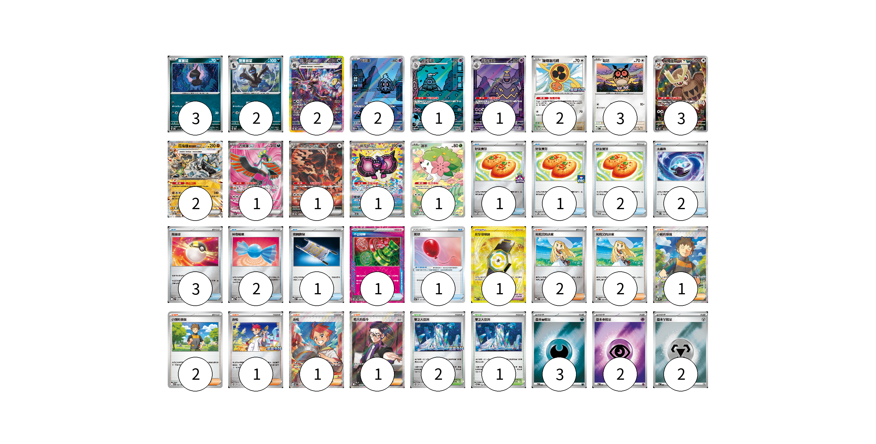 牌組構築方案 以此牌組為基礎新構築牌組 顯示卡面 顯示列表 寶可夢卡(25) 3 2 2 2 1 1 2 3 3 2 1 1 1 1 寶可夢道具(2) 1 1 物品卡(13) 1 1 2 2 3 2 1 1 支援者卡(10) 2 2 1 2 1 1 1 競技場卡(3) 2 1 能量卡(7) 3 2 2 寶可夢卡(25) 卡牌名稱 張數 卡牌名稱 張數 單首龍 SV8 070/106 03 雙首暴龍 SV8 071/106 02 三首惡龍ex SV8 133/106 02 夜巡靈 SV6a 068/064 02 彷徨夜靈 SV6a 069/064 01 黑夜魔靈 SV6a 070/064 01 旋轉洛托姆 SV-P 146/SV-P 02 咕咕 MC 572/742 03 貓頭夜鷹 SV7 114/102 03 厄鬼椪 礎石面具ex SV6 065/101 02 吉雉雞ex SV6a 081/064 01 月月熊 赫月ex SV8a 225/187 01 桃歹郎ex SV8a 219/187 01 謝米 SV9a 066/063 01 寶可夢道具(2) 卡牌名稱 張數 卡牌名稱 張數 氣球 S4a 171/190 01 反擊增幅器 SV7a 093/064 01 物品卡(13) 卡牌名稱 張數 卡牌名稱 張數 好友寶芬 SV-P 230/SV-P 01 好友寶芬 SV-P 212/SV-P 01 好友寶芬 SVTH 009/018 02 太晶珠 M2a 152/193 02 高級球 MC 651/742 03 神奇糖果 MC 655/742 02 夜間擔架 MC 670/742 01 不公印章 SV5a 053/066 01 支援者卡(10) 卡牌名稱 張數 卡牌名稱 張數 莉莉艾的決意 MC 729/742 02 莉莉艾的決意 MC 729/742 02 小剛的發掘 SV9 123/100 01 小剛的發掘 SV9 096/100 02 赤松 SV-P 150/SV-P 01 赤松 SV7 123/102 01 老大的指令(烏羽) MC 760/742 01 競技場卡(3) 卡牌名稱 張數 卡牌名稱 張數 零之大空洞 SV-P 151/SV-P 02 零之大空洞 SV7 102/102 01 能量卡(7) 卡牌名稱 張數 卡牌名稱 張數 基本【惡】能量 MC DAR 03 基本【超】能量 MC PSY 02 基本【鋼】能量 MC MET 02 以此牌組為基礎新構築牌組 牌組編碼 uvmXlQ-KgcNHR-dYUMVv copy 列印牌組單 牌組編碼已複製 分享至SNS