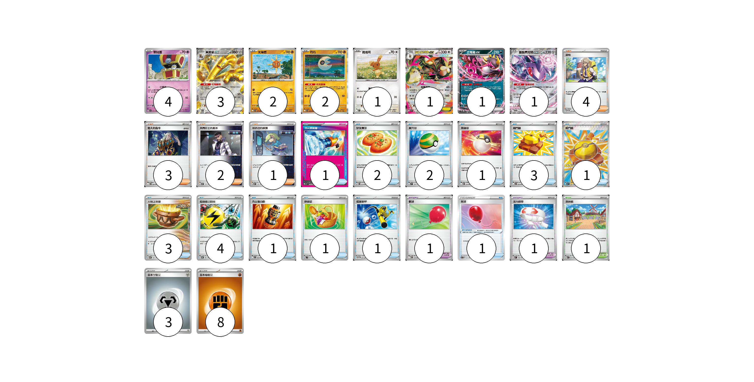 牌組構築方案 以此牌組為基礎新構築牌組 顯示卡面 顯示列表 寶可夢卡(15) 4 3 2 2 1 1 1 1 寶可夢道具(3) 1 1 1 物品卡(20) 1 2 2 1 3 1 3 4 1 1 1 支援者卡(10) 4 3 2 1 競技場卡(1) 1 能量卡(11) 3 8 寶可夢卡(15) 卡牌名稱 張數 卡牌名稱 張數 索財靈 SV7a 024/064 04 賽富豪ex SV8a 117/187 03 太陽岩 M1L 027/063 02 月石 M1L 026/063 02 捲捲耳 M2 071/080 01 超級長耳兔ex M2 072/080 01 吉雉雞ex SVOD 004/020 01 蓋諾賽克特ex SV11B 069/086 01 寶可夢道具(3) 卡牌名稱 張數 卡牌名稱 張數 氣球 MBD 018/022 01 氣球 SK 021/030 01 活力頭帶 SVM 140/175 01 物品卡(20) 卡牌名稱 張數 卡牌名稱 張數 頂尖捕捉器 MBG 014/022 01 好友寶芬 MBD 013/022 02 巢穴球 SVM 133/175 02 高級球 MBD 014/022 01 戰鬥鑼 M1L 059/063 03 戰鬥鑼 M1L 082/063 01 大地之容器 SV8a 143/187 03 超級能量回收 SV8a 141/187 04 力量蛋白飲 M1L 058/063 01 野餐籃 SV1V 071/078 01 厲害釣竿 SVOD 010/020 01 支援者卡(10) 卡牌名稱 張數 卡牌名稱 張數 派帕 SVOD 018/020 04 老大的指令 MBD 020/022 03 弗圖博士的劇本 SV8a 175/187 02 暗碼迷的解讀 SV8a 165/187 01 競技場卡(1) 卡牌名稱 張數 卡牌名稱 張數 深缽鎮 SVK 039/042 01 能量卡(11) 卡牌名稱 張數 卡牌名稱 張數 基本鋼能量 sv-p MET 03 基本鬥能量 sv-p FIG 08 以此牌組為基礎新構築牌組 牌組編碼 uxJuIM-rNnjaE-unKHTQ copy 列印牌組單 牌組編碼已複製 分享至SNS