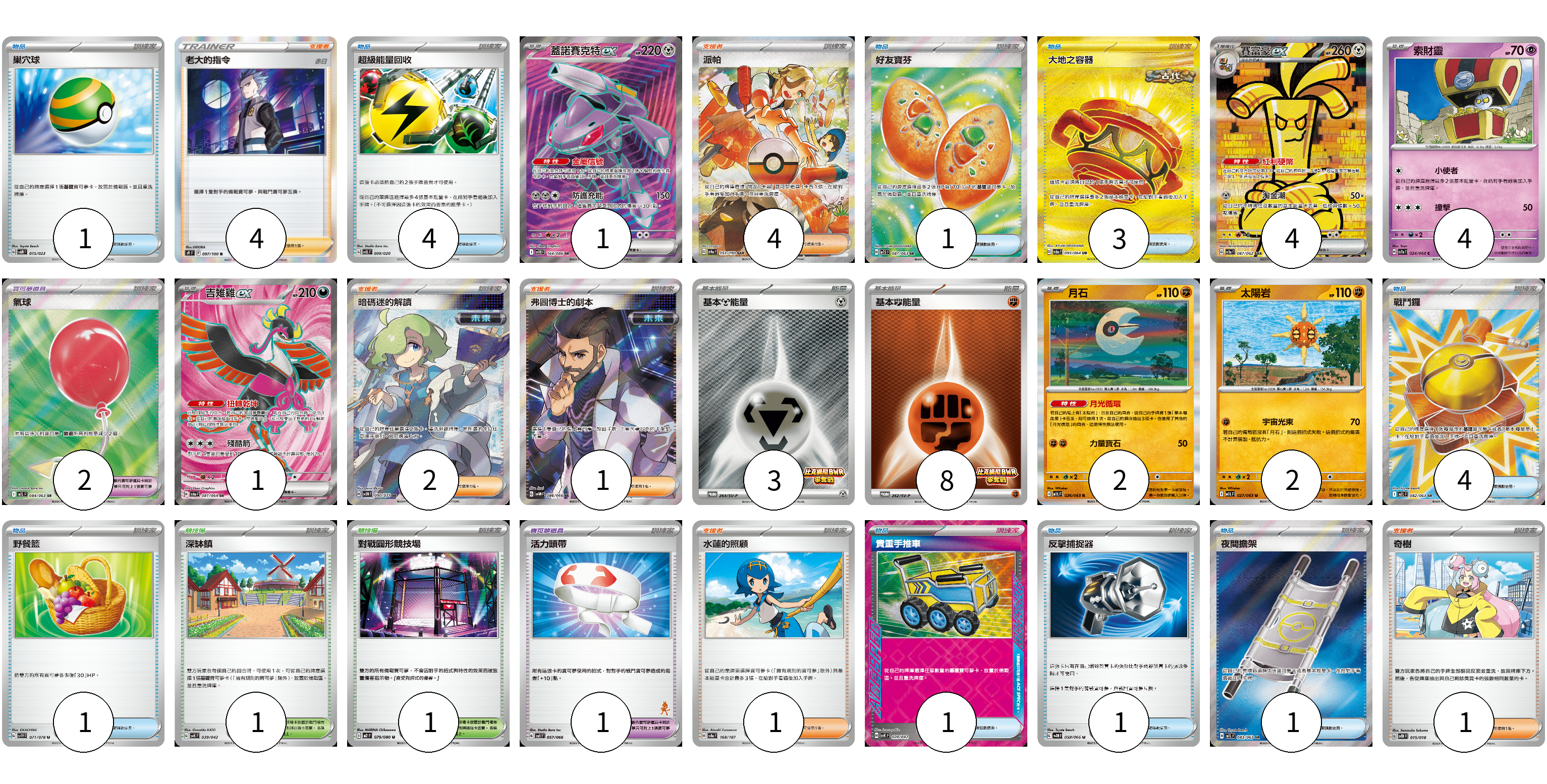 牌組構築方案 以此牌組為基礎新構築牌組 顯示卡面 顯示列表 寶可夢卡(14) 1 4 4 1 2 2 寶可夢道具(3) 2 1 物品卡(17) 1 4 1 3 4 1 1 1 1 支援者卡(13) 4 4 2 1 1 1 競技場卡(2) 1 1 能量卡(11) 3 8 寶可夢卡(14) 卡牌名稱 張數 卡牌名稱 張數 蓋諾賽克特ex SV11B 164/086 01 賽富豪ex SV3a 087/062 04 索財靈 SV7a 024/064 04 吉雉雞ex SV6a 081/064 01 月石 M1L 026/063 02 太陽岩 M1L 027/063 02 寶可夢道具(3) 卡牌名稱 張數 卡牌名稱 張數 氣球 M1L 084/063 02 活力頭帶 SVI 057/066 01 物品卡(17) 卡牌名稱 張數 卡牌名稱 張數 巢穴球 SVAM 015/023 01 超級能量回收 SVEL 009/020 04 好友寶芬 M1S 081/063 01 大地之容器 SV6a 093/064 03 戰鬥鑼 M1L 082/063 04 野餐籃 SV1V 071/078 01 貴重手推車 SVK 020/042 01 反擊捕捉器 SV4M 059/066 01 夜間擔架 M1L 083/063 01 支援者卡(13) 卡牌名稱 張數 卡牌名稱 張數 老大的指令(赤日) S9 097/100 04 派帕 SV4a 353/190 04 暗碼迷的解讀 SV5M 090/071 02 弗圖博士的劇本 SV4M 086/066 01 水蓮的照顧 SV8a 168/187 01 奇樹 SVTH 015/018 01 競技場卡(2) 卡牌名稱 張數 卡牌名稱 張數 深缽鎮 SVK 039/042 01 對戰圓形競技場 M2 079/080 01 能量卡(11) 卡牌名稱 張數 卡牌名稱 張數 基本【鋼】能量 SV-P 264/SV-P 03 基本【鬥】能量 SV-P 262/SV-P 08 以此牌組為基礎新構築牌組 牌組編碼 uyYQzn-oZrkZd-YnMTUr copy 列印牌組單 牌組編碼已複製 分享至SNS