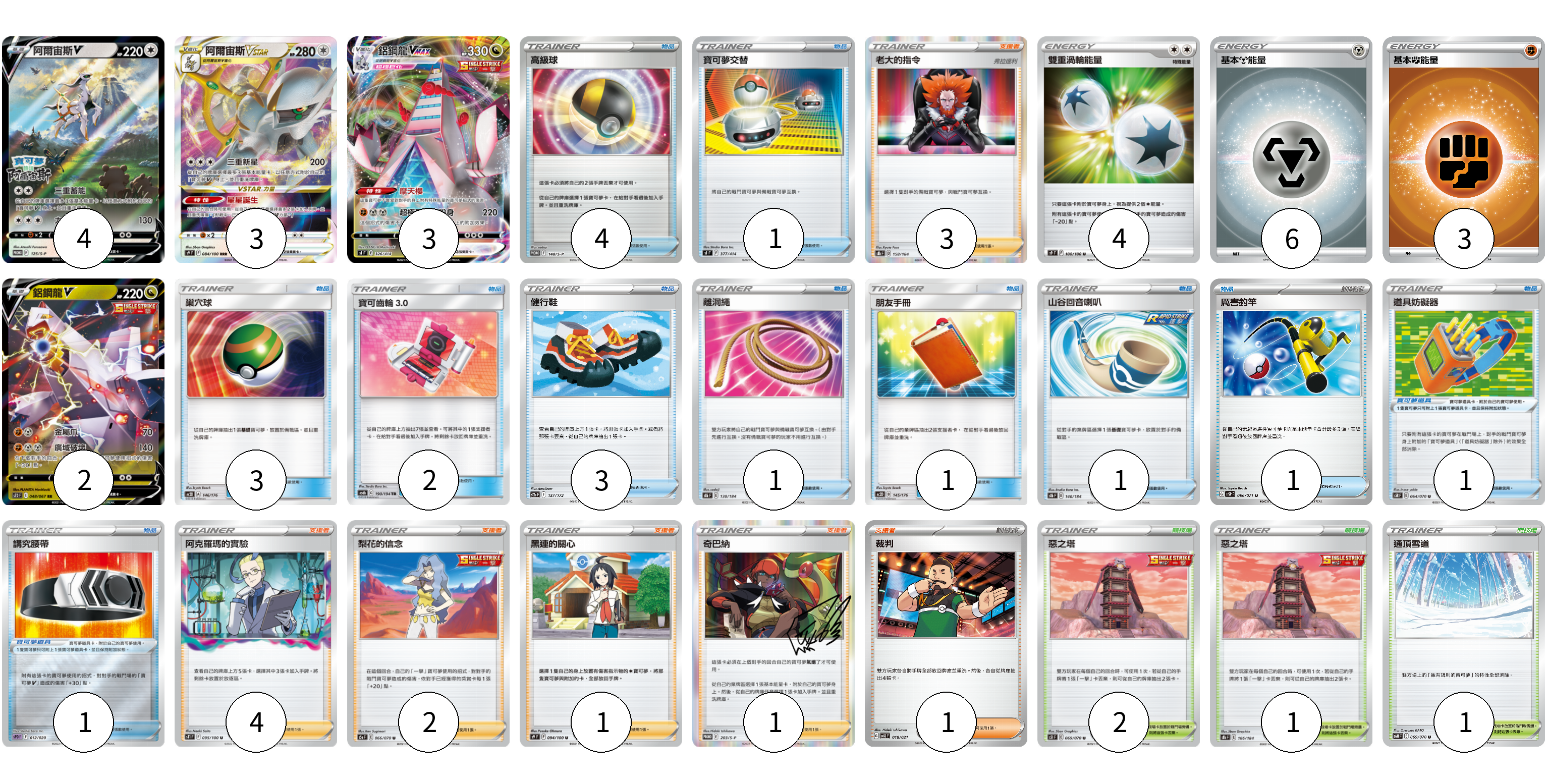 牌組構築方案 以此牌組為基礎新構築牌組 顯示卡面 顯示列表 寶可夢卡(12) 4 3 3 2 寶可夢道具(2) 1 1 物品卡(17) 4 1 3 2 3 1 1 1 1 支援者卡(12) 3 4 2 1 1 1 競技場卡(4) 2 1 1 能量卡(13) 4 6 3 寶可夢卡(12) 卡牌名稱 張數 卡牌名稱 張數 阿爾宙斯V S-P 125/S-P 04 阿爾宙斯VSTAR S9 084/100 03 鋁鋼龍VMAX SI 326/414 03 鋁鋼龍V S7D 048/067 02 寶可夢道具(2) 卡牌名稱 張數 卡牌名稱 張數 道具妨礙器 S5R 064/070 01 講究腰帶 SPD 012/020 01 物品卡(17) 卡牌名稱 張數 卡牌名稱 張數 高級球 S-P 148/S-P 04 寶可夢交替 SI 377/414 01 巢穴球 AC2D 146/176 03 寶可齒輪3.0 AS6b 190/194 02 健行鞋 S12a 137/172 03 離洞繩 S8b 130/184 01 朋友手冊 AC2D 145/176 01 山谷回音喇叭 S8b 140/184 01 厲害釣竿 SV2P 066/071 01 支援者卡(12) 卡牌名稱 張數 卡牌名稱 張數 老大的指令(弗拉達利) S8b 158/184 03 阿克羅瑪的實驗 S11 095/100 04 梨花的信念 S5a 066/070 02 黑連的關心 S9 094/100 01 奇巴納 S-P 203/S-P 01 裁判 SVAL 018/021 01 競技場卡(4) 卡牌名稱 張數 卡牌名稱 張數 惡之塔 S5I 069/070 02 惡之塔 S8b 166/184 01 通頂雪道 S6H 069/070 01 能量卡(13) 卡牌名稱 張數 卡牌名稱 張數 雙重渦輪能量 S9 100/100 04 基本【鋼】能量 SI MET 06 基本鬥能量 SLL FIG 03 以此牌組為基礎新構築牌組 牌組編碼 uzVZEd-ybwFoP-yVjLAD copy 列印牌組單 牌組編碼已複製 分享至SNS
