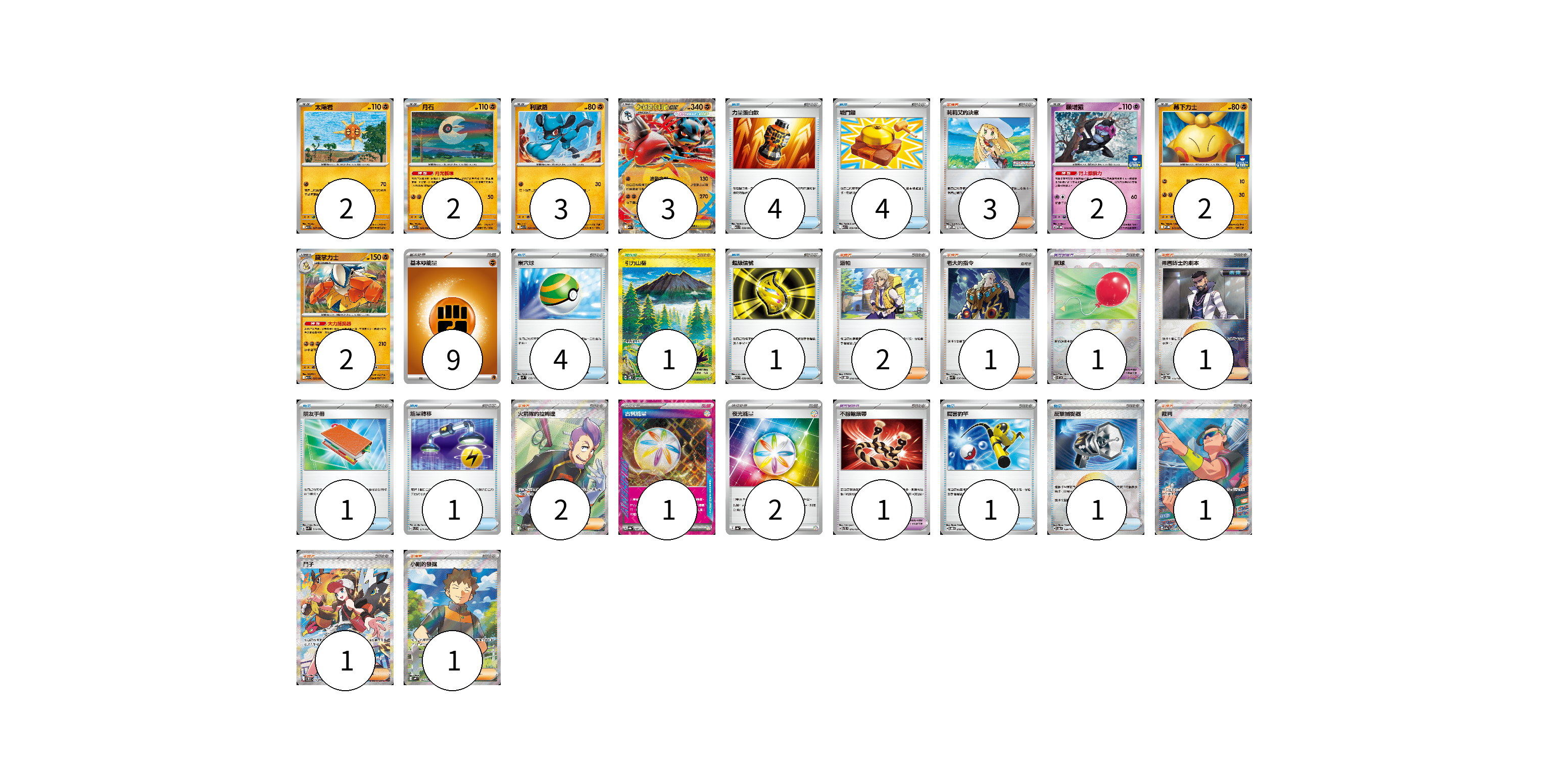 牌組構築方案 以此牌組為基礎新構築牌組 顯示卡面 顯示列表 寶可夢卡(16) 2 2 3 3 2 2 2 寶可夢道具(2) 1 1 物品卡(17) 4 4 4 1 1 1 1 1 支援者卡(12) 3 2 1 1 2 1 1 1 競技場卡(1) 1 能量卡(12) 9 1 2 寶可夢卡(16) 卡牌名稱 張數 卡牌名稱 張數 太陽岩 M1L 027/063 02 月石 M1L 026/063 02 利歐路 M1L 028/063 03 超級路卡利歐ex M1L 029/063 03 願增猿 M-P 014/M-P 02 幕下力士 M-P 015/M-P 02 鐵掌力士 M1L 025/063 02 寶可夢道具(2) 卡牌名稱 張數 卡牌名稱 張數 氣球 SV11B 082/086 01 不服輸頭帶 SVTL 016/021 01 物品卡(17) 卡牌名稱 張數 卡牌名稱 張數 力量蛋白飲 M1L 058/063 04 戰鬥鑼 M1L 059/063 04 巢穴球 SVM 133/175 04 超級信號 M1S 058/063 01 朋友手冊 SVK 014/042 01 能量轉移 SVC 011/021 01 厲害釣竿 SVOD 010/020 01 反擊捕捉器 SV8a 139/187 01 支援者卡(12) 卡牌名稱 張數 卡牌名稱 張數 莉莉艾的決意 M-P 011/M-P 03 派帕 SVOD 018/020 02 老大的指令 SVK 036/042 01 弗圖博士的劇本 SV8a 175/187 01 火箭隊的拉姆達 SV10 122/098 02 裁判 SV9a 083/063 01 鬥子 SV11W 173/086 01 小剛的發掘 SV9 123/100 01 競技場卡(1) 卡牌名稱 張數 卡牌名稱 張數 引力山岳 SV8 138/106 01 能量卡(12) 卡牌名稱 張數 卡牌名稱 張數 基本【鬥】能量 M-P FIG 09 古舊能量 SV8a 187/187 01 夜光能量 SV4a 190/190 02 以此牌組為基礎新構築牌組 牌組編碼 vATqrH-GKHMjw-PXTQXj copy 列印牌組單 牌組編碼已複製 分享至SNS