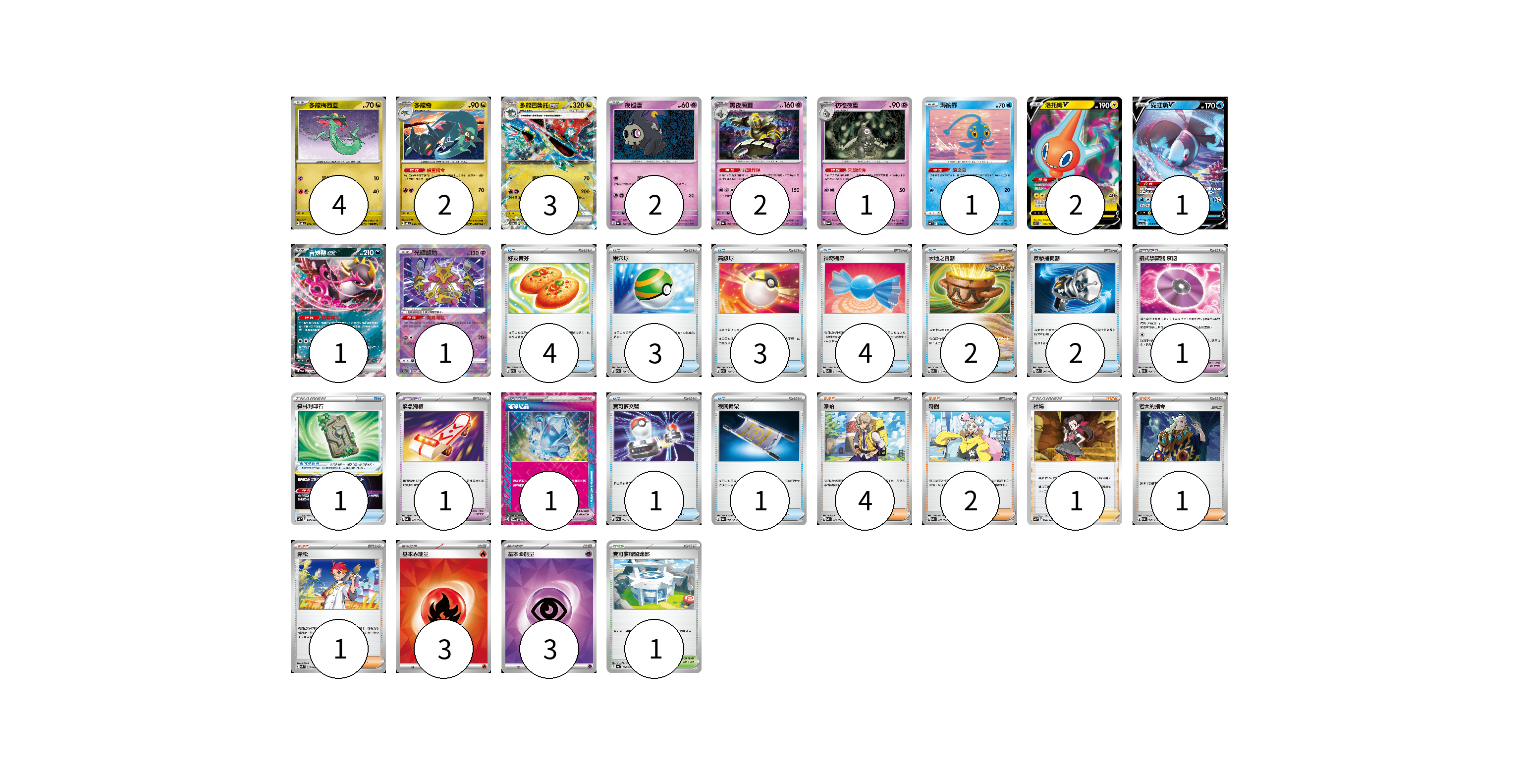 牌組構築方案 以此牌組為基礎新構築牌組 顯示卡面 顯示列表 寶可夢卡(20) 4 2 3 2 2 1 1 2 1 1 1 寶可夢道具(3) 1 1 1 物品卡(21) 4 3 3 4 2 2 1 1 1 支援者卡(9) 4 2 1 1 1 競技場卡(1) 1 能量卡(6) 3 3 寶可夢卡(20) 卡牌名稱 張數 卡牌名稱 張數 多龍梅西亞 SV6 079/101 04 多龍奇 SV6 080/101 02 多龍巴魯托ex SV6 081/101 03 夜巡靈 SV6a 018/064 02 黑夜魔靈 SV6a 020/064 02 彷徨夜靈 SV6a 019/064 01 瑪納霏 SVF 003/038 01 洛托姆V S11 037/100 02 霓虹魚V SVHK 004/022 01 吉雉雞ex SV6a 038/064 01 光輝胡地 S11a 031/068 01 寶可夢道具(3) 卡牌名稱 張數 卡牌名稱 張數 招式學習器 衰退 SVK 026/042 01 緊急滑板 SVK 023/042 01 璀璨結晶 SV7 094/102 01 物品卡(21) 卡牌名稱 張數 卡牌名稱 張數 好友寶芬 SVK 015/042 04 巢穴球 SVK 016/042 03 高級球 SVK 018/042 03 神奇糖果 SVK 019/042 04 大地之容器 SVK 012/042 02 反擊捕捉器 SVK 009/042 02 森林封印石 SVF 024/038 01 寶可夢交替 SVK 022/042 01 夜間擔架 SV6a 056/064 01 支援者卡(9) 卡牌名稱 張數 卡牌名稱 張數 派帕 SVK 035/042 04 奇樹 SVK 031/042 02 杜娟 SVB 021/028 01 老大的指令 SVK 036/042 01 赤松 SVK 027/042 01 競技場卡(1) 卡牌名稱 張數 卡牌名稱 張數 寶可夢聯盟總部 SV4a 186/190 01 能量卡(6) 卡牌名稱 張數 卡牌名稱 張數 基本【火】能量 SVK FIR 03 基本【超】能量 SVK PSY 03 以此牌組為基礎新構築牌組 牌組編碼 vCnaMj-PKImDs-BJBbUf copy 列印牌組單 牌組編碼已複製 分享至SNS