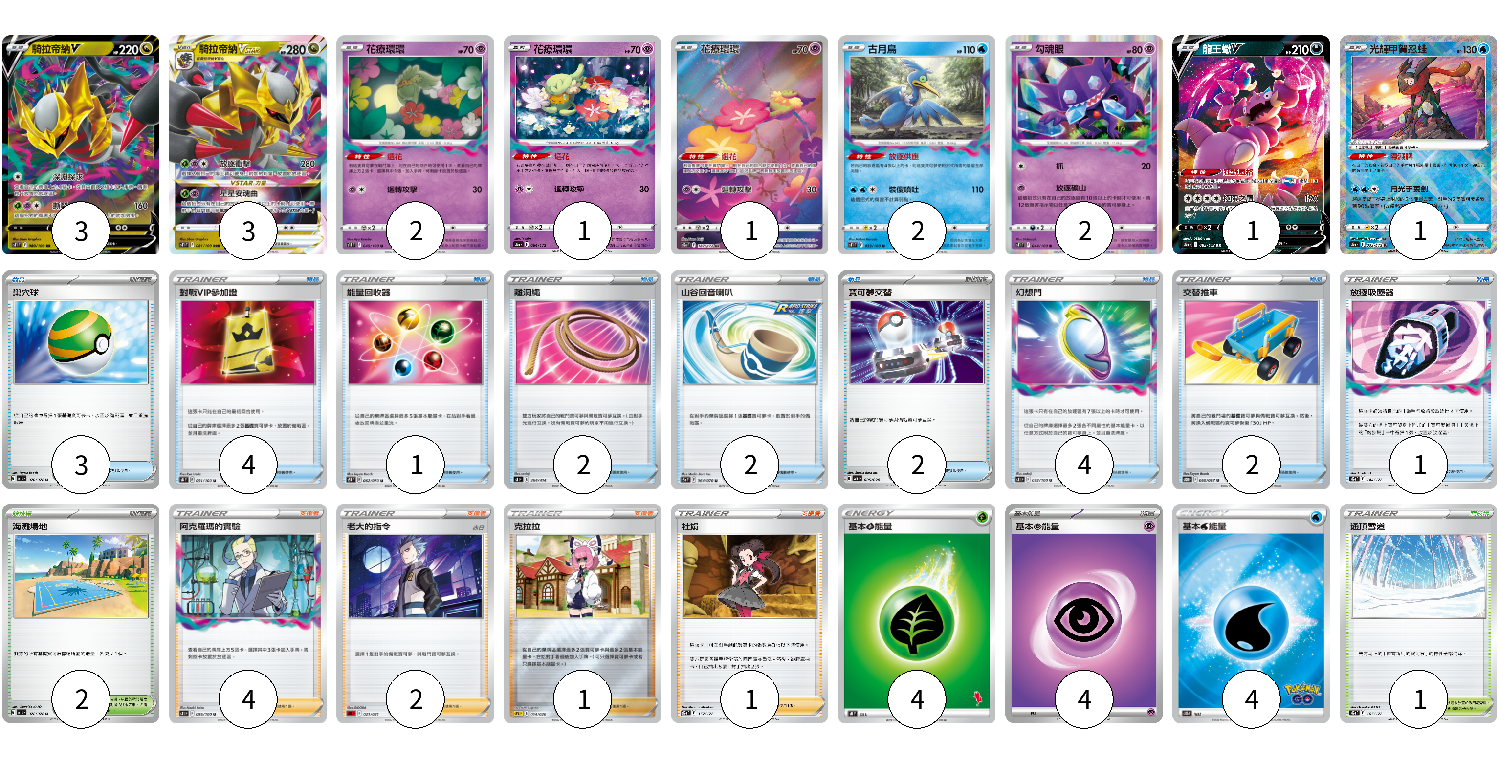 牌組構築方案 以此牌組為基礎新構築牌組 顯示卡面 顯示列表 寶可夢卡(16) 3 3 2 1 1 2 2 1 1 物品卡(21) 3 4 1 2 2 2 4 2 1 支援者卡(8) 4 2 1 1 競技場卡(3) 2 1 能量卡(12) 4 4 4 寶可夢卡(16) 卡牌名稱 張數 卡牌名稱 張數 騎拉帝納V S11 080/100 03 騎拉帝納VSTAR S11 081/100 03 花療環環 S11 049/100 02 花療環環 S12a 064/172 01 花療環環 S12a 187/172 01 古月鳥 S11 033/100 02 勾魂眼 S11 044/100 02 龍王蠍V S12a 085/172 01 光輝甲賀忍蛙 S12a 033/172 01 物品卡(21) 卡牌名稱 張數 卡牌名稱 張數 巢穴球 SV1S 070/078 03 對戰VIP參加證 S8 091/100 04 能量回收器 S5R 062/070 01 離洞繩 SI 364/414 02 山谷回音喇叭 S5a 064/070 02 寶可夢交替 SVB 005/028 02 幻想門 S11 092/100 04 交替推車 S10D 060/067 02 放逐吸塵器 S12a 144/172 01 支援者卡(8) 卡牌名稱 張數 卡牌名稱 張數 阿克羅瑪的實驗 S11 095/100 04 老大的指令(赤日) SDL 021/021 02 克拉拉 SPZ 014/020 01 杜娟 S12a 157/172 01 競技場卡(3) 卡牌名稱 張數 卡牌名稱 張數 海灘場地 SV1S 078/078 02 通頂雪道 S12a 165/172 01 能量卡(12) 卡牌名稱 張數 卡牌名稱 張數 基本草能量 SH GRA 04 基本超能量 sv-p PSY 04 基本水能量 S10b WAT 04 以此牌組為基礎新構築牌組 牌組編碼 vEUKSO-XfSJxP-kqrcGU copy 列印牌組單 牌組編碼已複製 分享至SNS